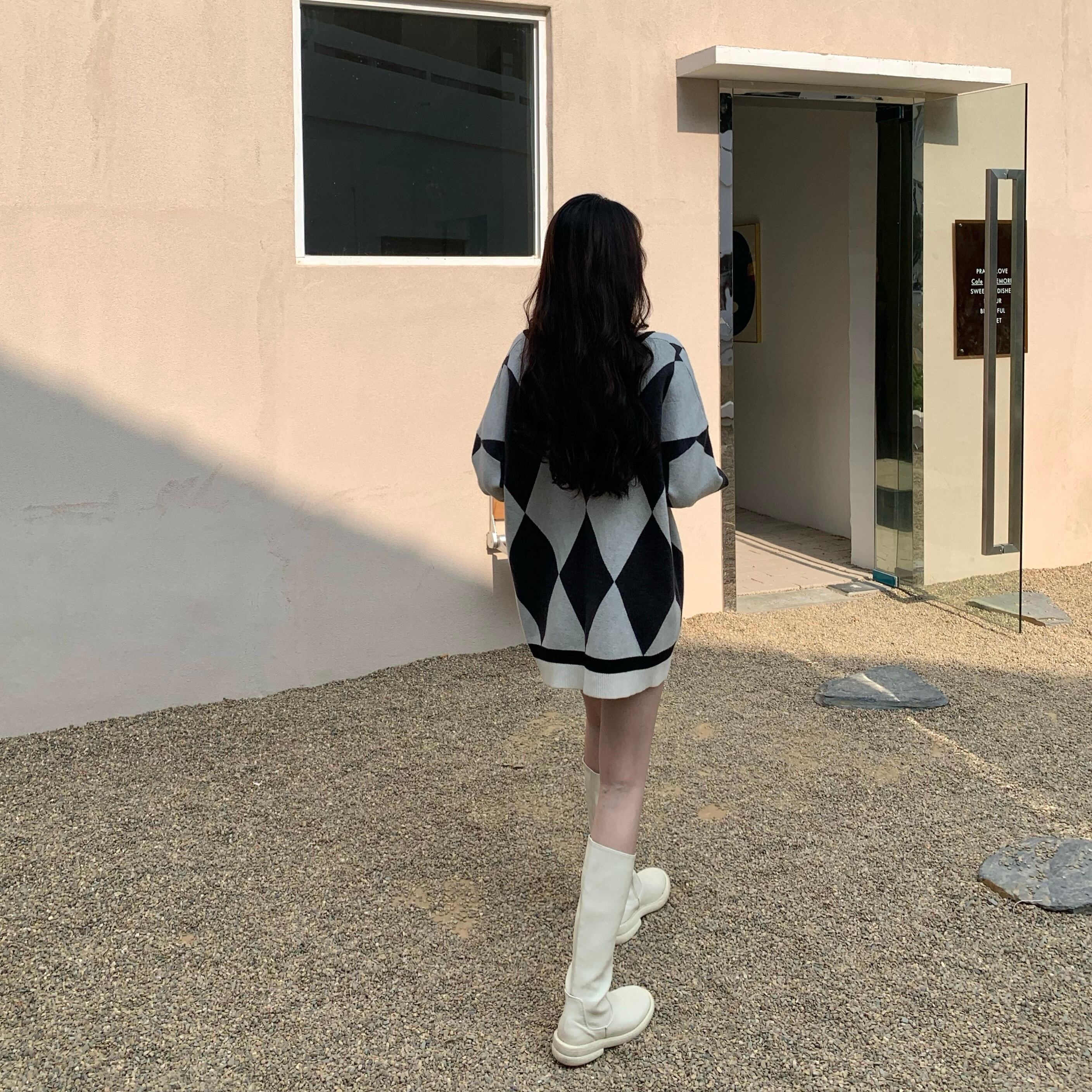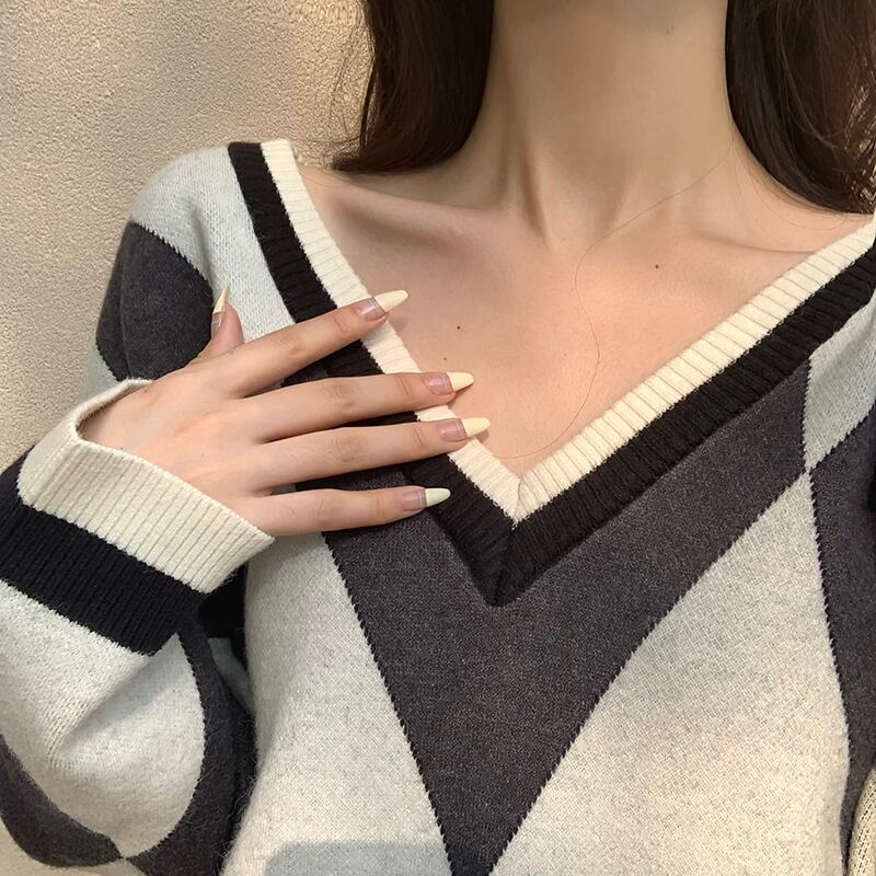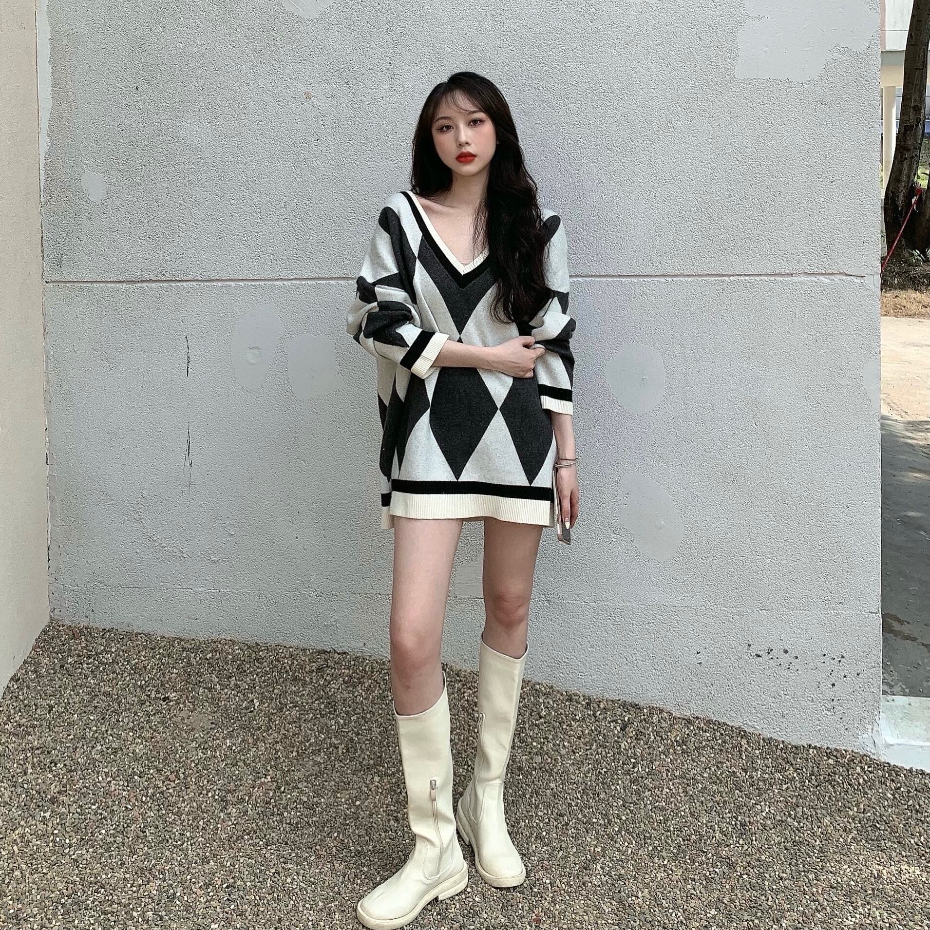 スタンダードスタイルセーター ロングオータムウィンタールーズVネックトップス レトロ 秋物 冬物 YY-ファッション81091978071