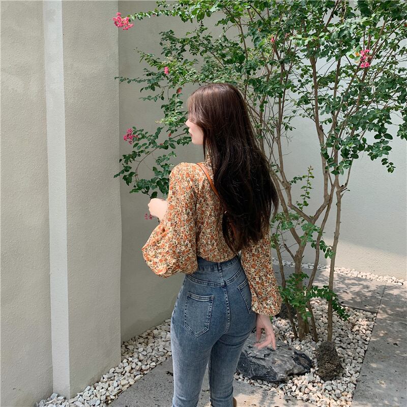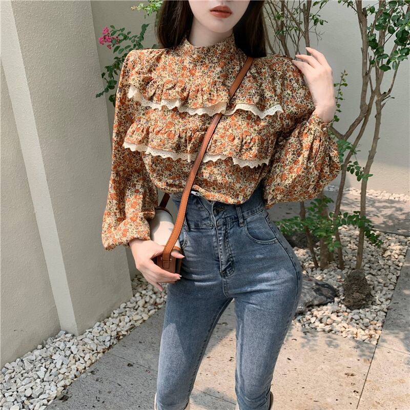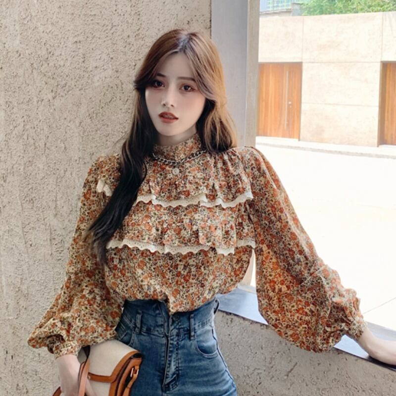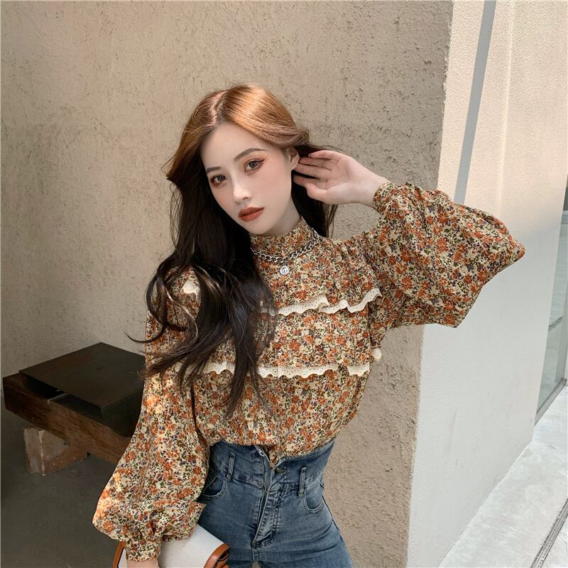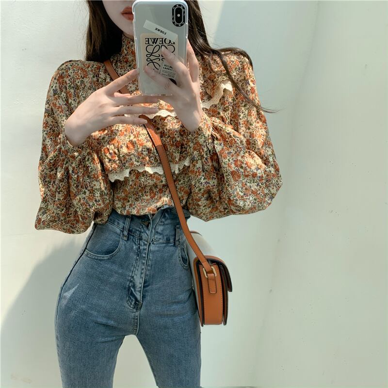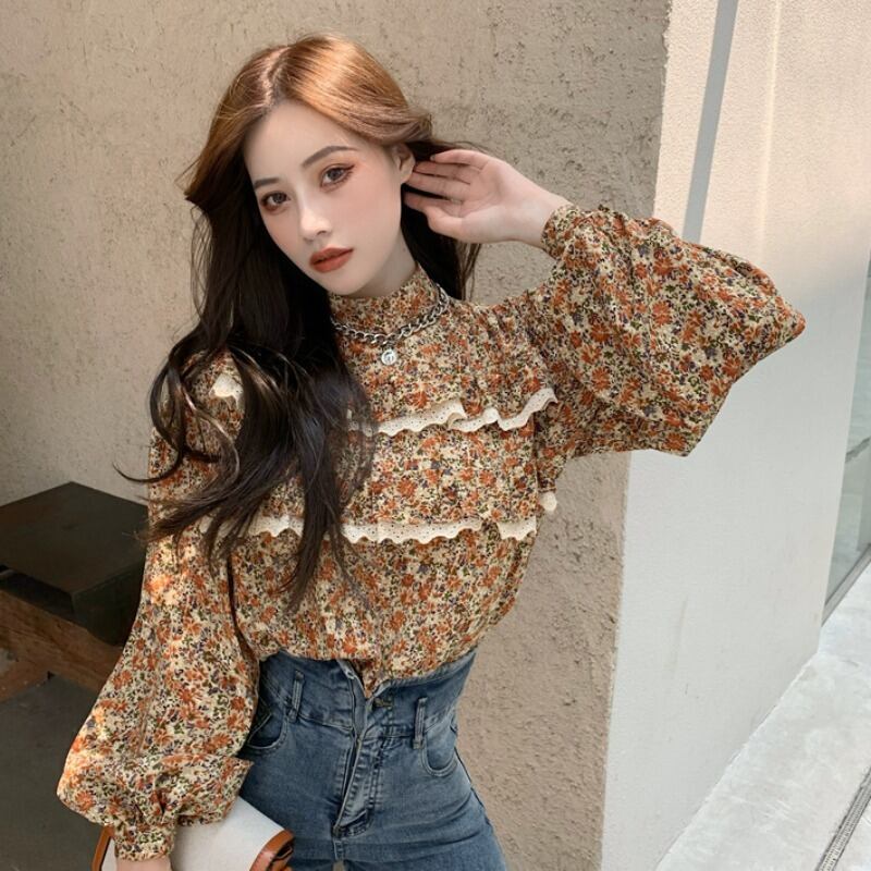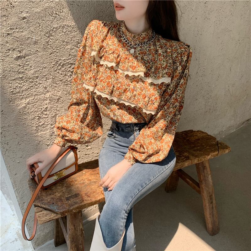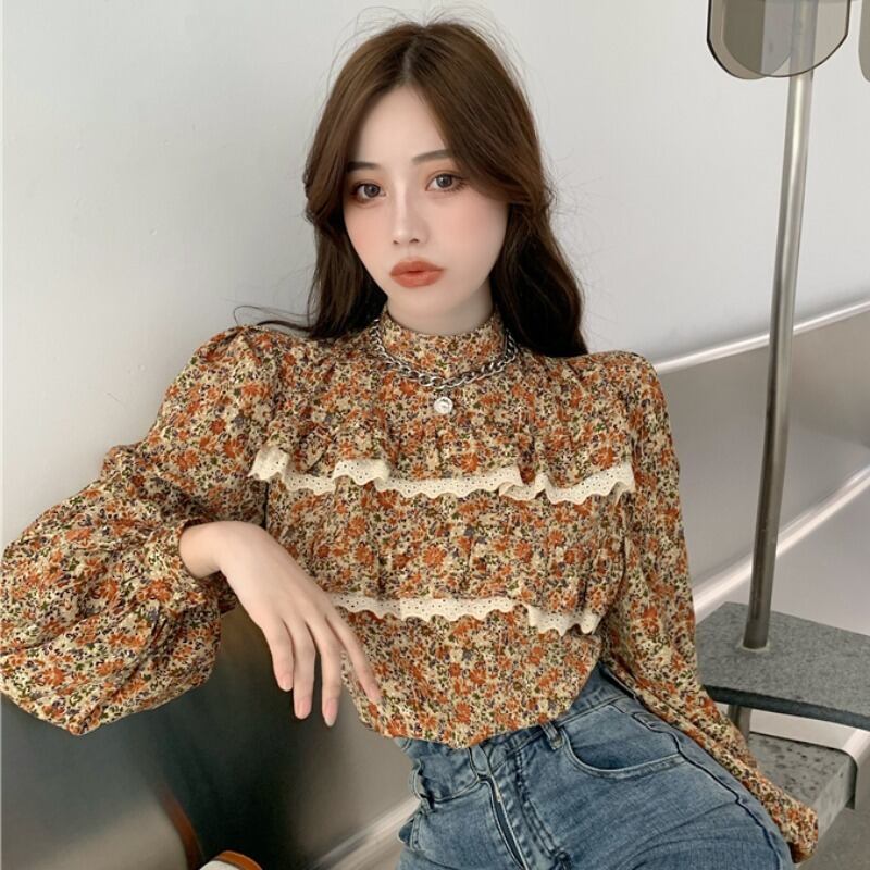 フローラルシャツ ロングスプリングスタイルルーズレーストップス 長袖 春物 花柄 ステッチ YY-ファッション64238325794