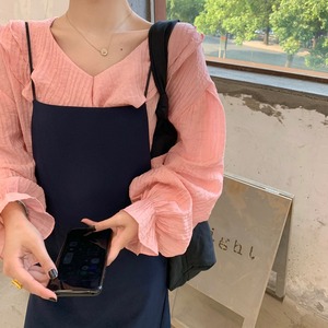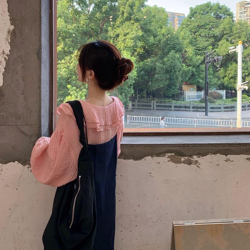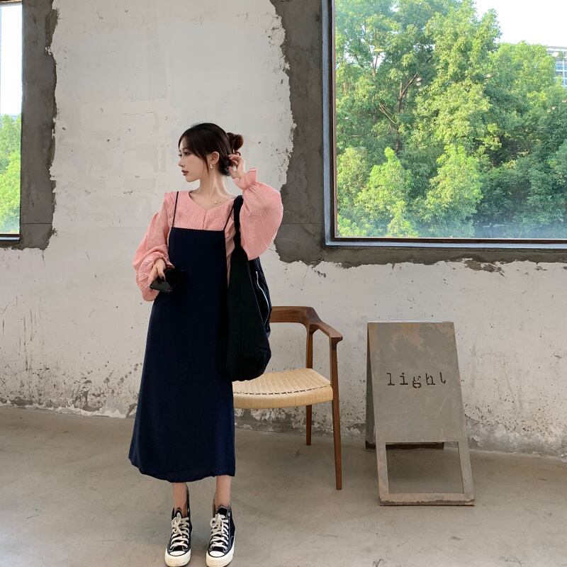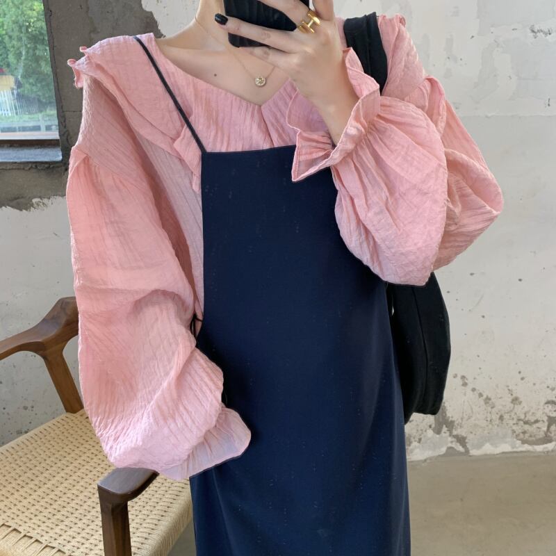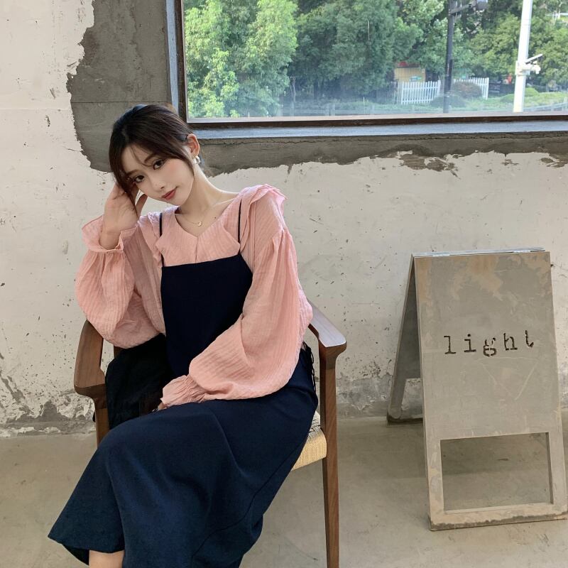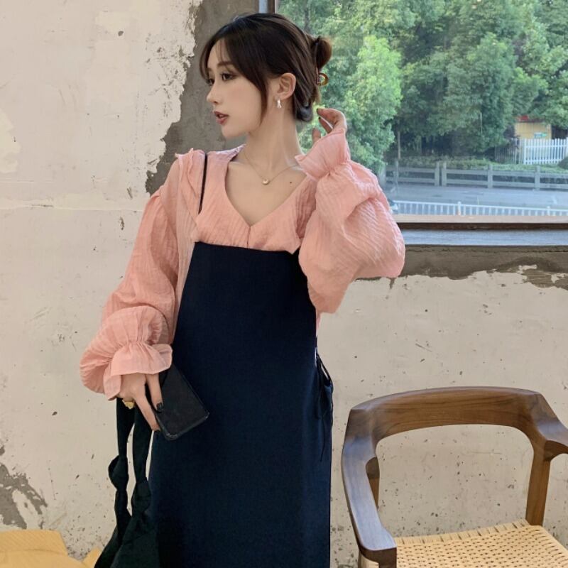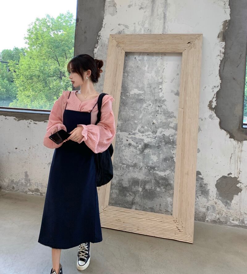 色:ピンクシフォンシャツ,ダークブルーのドレス