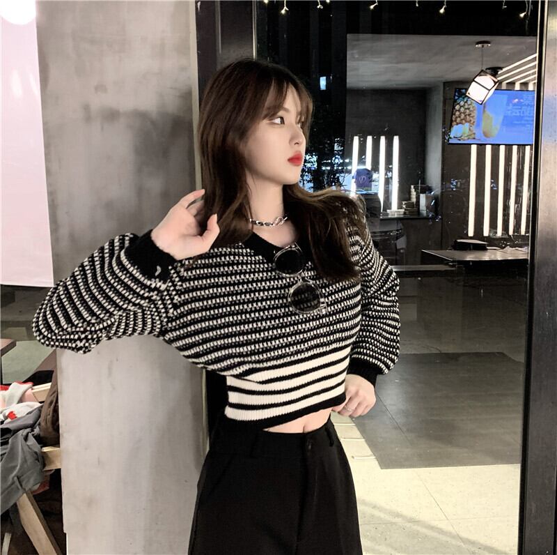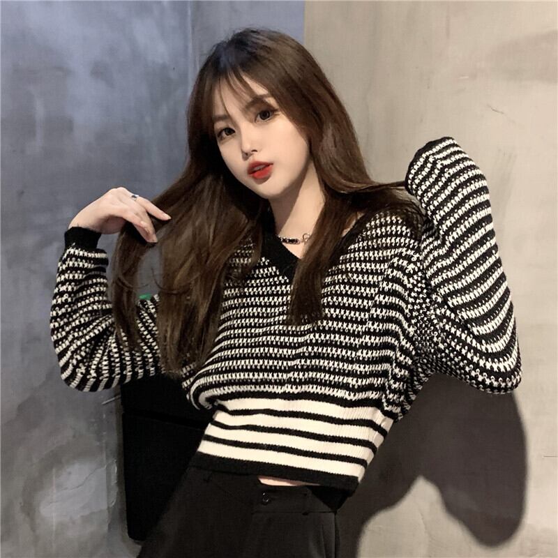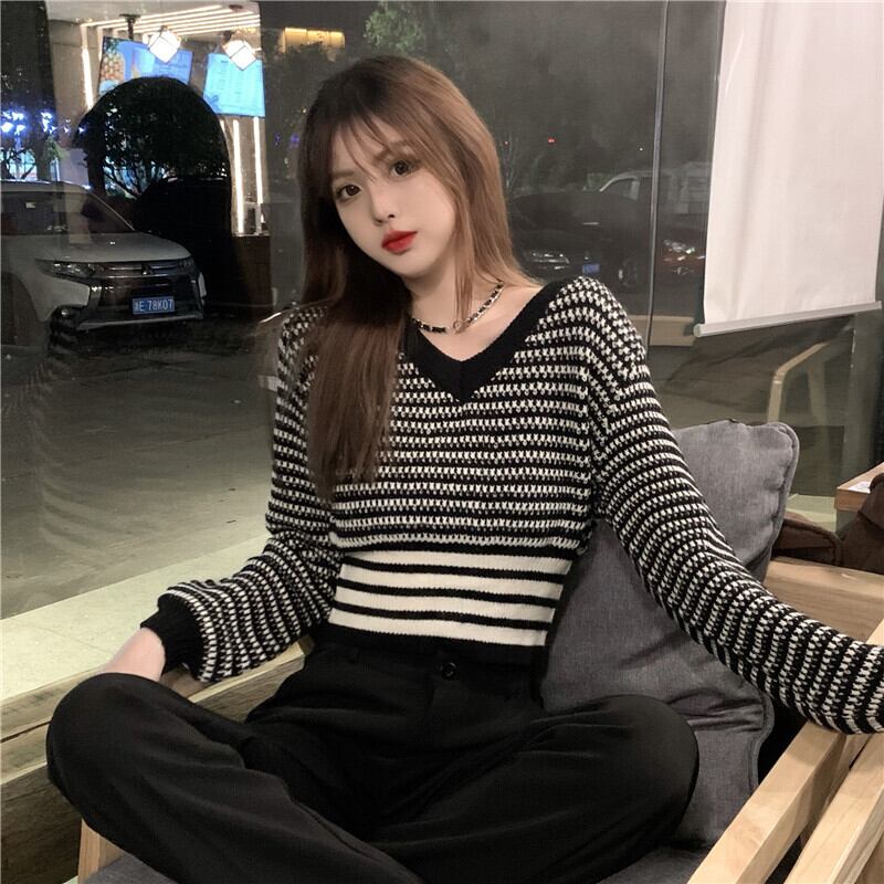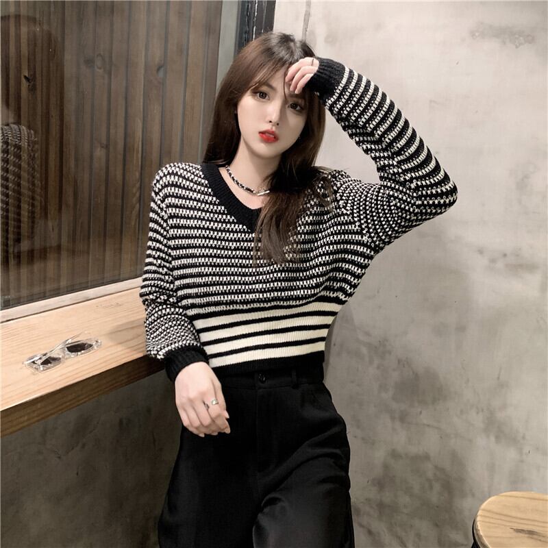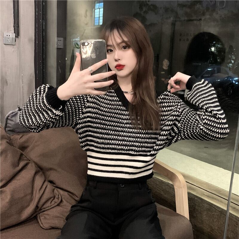 ショートVネックセーター レディースルーズオータムウィンターストライプハイウェストウェストトップス ロング 秋物 冬物 YY-ファッション32503062060