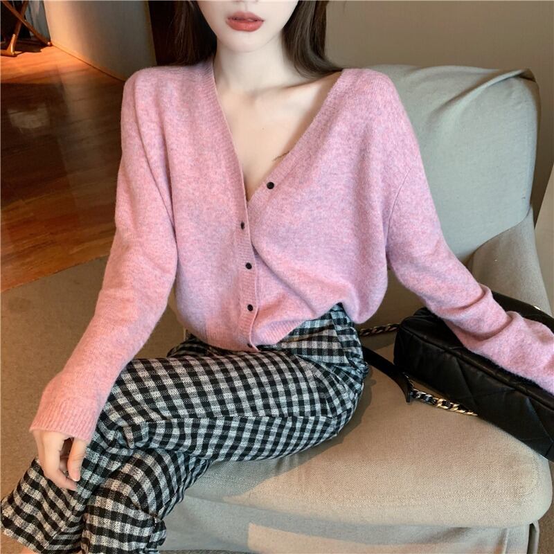 カーディガンセーター スタイルオータムウィンタールーズVネックトップス ピンク 秋物 冬物 YY-ファッション20887301037