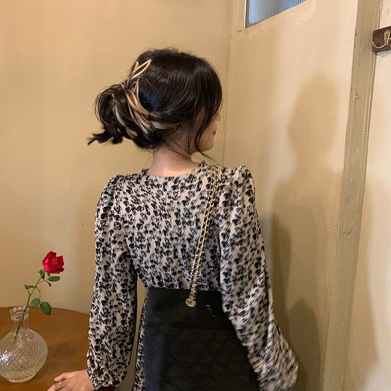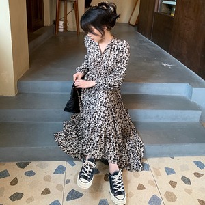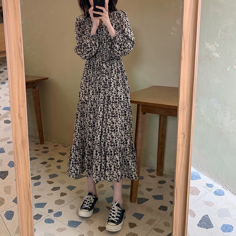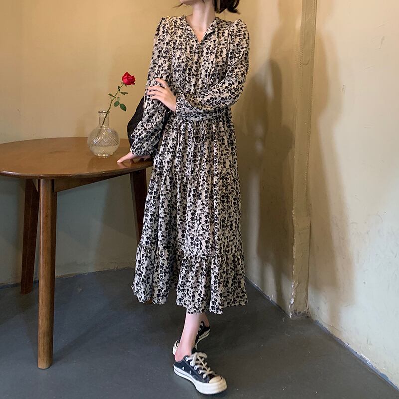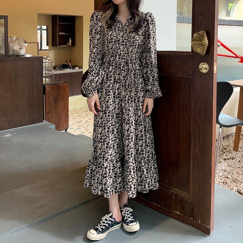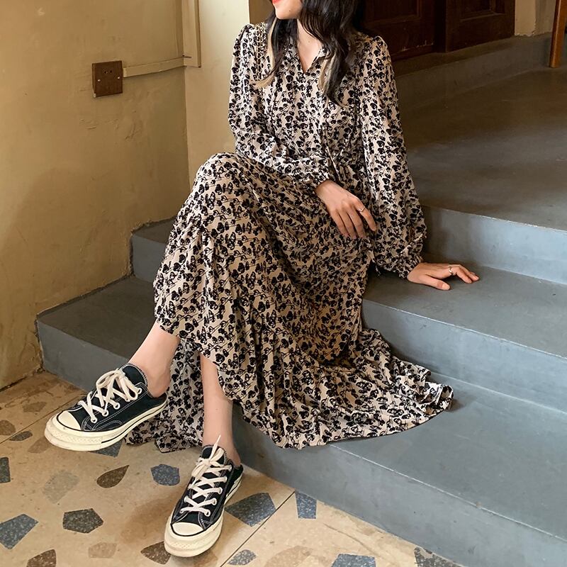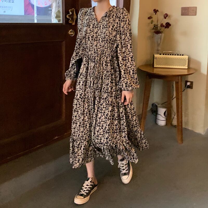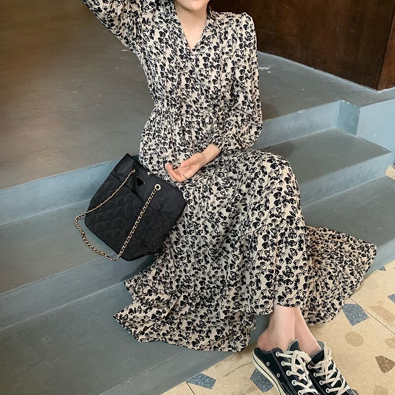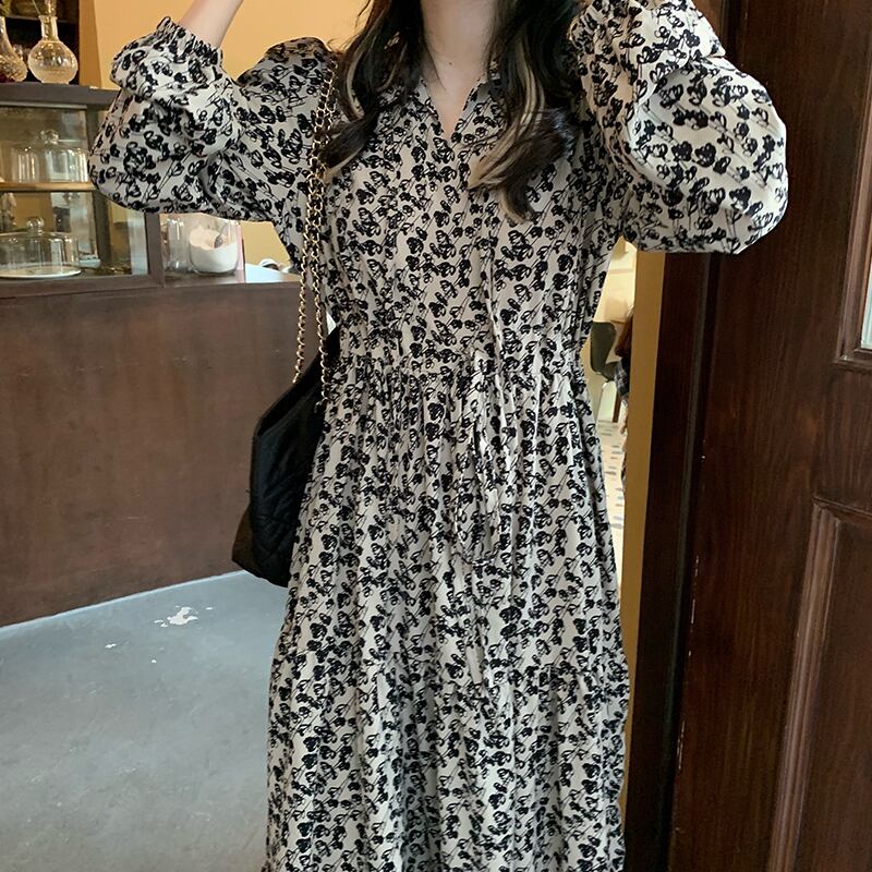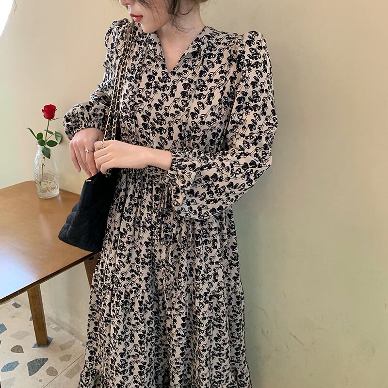 オータムスタイルスタンダードAラインスカート Vネックシフォンフローラルドレス レトロ 秋物 花柄 YY-ファッション23539580239