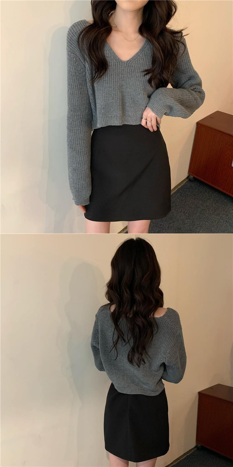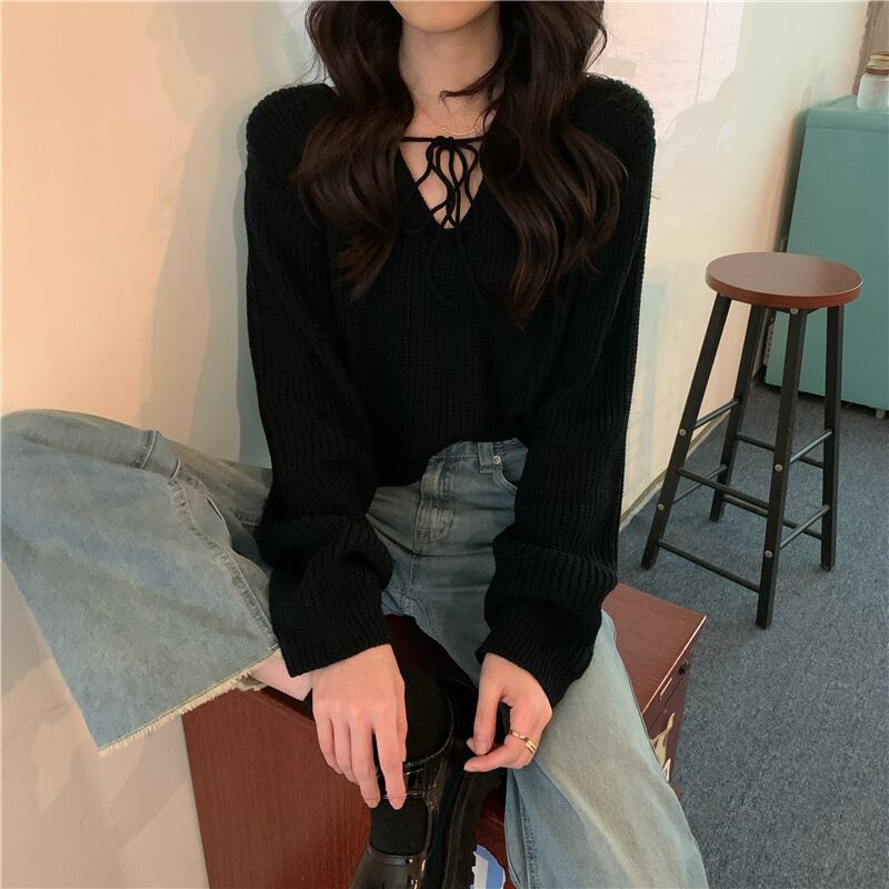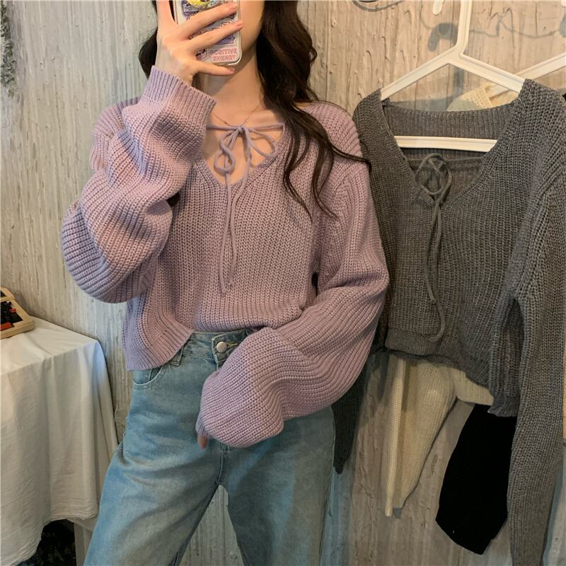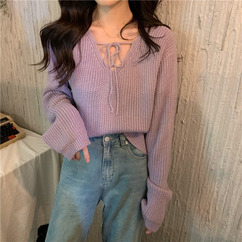 Vネックショートセーター レディースオータムウィンタールーズトップス ロング 秋物 冬物 YY-ファッション98680366418
