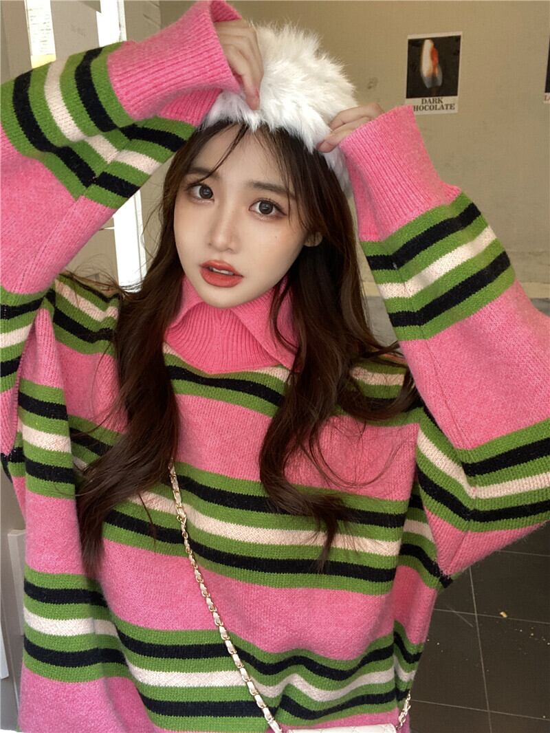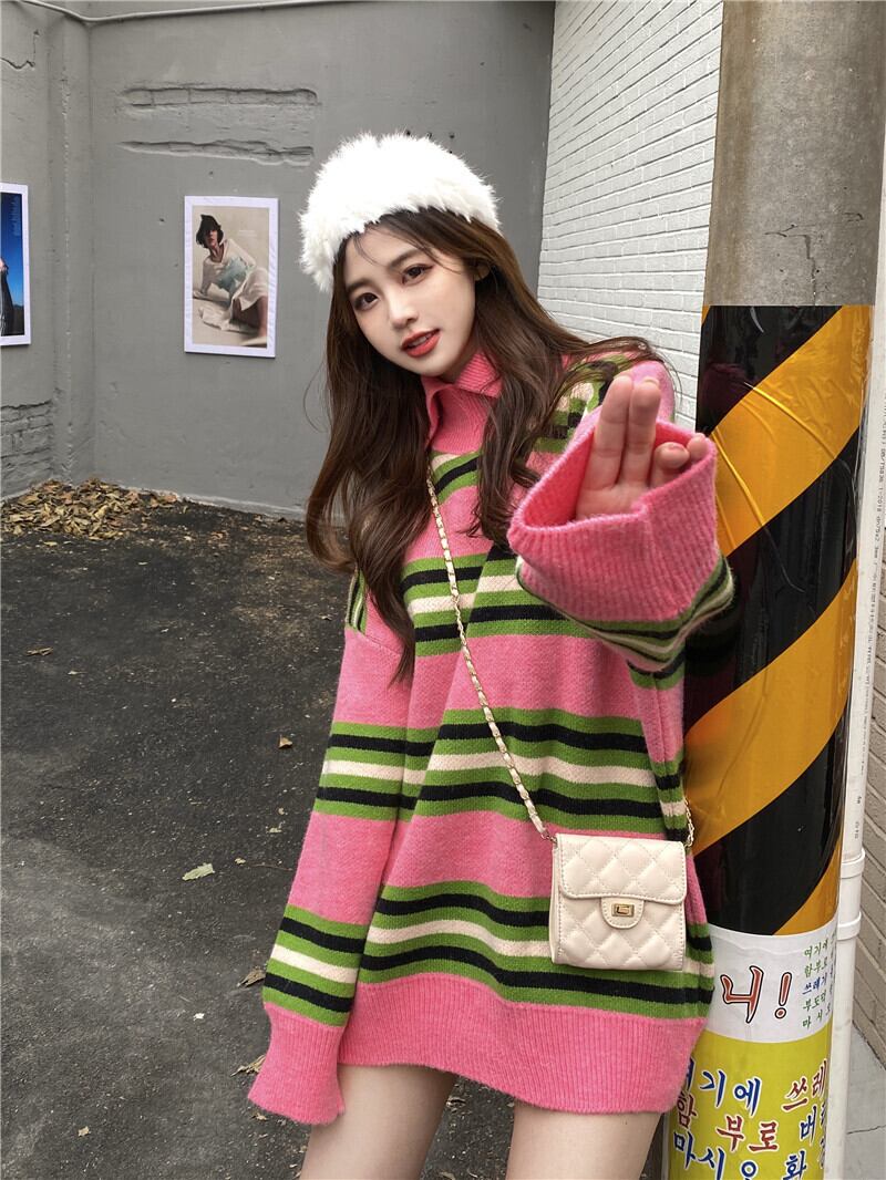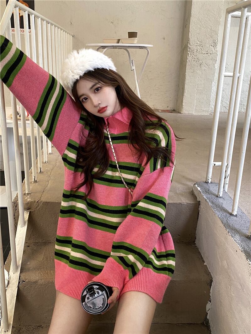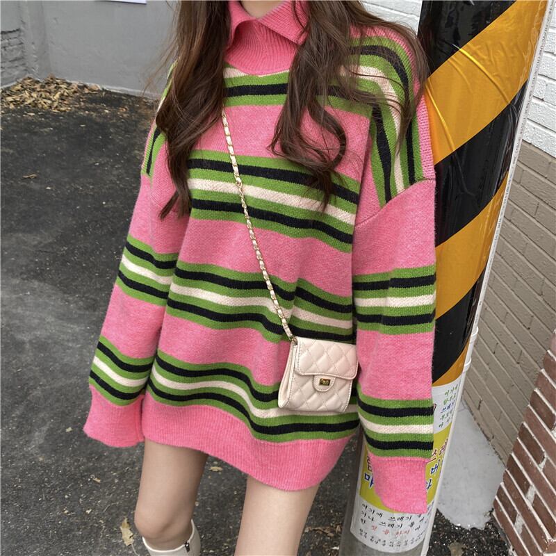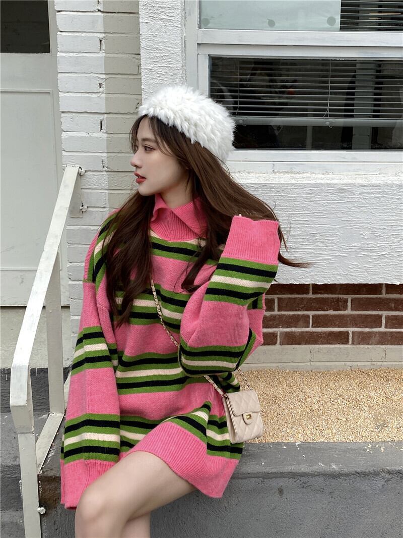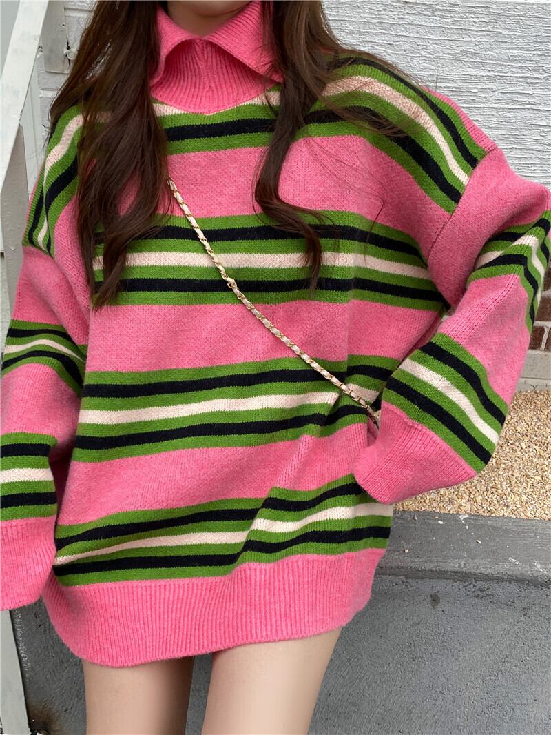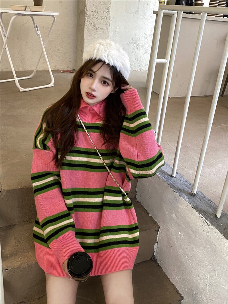 セーター レディースルーズスタンダードカラーストライプロングオータムウィンタートップス コート レトロ 秋物 冬物 YY-ファッション89605829491