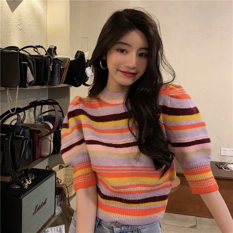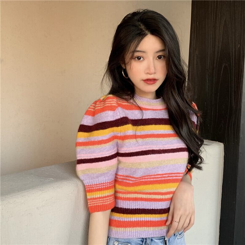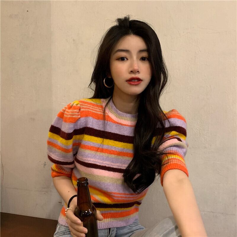 スタンダードカラーストライプセーター スプリングルーズショートスリーブ レトロ 半袖 ハーフスリーブ 春物 YY-ファッション64297539166