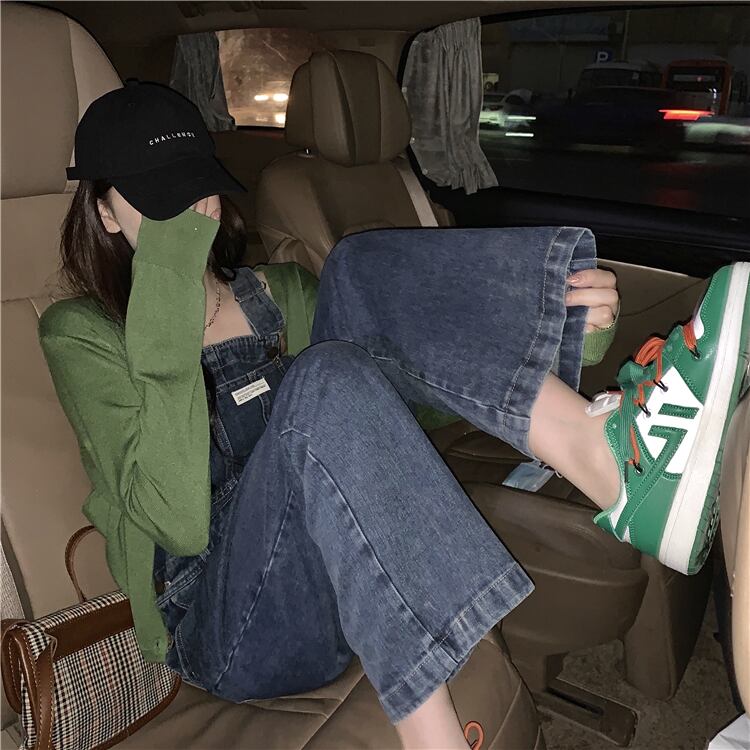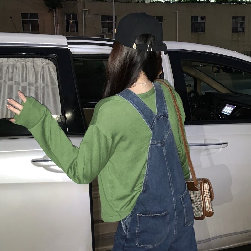 色:アボカドグリーンカーディガン,ダークブルーのよだれかけパンツ,水色のオーバーオール