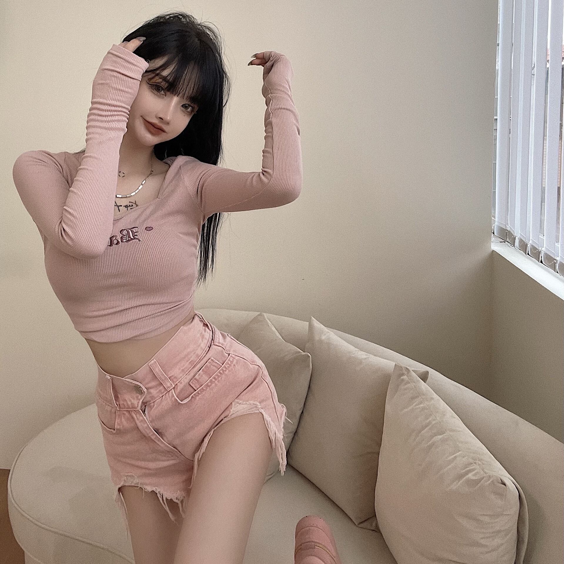 サマースタイルスリムハイウェストウェストショーツ カラー刺繍Tシャツ レディース ロング ピンク 夏物 ブルマー スクウェア YY-ファッション44914459398