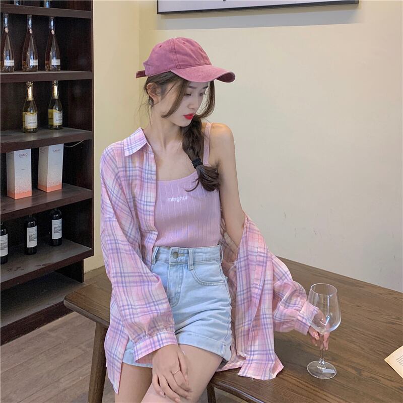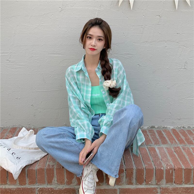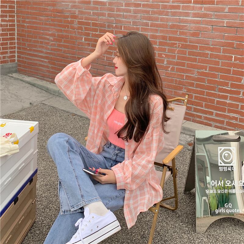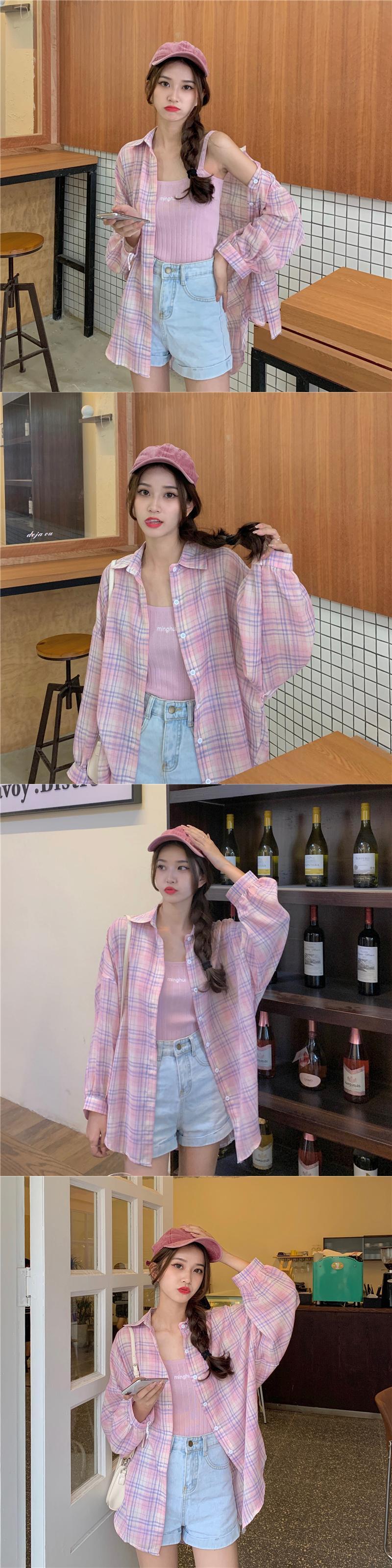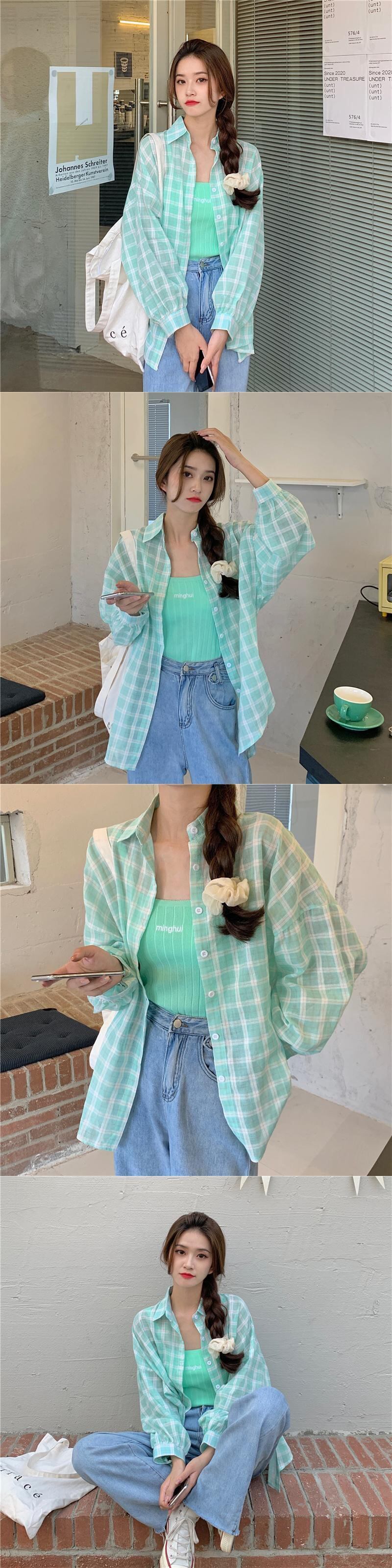 スプリングオータム薄手シャツ 格子柄トップス レディース ロング 春物 秋物 YY-ファッション26648372473