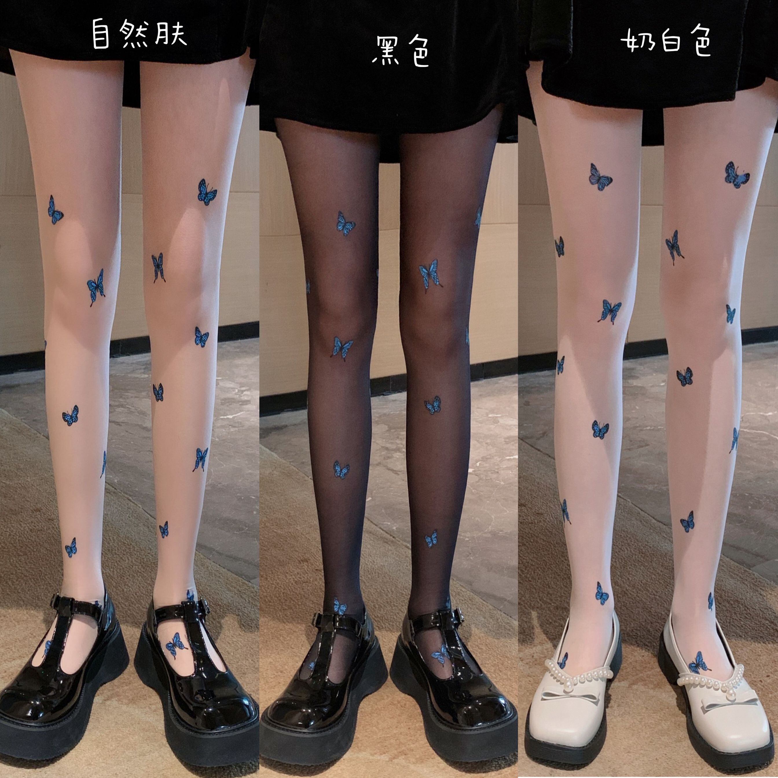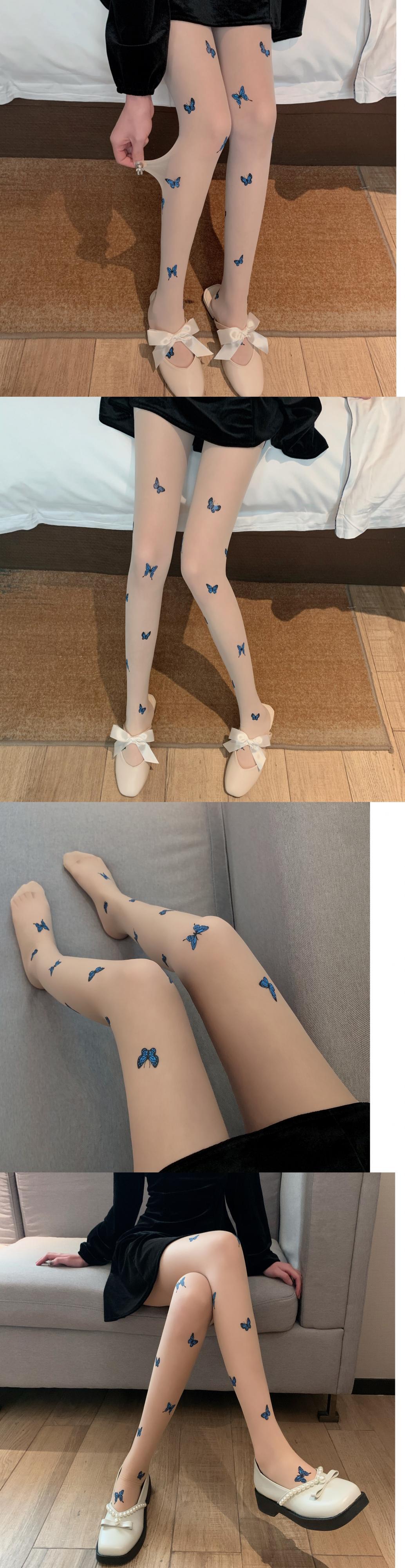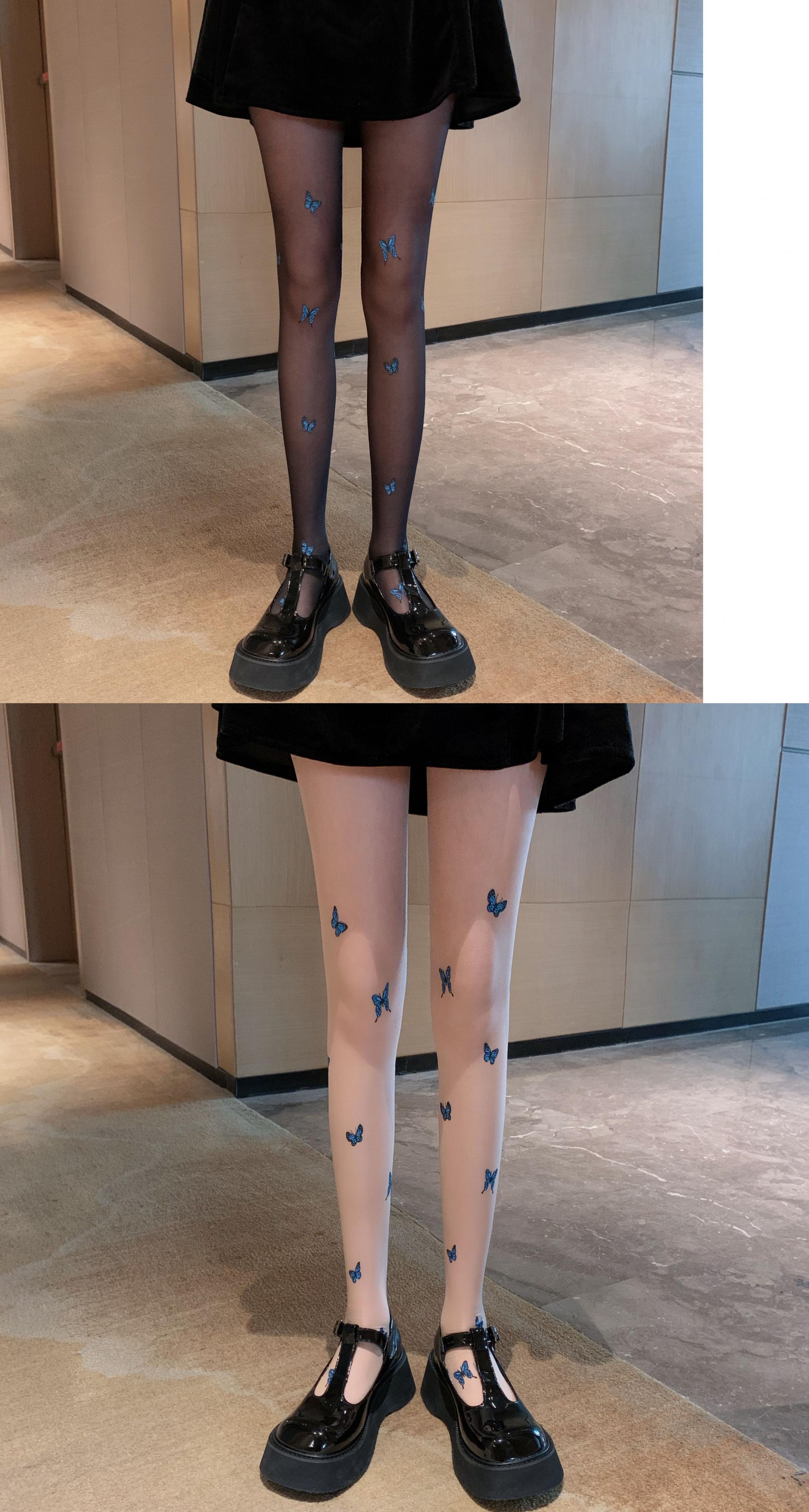 スプリングサマーレッド薄手ブルーButterflyデザイン プリント柄ストッキング レースレディース 春物 夏物 タイツ ソックス シルク YY-ファッション16895318017