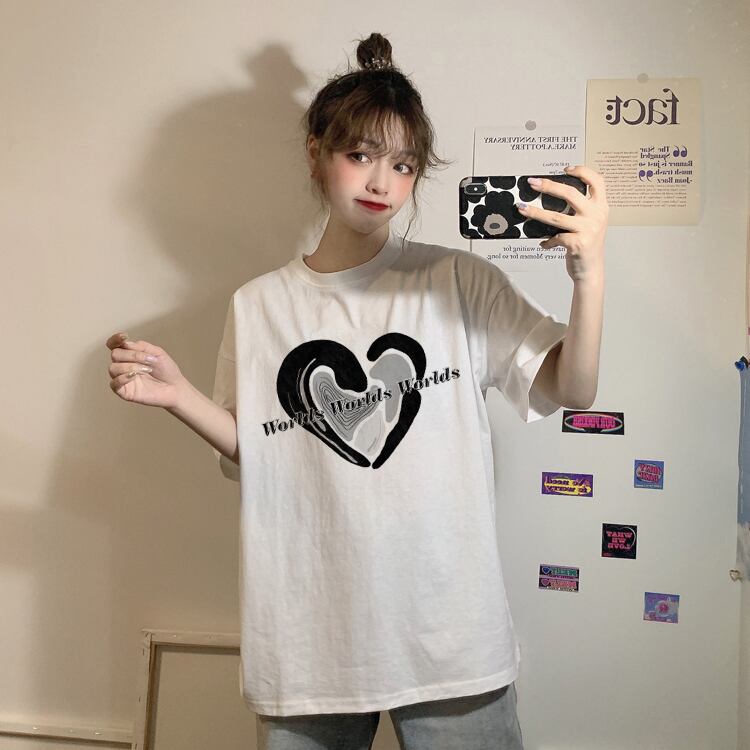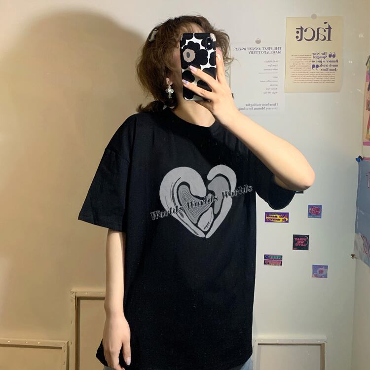 プリント柄ブラックTシャツ レディースサマールーズ薄手カジュアルトップス 夏物 YY-ファッション87740680968