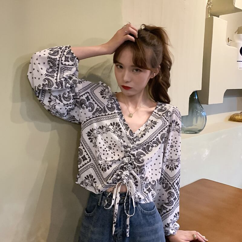 スタンダードギャザーVネックフローラルシャツ スプリングハイウェストウェストクロップドトップス レトロ 春物 花柄 YY-ファッション87353693848