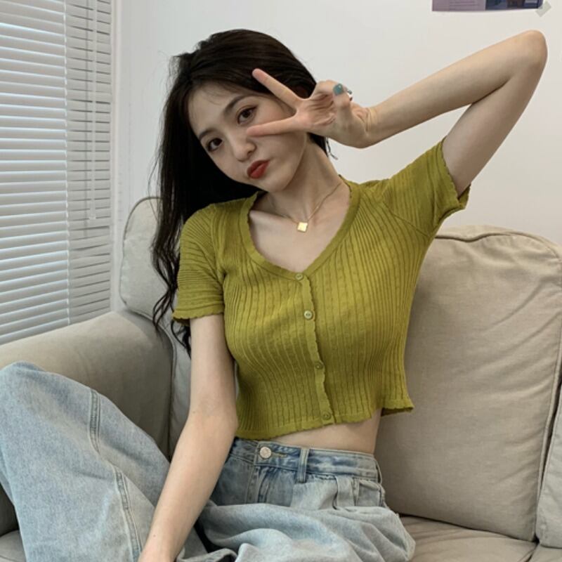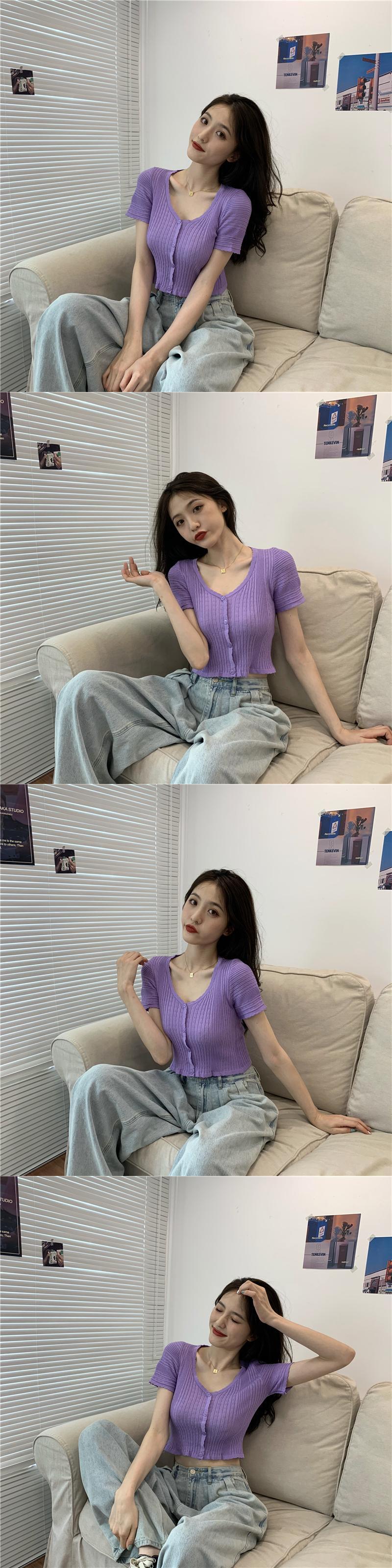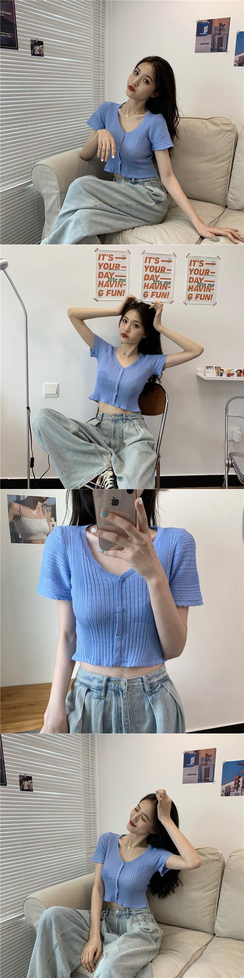 クロップドトップス スプリングサマーレッドスタイルVネックニットシャツ ハイウェストウェストショート 半袖 ハーフスリーブ 春物 夏物 シルク YY-ファッション92552932102