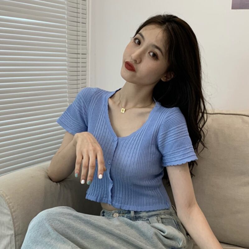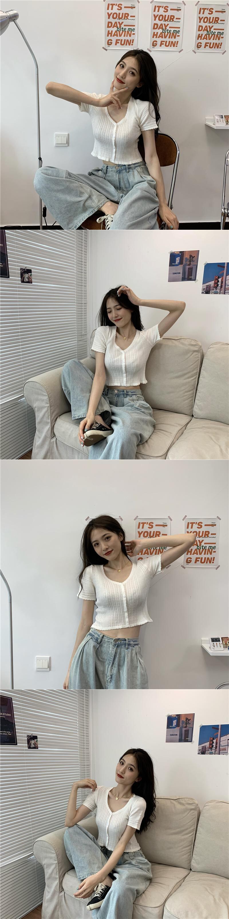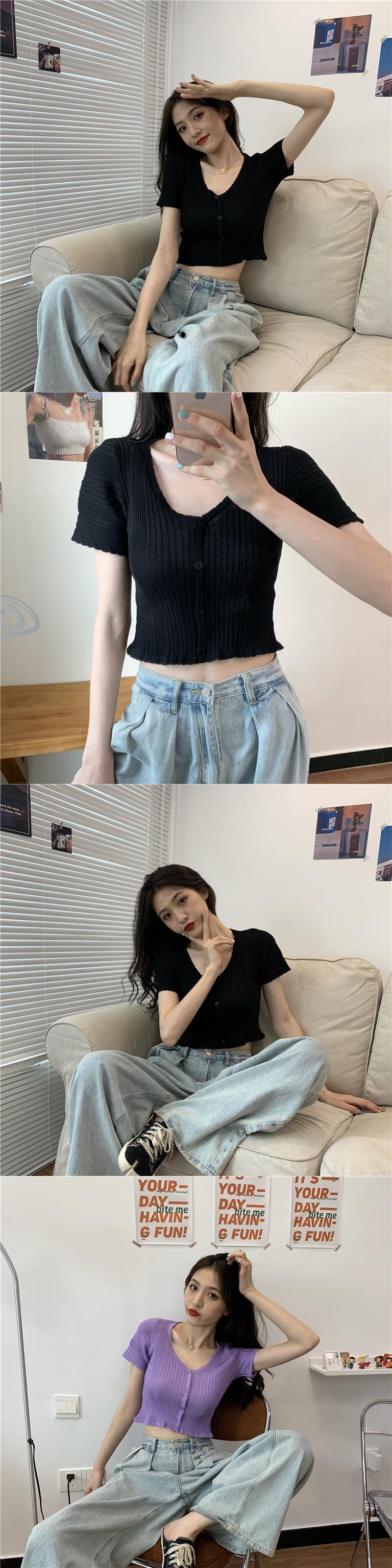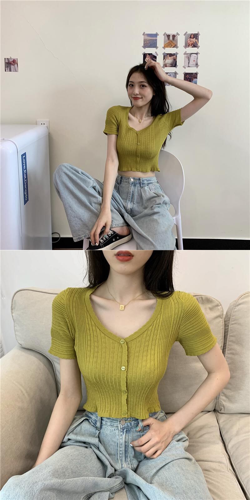 クロップドトップス スプリングサマーレッドスタイルVネックニットシャツ ハイウェストウェストショート 半袖 ハーフスリーブ 春物 夏物 シルク YY-ファッション92552932102