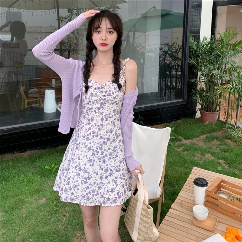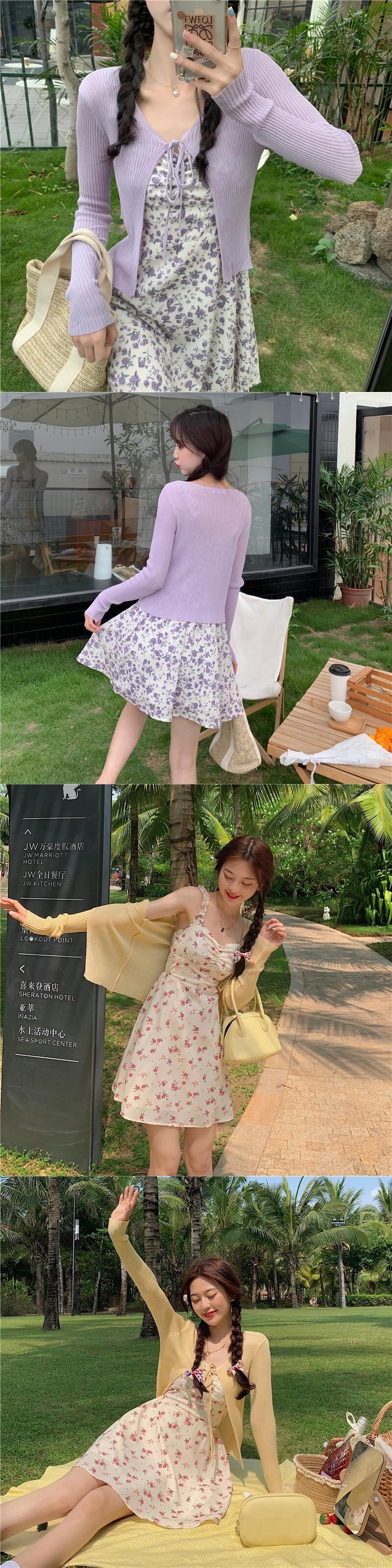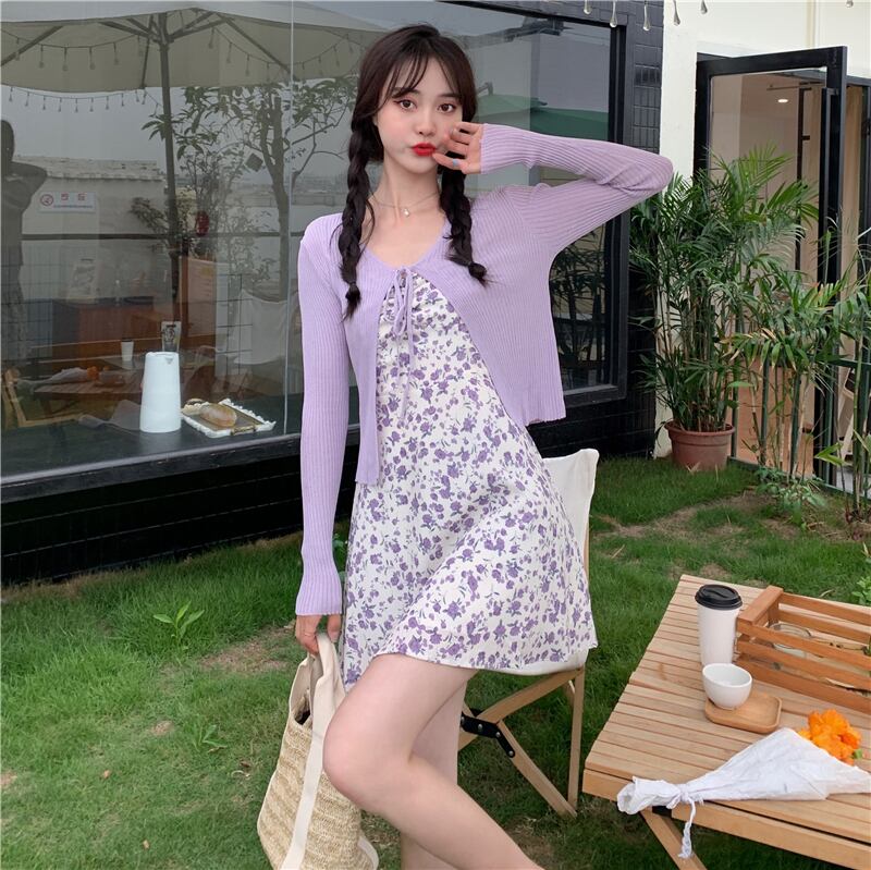色:パープルカーディガン,黄色のカーディガン,パープルホルタードレス,黄色のサスペンダースカート