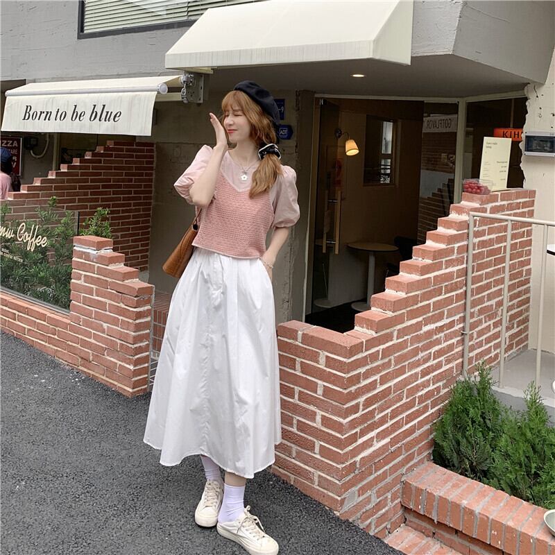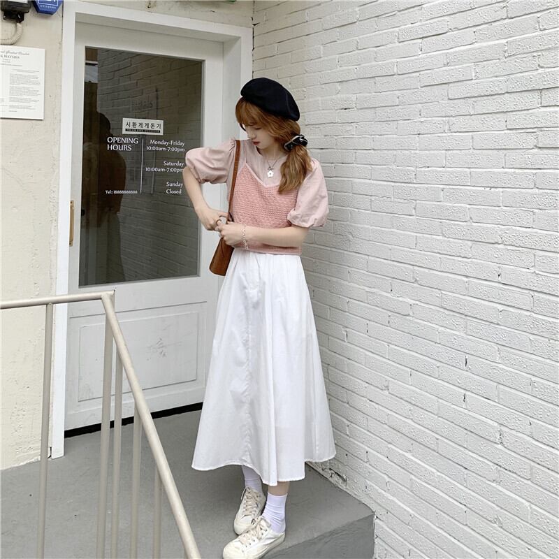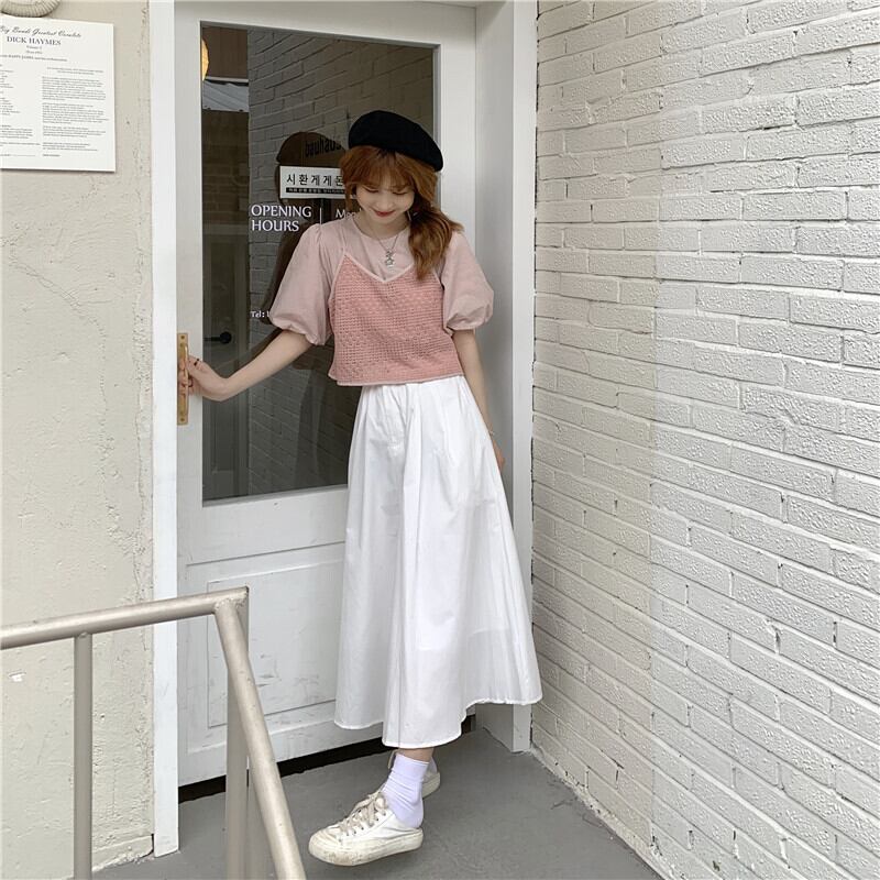 色:薄ピンクのシャツ,ピンクのサスペンダー,白いスカート