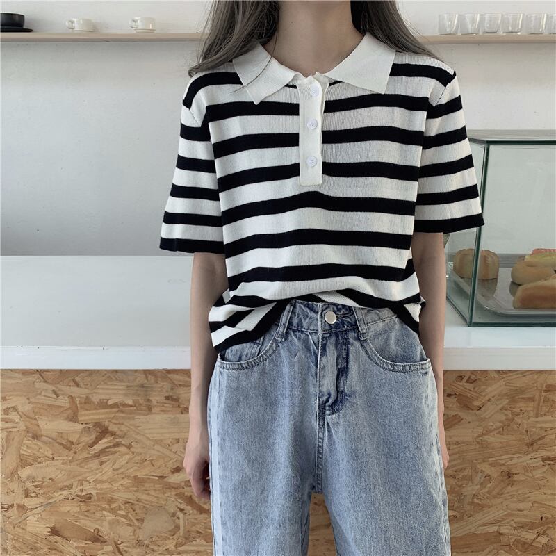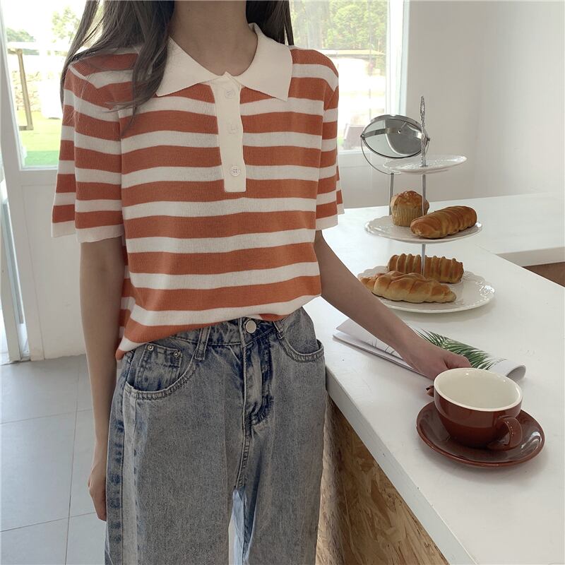 カラーストライプショートセーター レディースサマールーズTシャツ 夏物 YY-ファッション15963948955