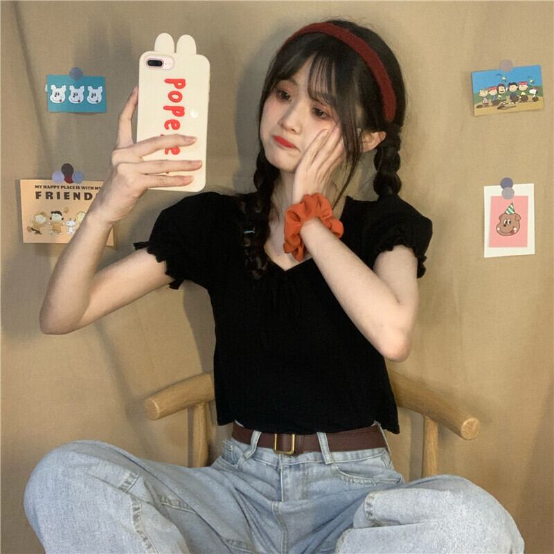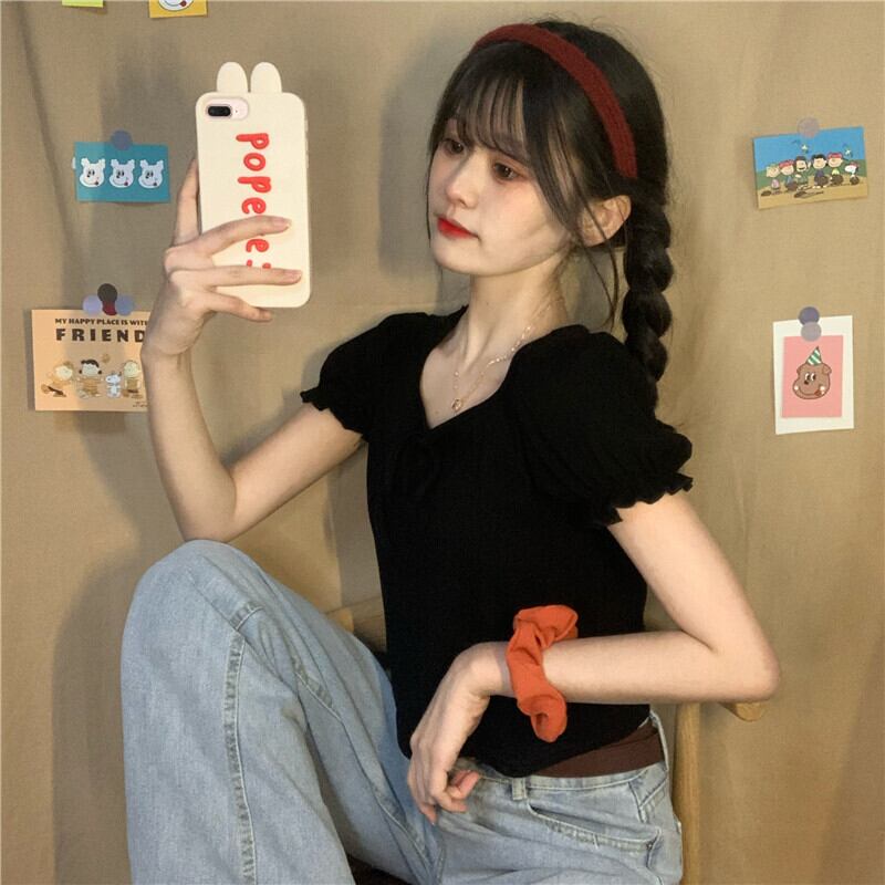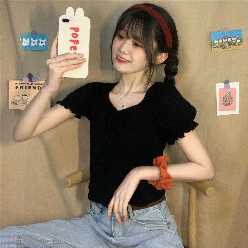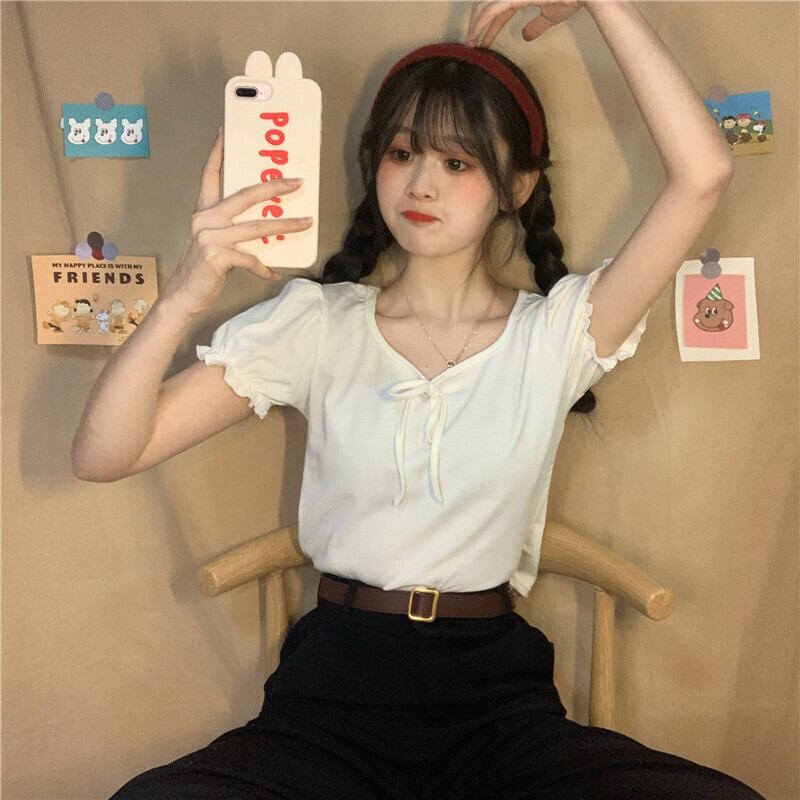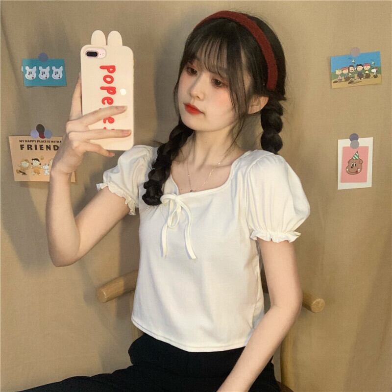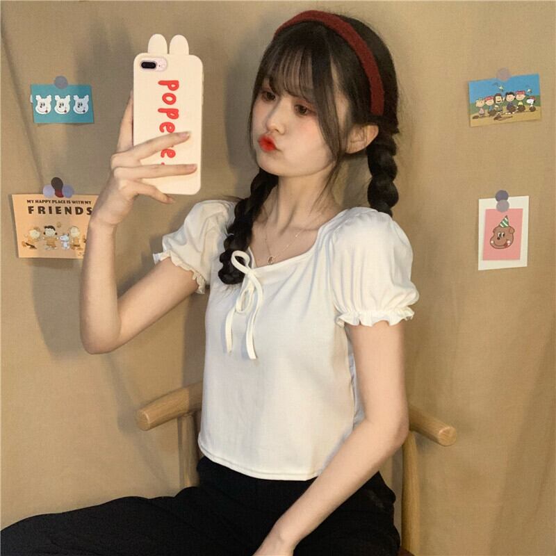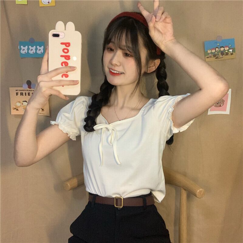 サマーリボンスリーブ半袖Tシャツ トップス ショート ハーフスリーブ 夏物 スクウェア YY-ファッション65605928560