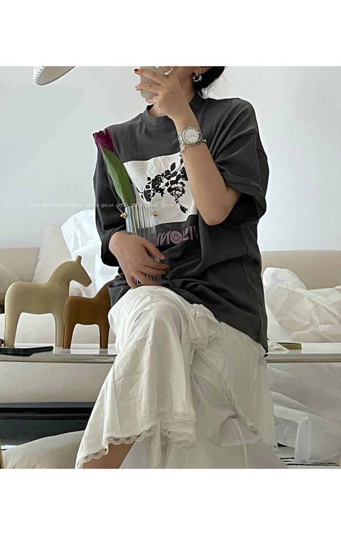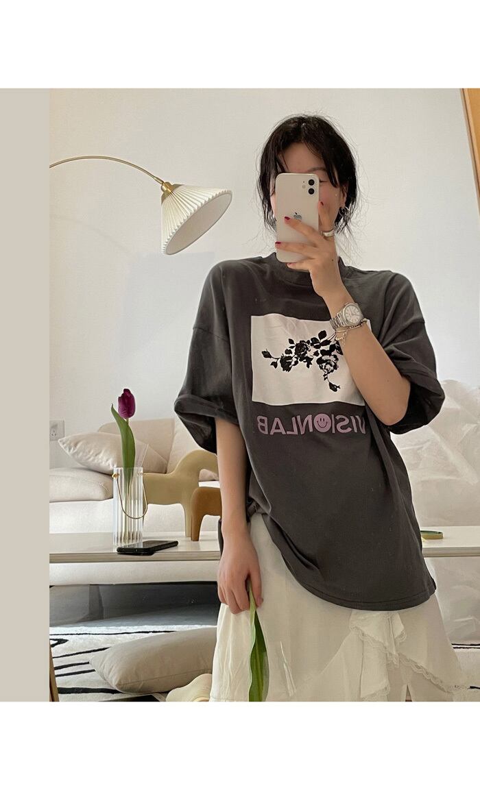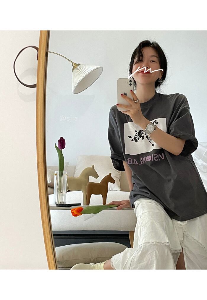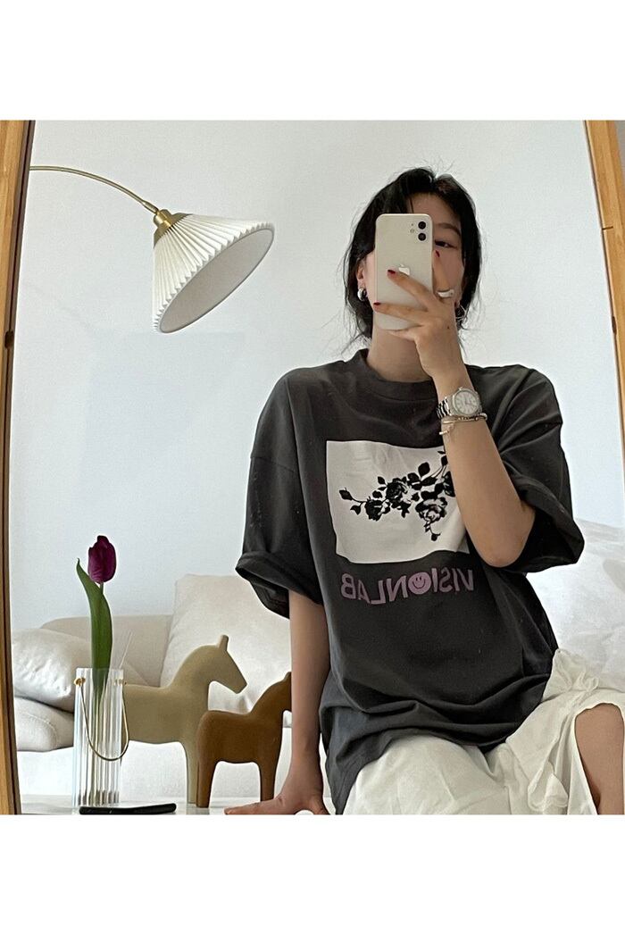 サマーFlowerデザイン ルーズグレーTシャツ トップス 夏物 フラワーデザイン YY-ファッション97530387522