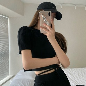 サマースタイルスリーブスリムショートトップス ハイウェストウェストスリット レッド 夏物 YY-ファッション12197867027