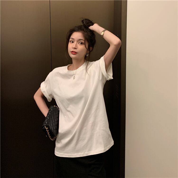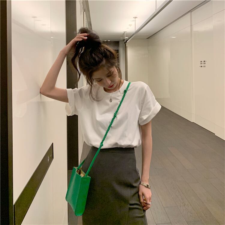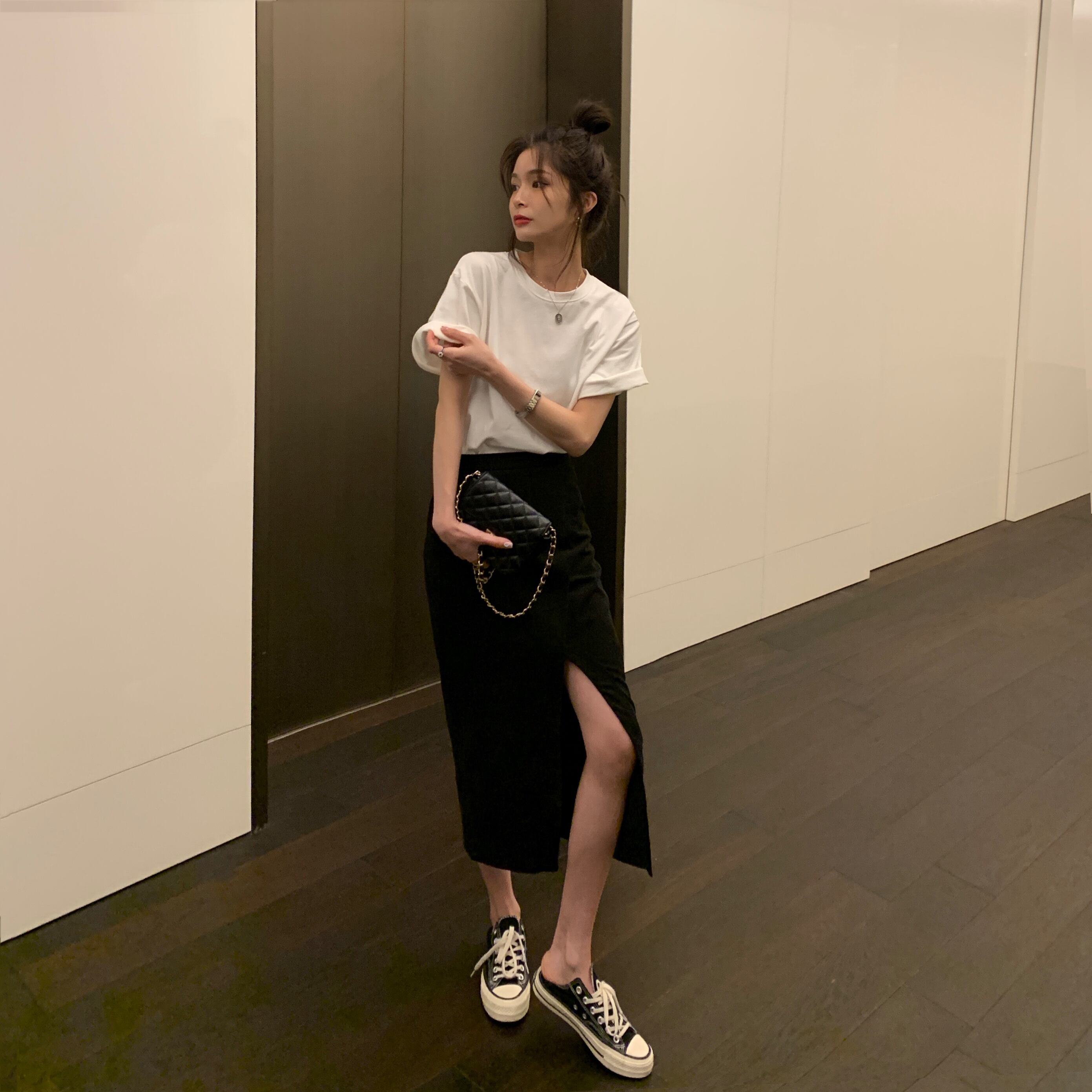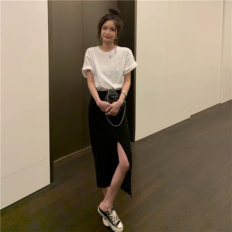 色:白いTシャツ,ダークグレーのスカート,黒スカート