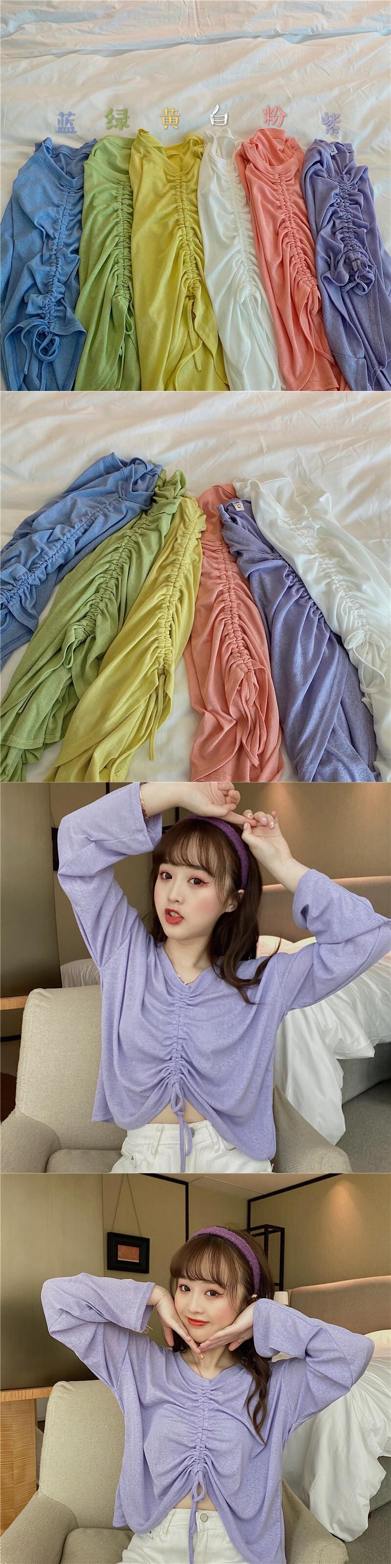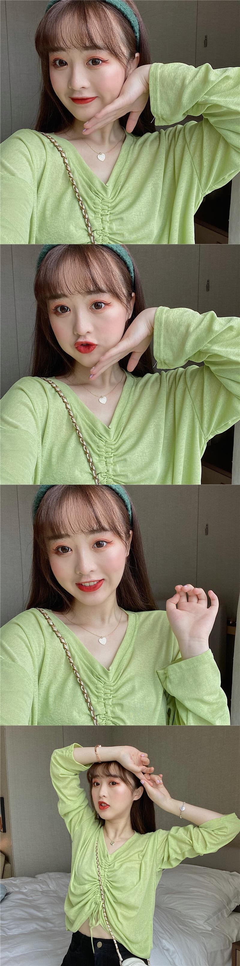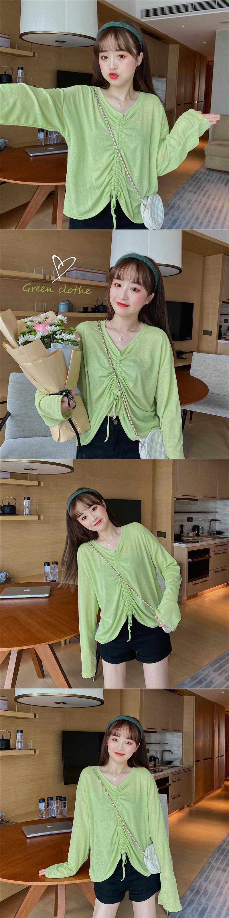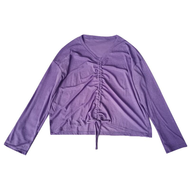 ウィンターオータムレッドギャザールーズVネックトップス 薄手Tシャツ レディース 秋物 冬物 YY-ファッション79311778871
