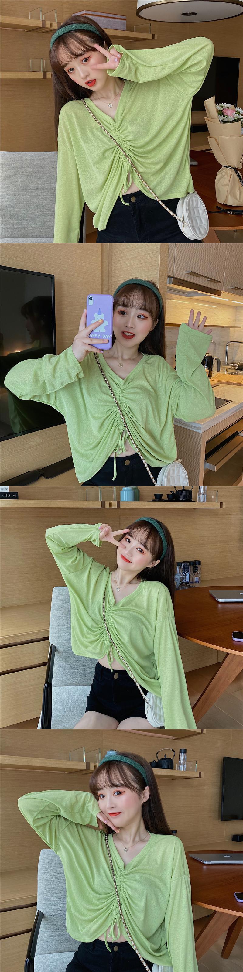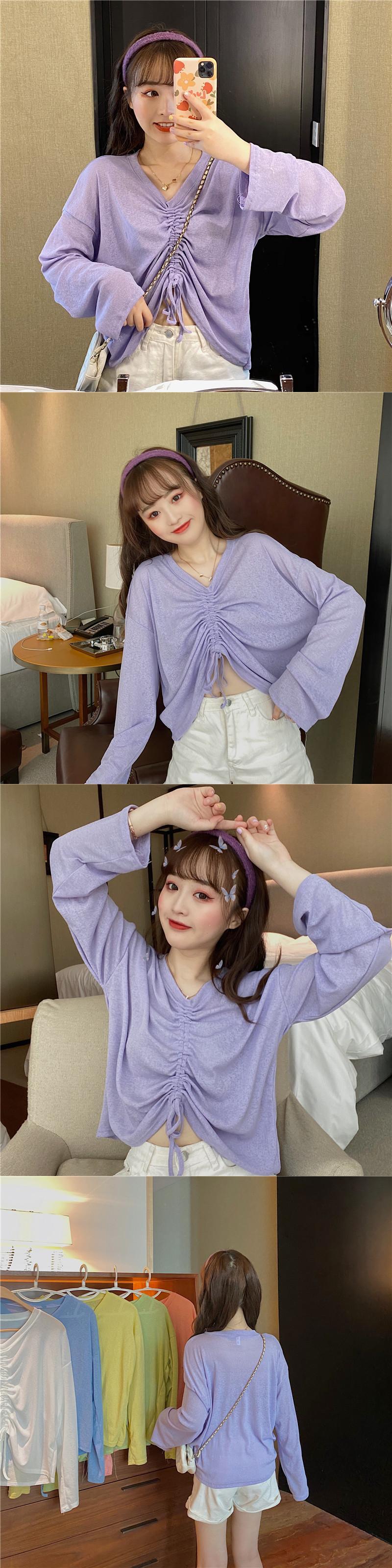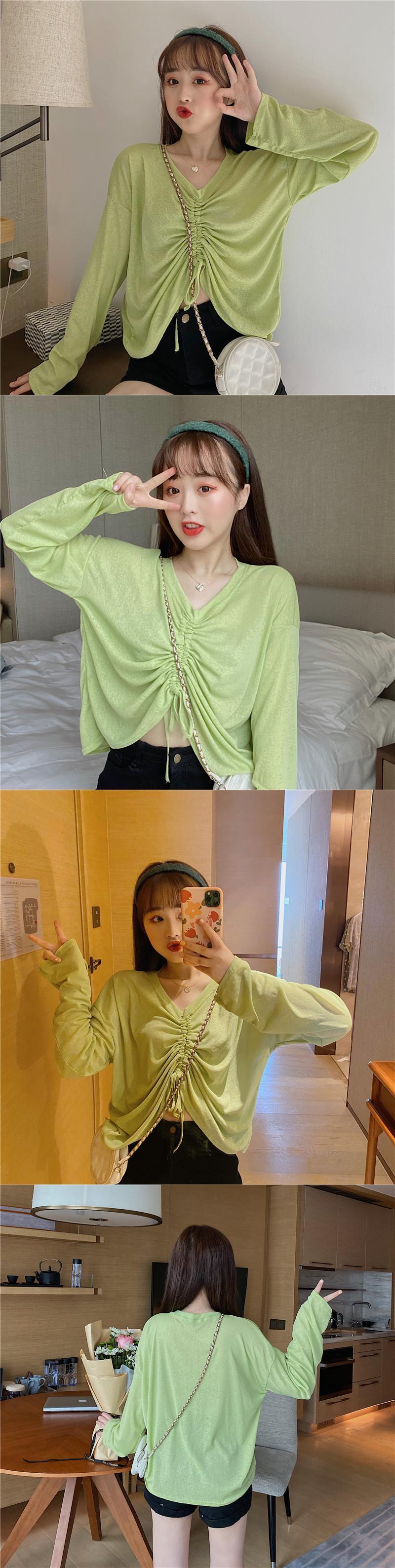 ウィンターオータムレッドギャザールーズVネックトップス 薄手Tシャツ レディース 秋物 冬物 YY-ファッション79311778871