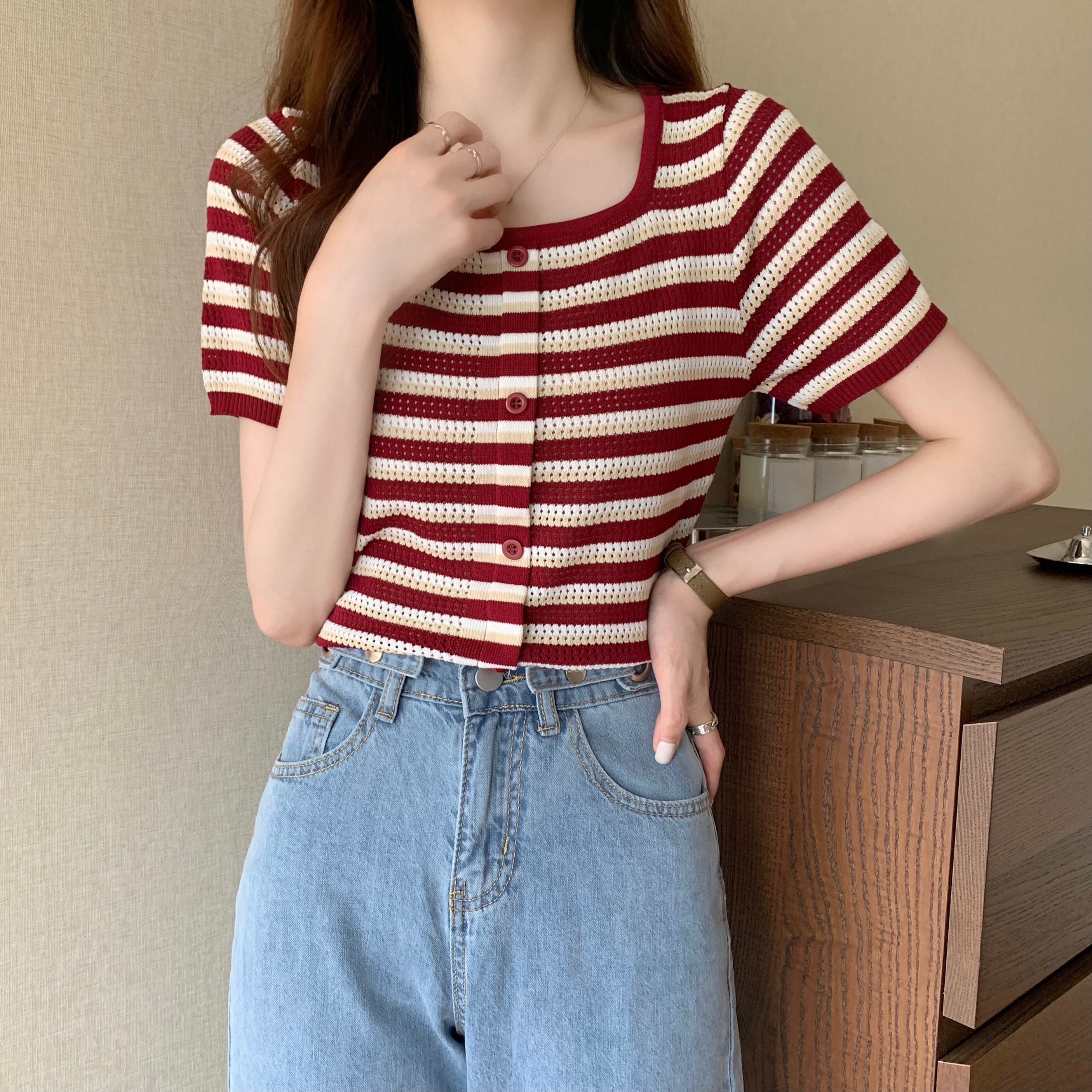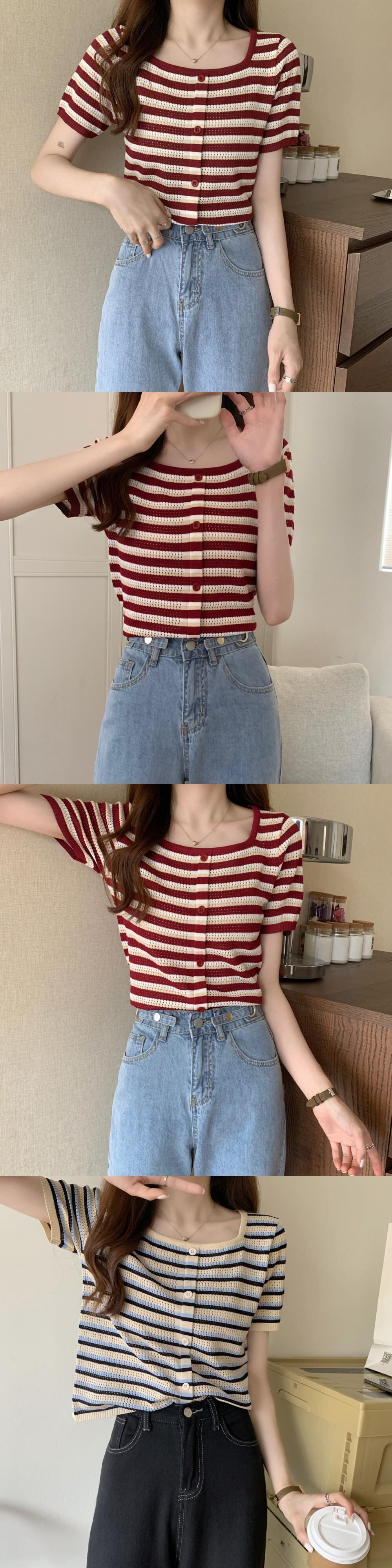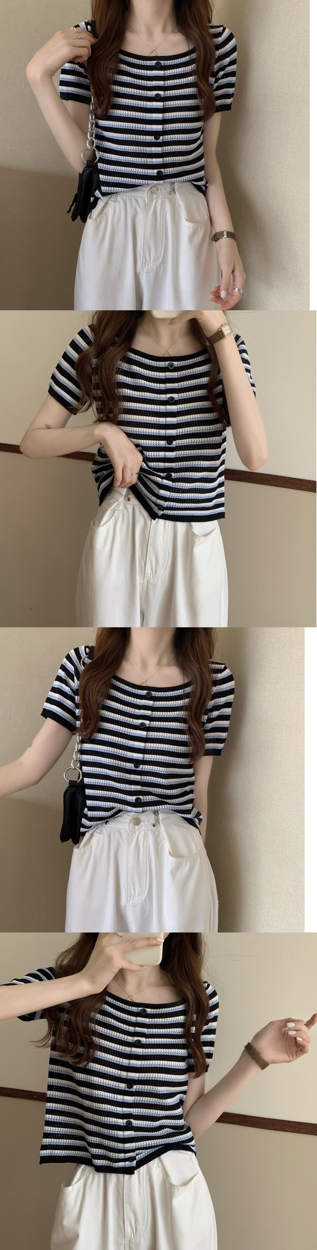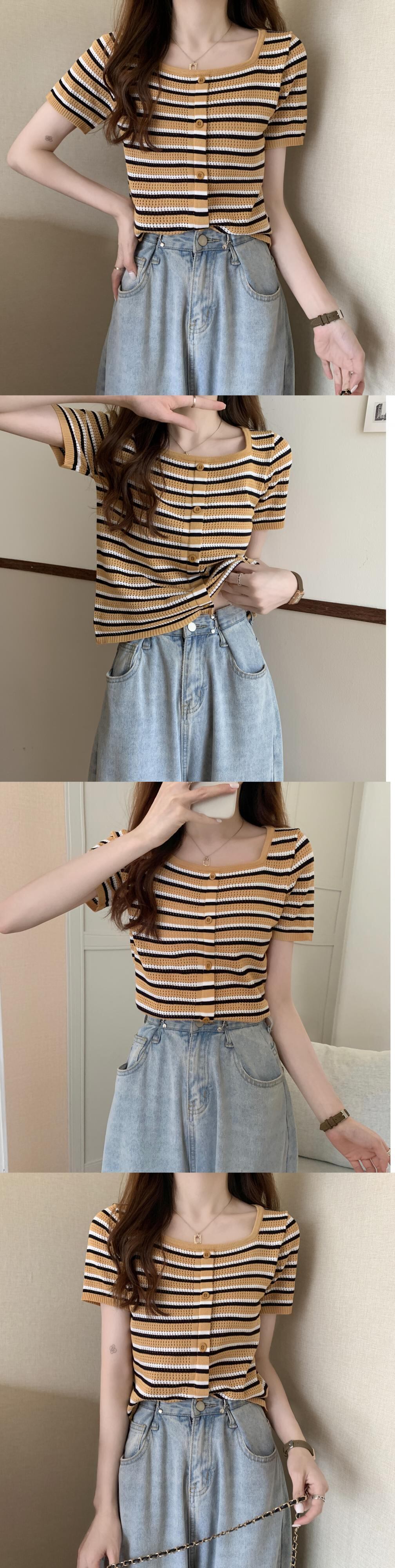 サマースリムストライプセーター ショートTシャツ シャツ トップス 夏物 スクウェア YY-ファッション60081929503