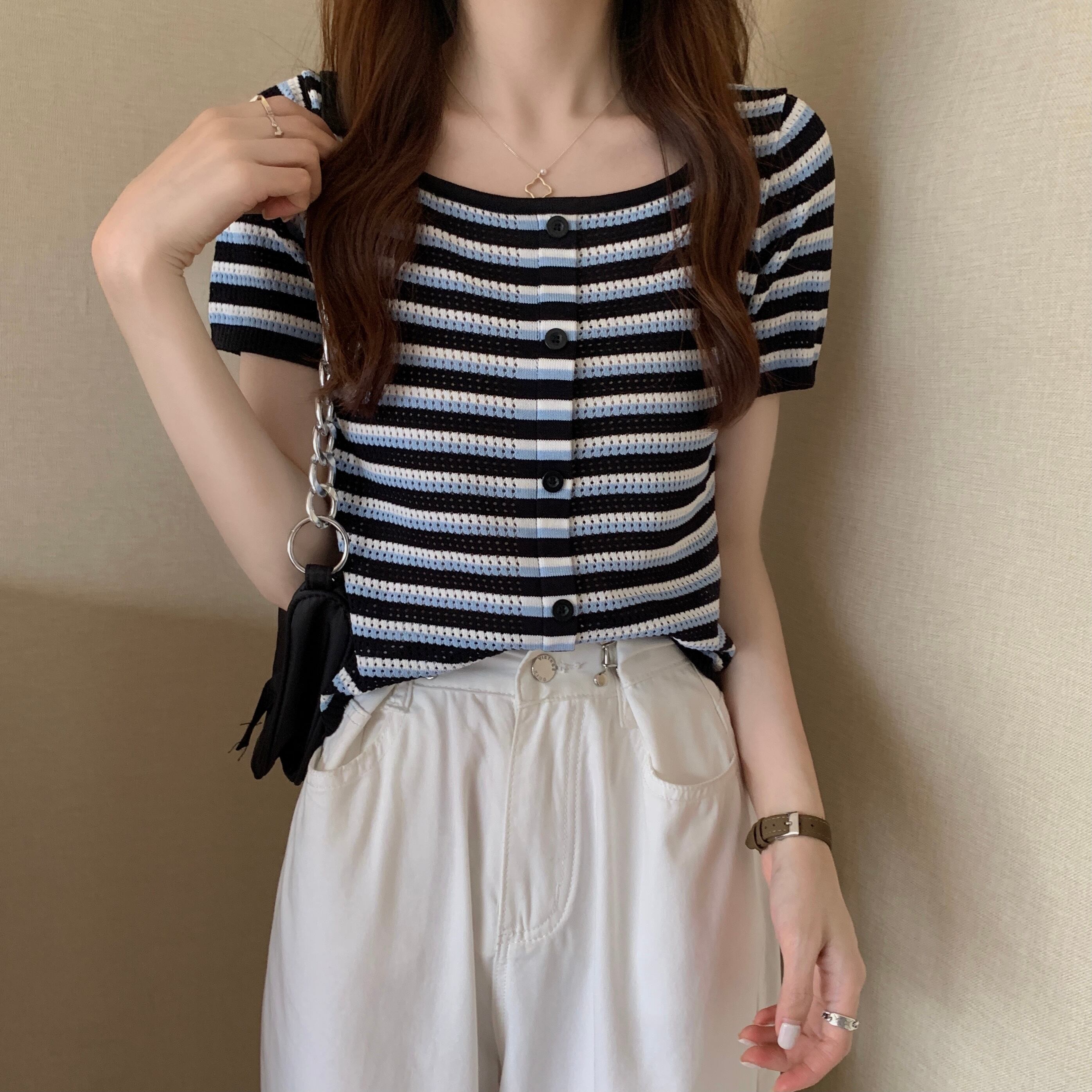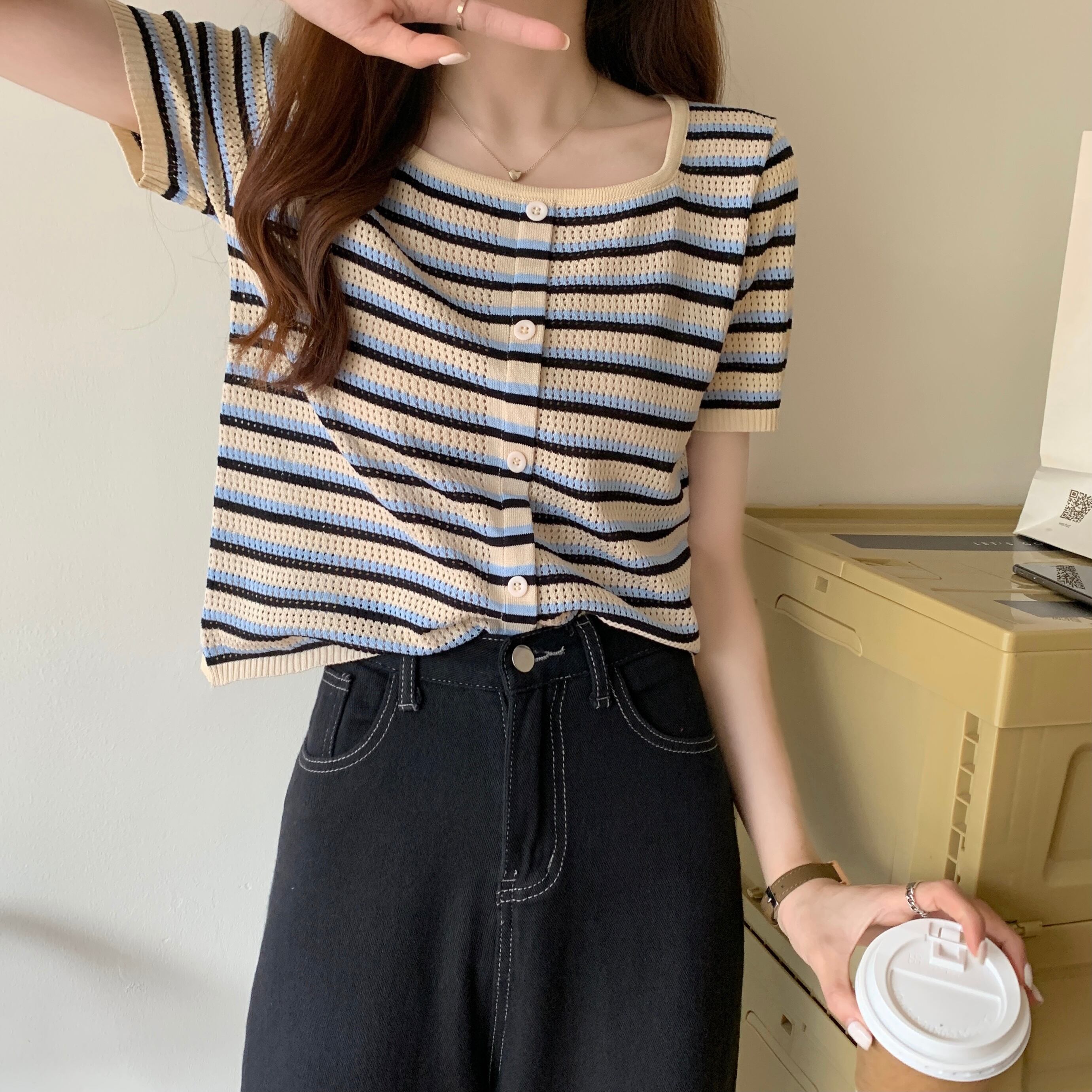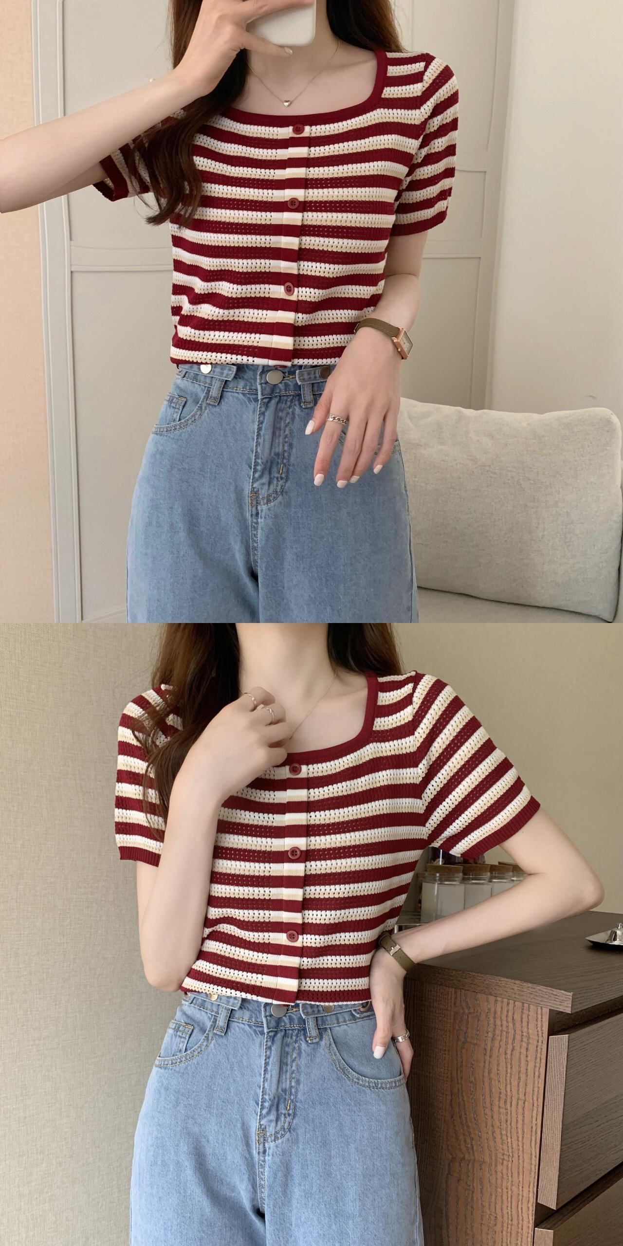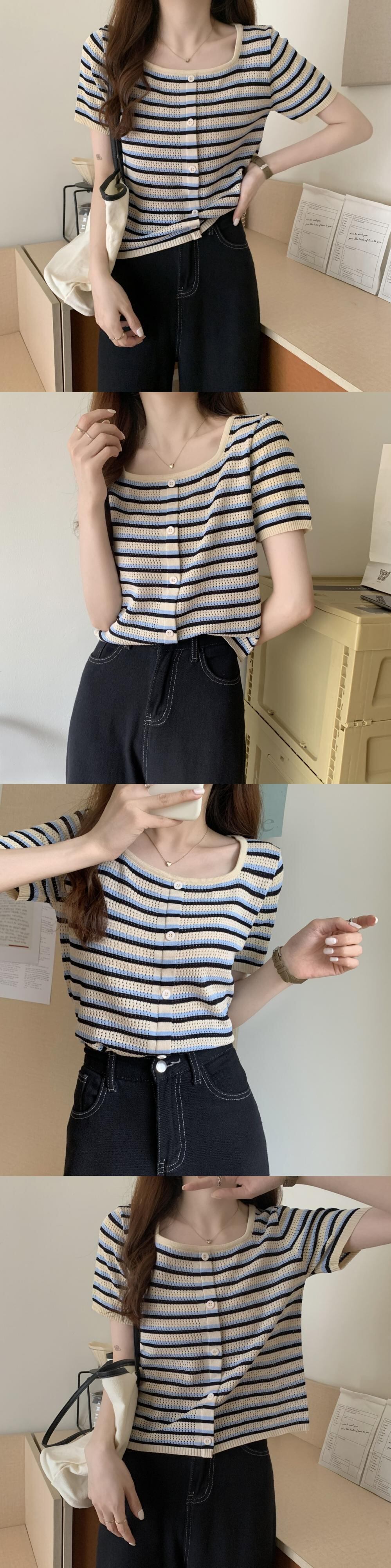 サマースリムストライプセーター ショートTシャツ シャツ トップス 夏物 スクウェア YY-ファッション60081929503