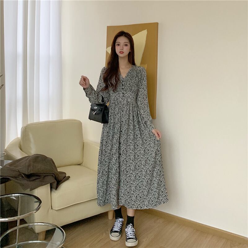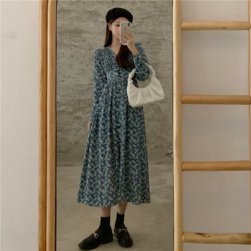 スプリングオータムウェストドレス Vネックフローラルスカート レディース ロング エレガント 春物 秋物 花柄 YY-ファッション51035597371