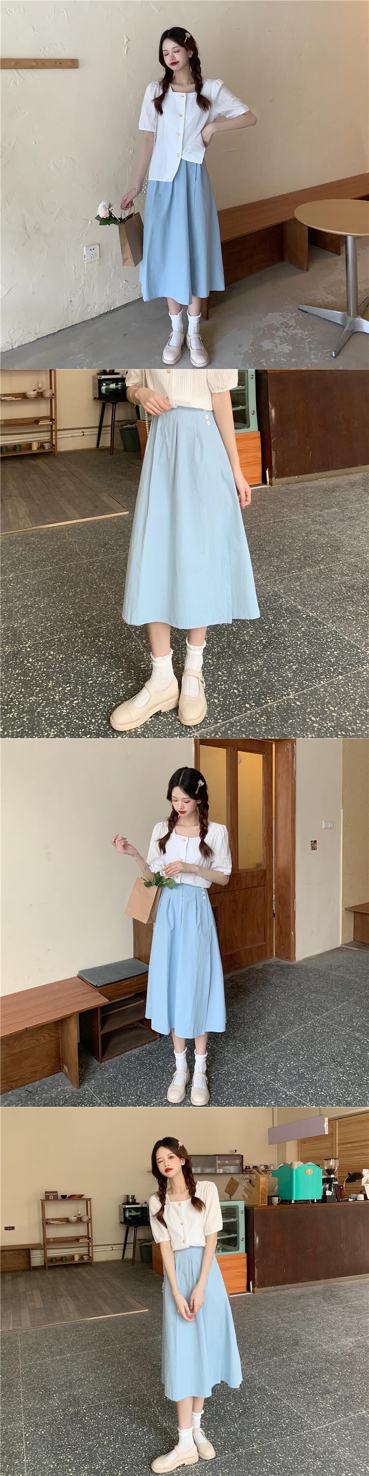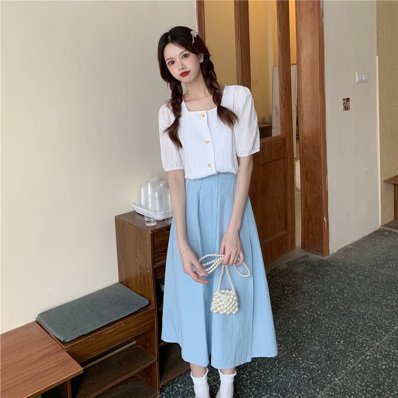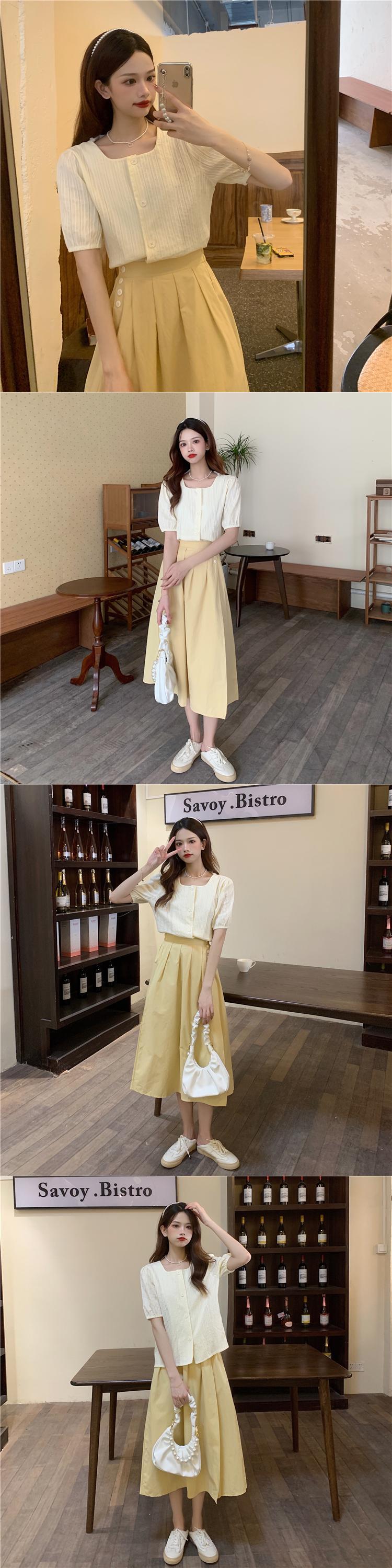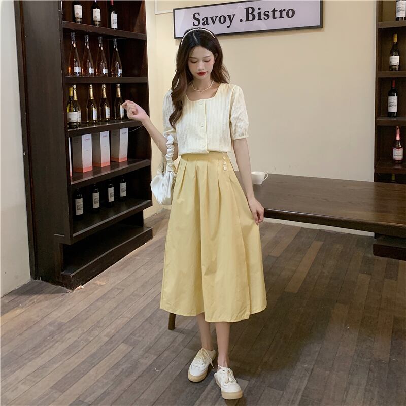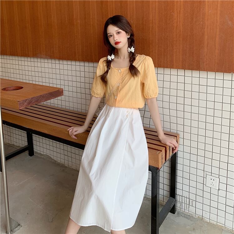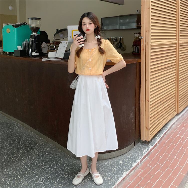 色:アプリコットシャツ,オレンジ色のシャツ,白のシャツ,黄色のスカート,白いスカート,青いスカート