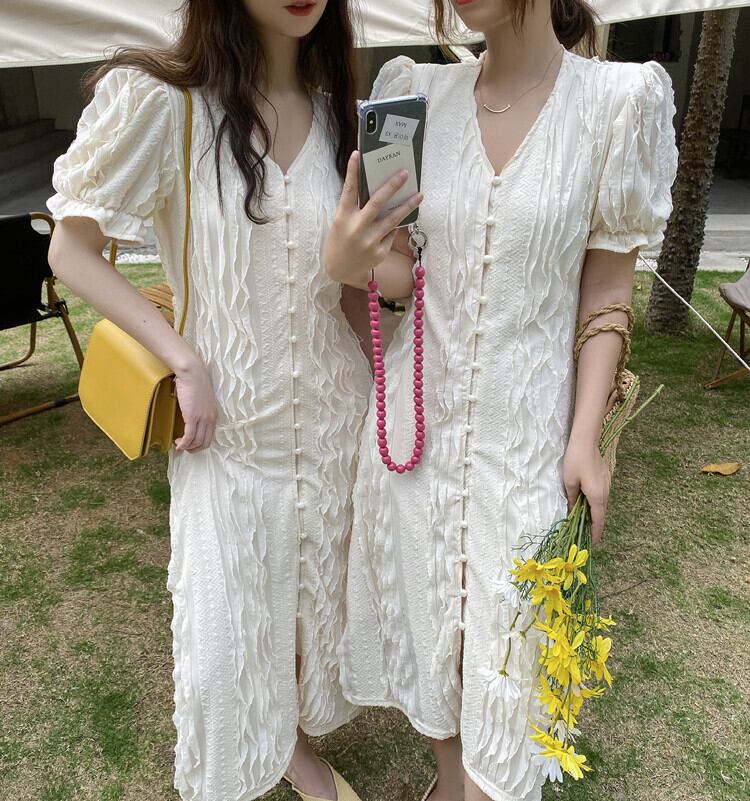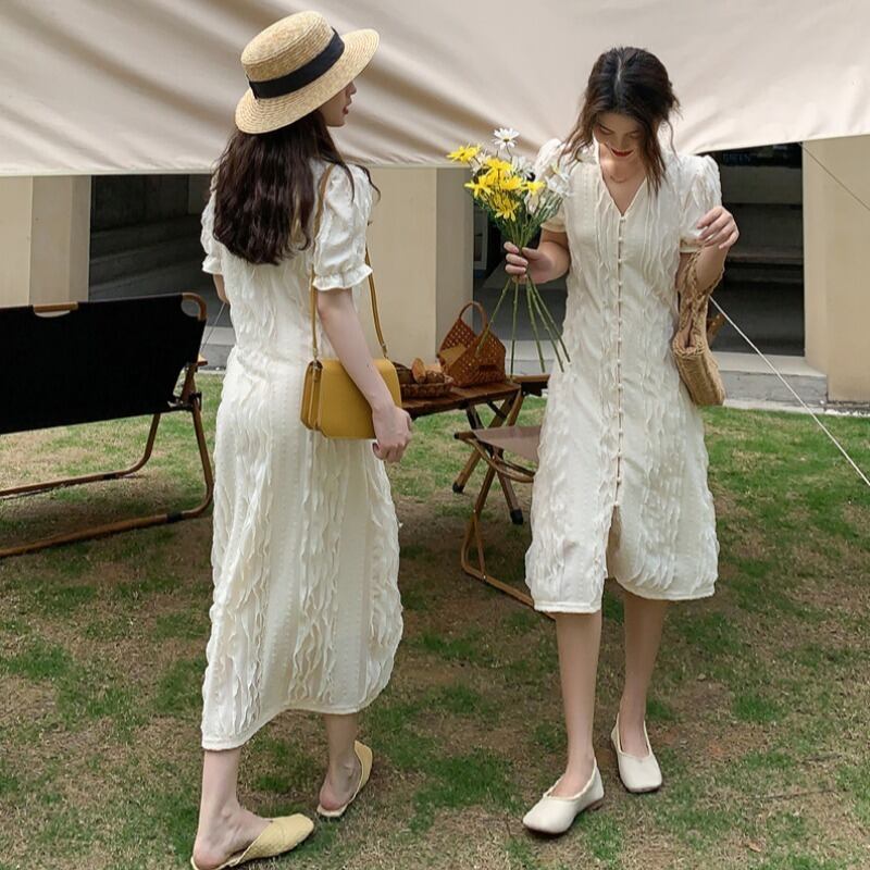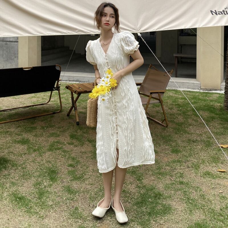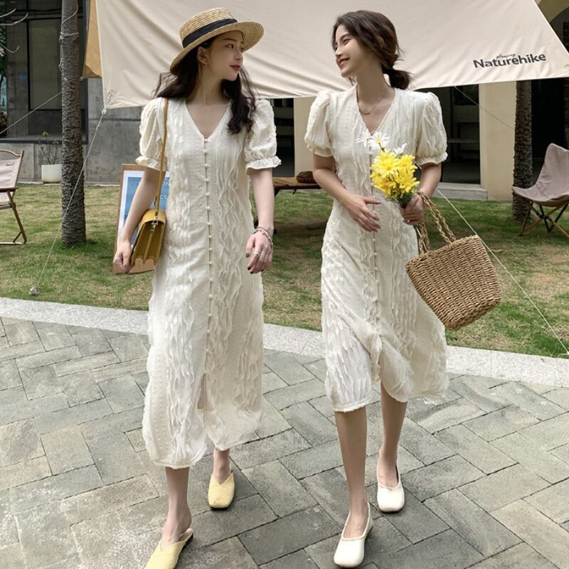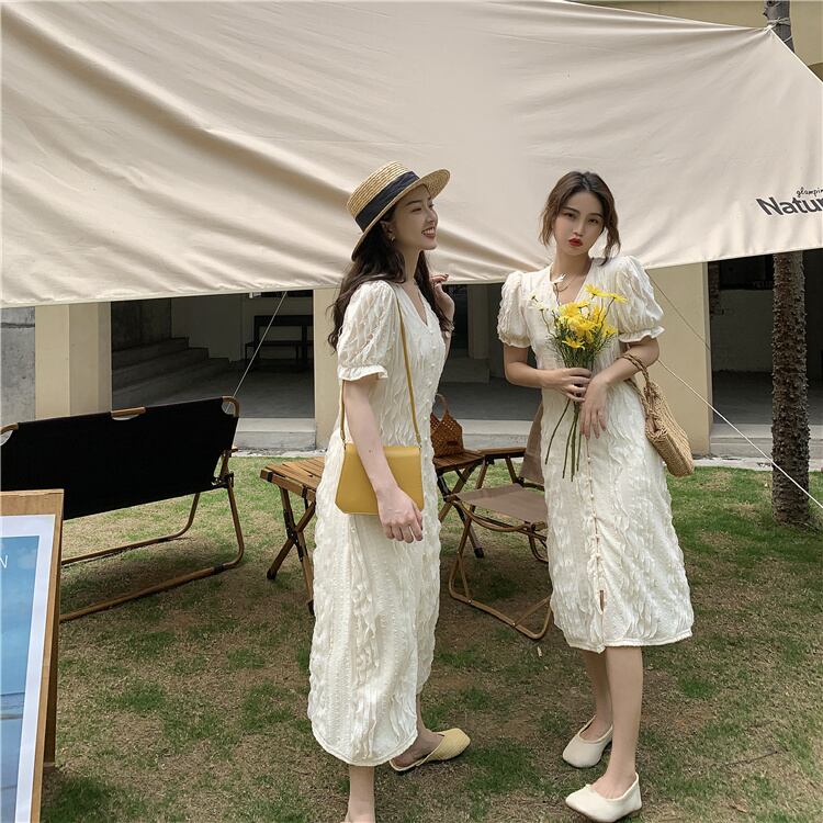 スタンダードジャカードドレス サマースタイル薄手Vネックスリーブスカート レトロ 夏物 YY-ファッション99096206022