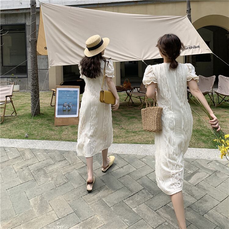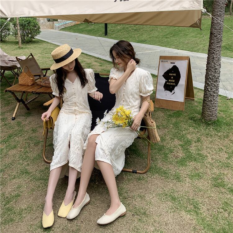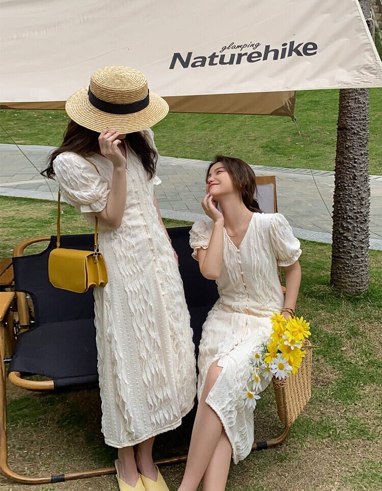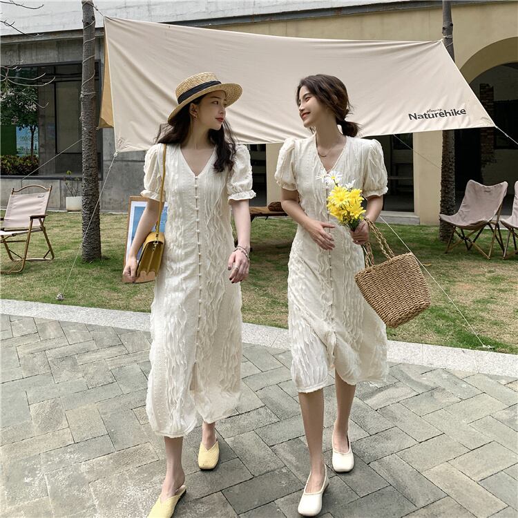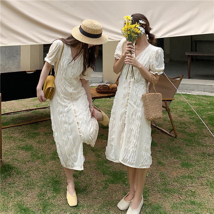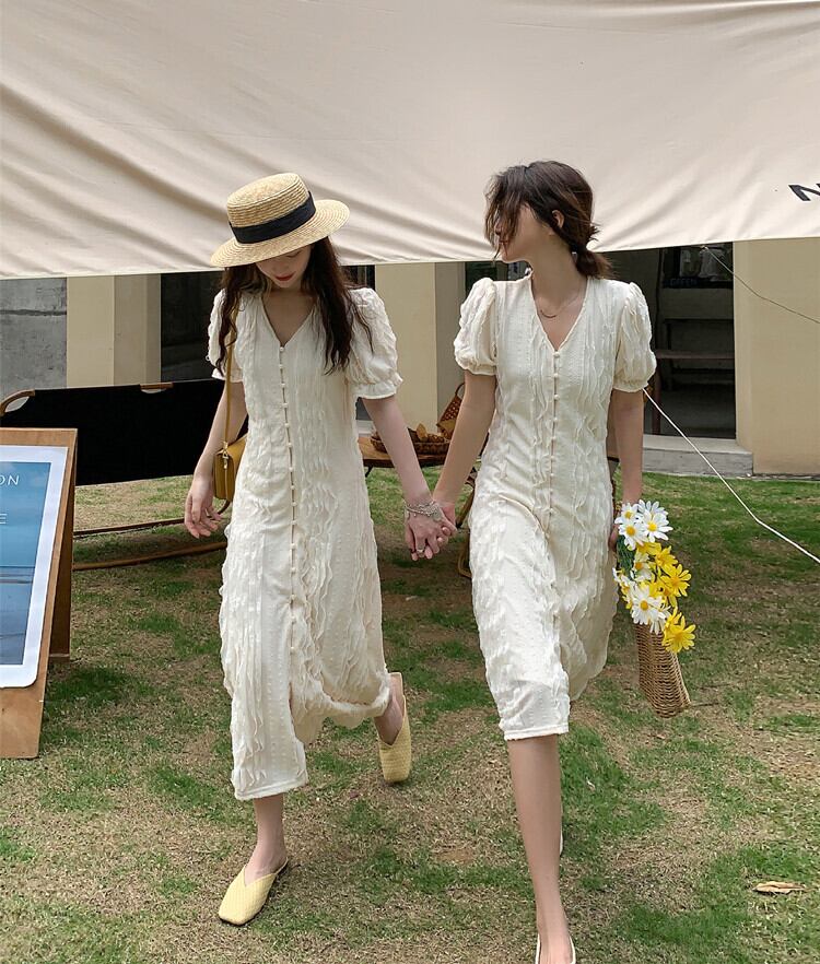 スタンダードジャカードドレス サマースタイル薄手Vネックスリーブスカート レトロ 夏物 YY-ファッション99096206022