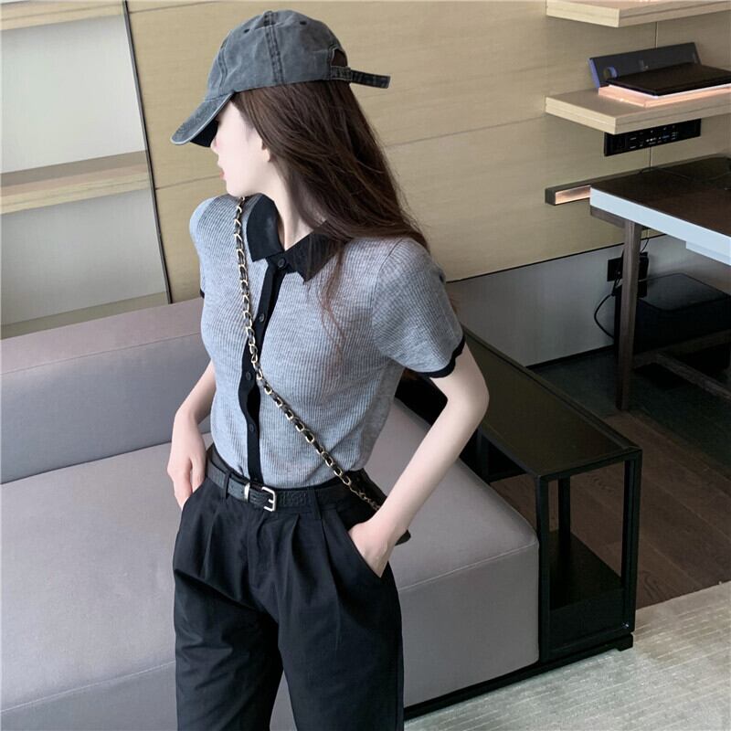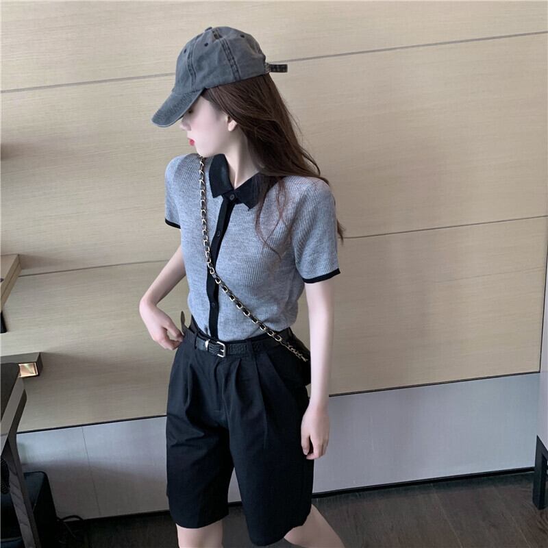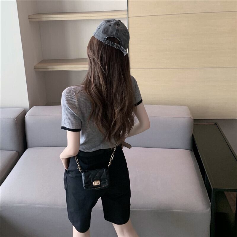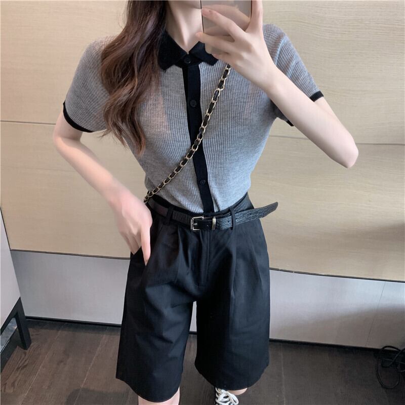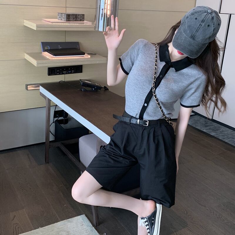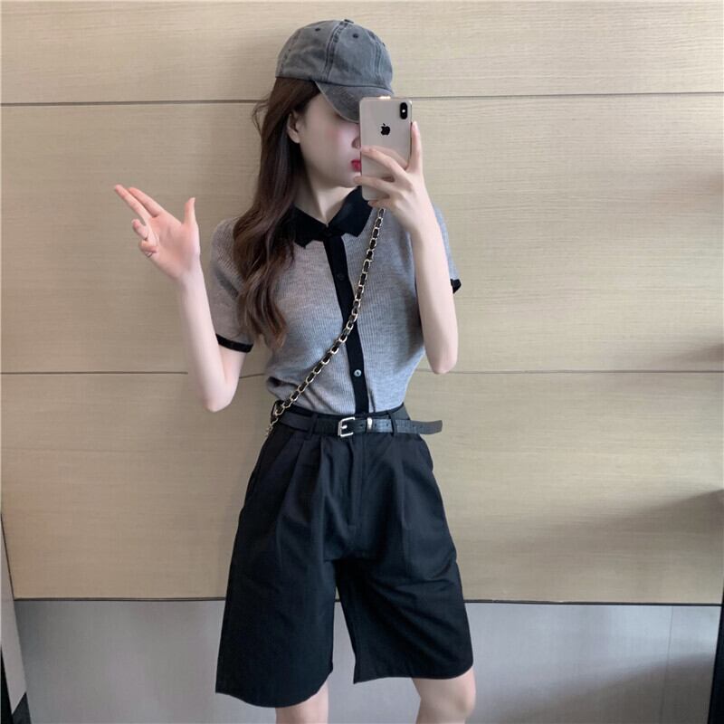 色:グレーのセーター,黒のショートパンツ