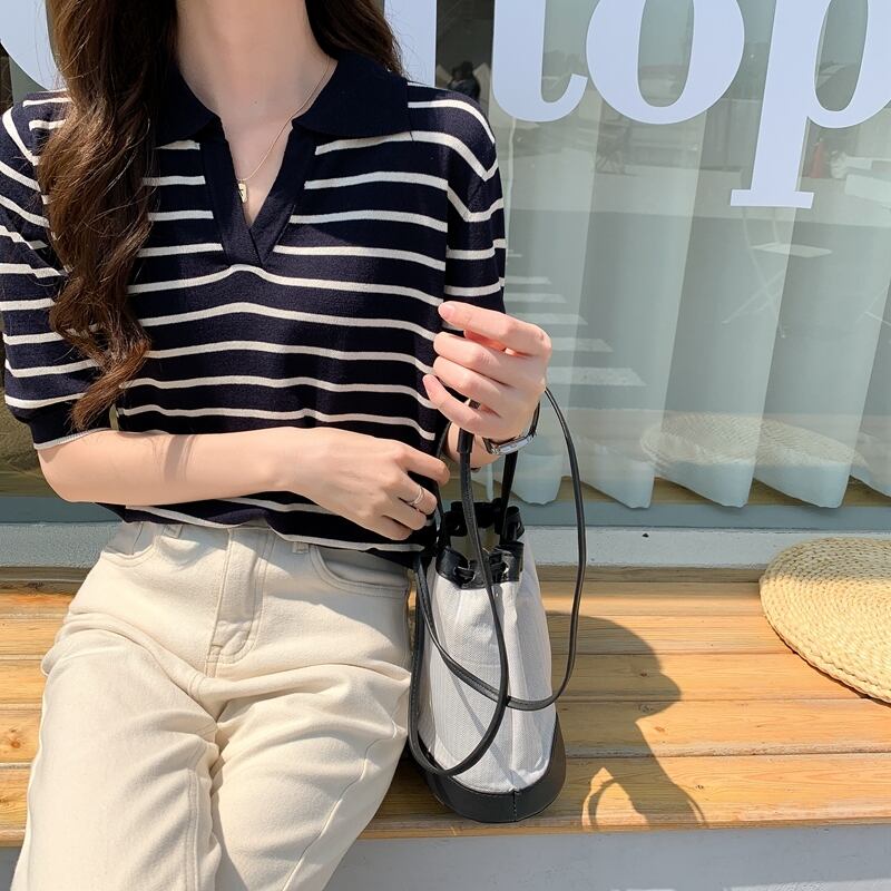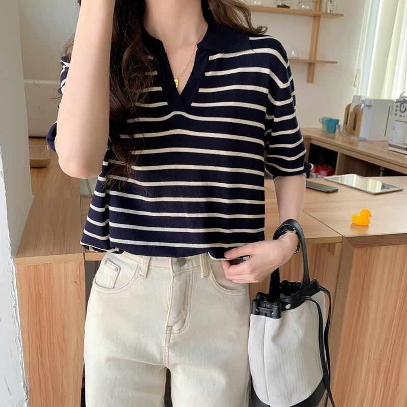 カジュアルTシャツ サマーVネックストライプセーター トップス 夏物 YY-ファッション30868362530