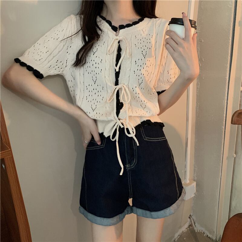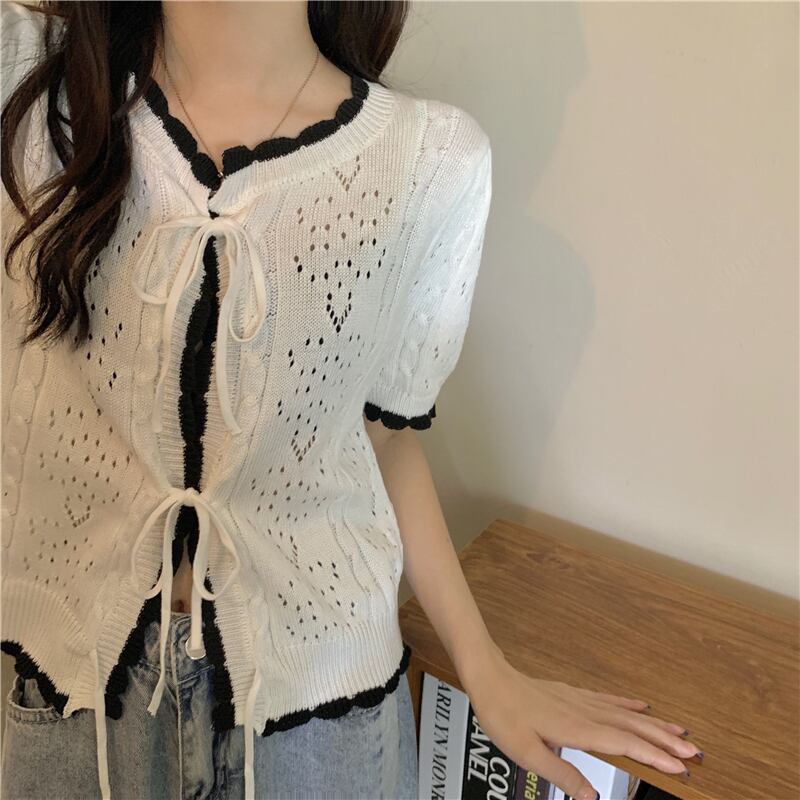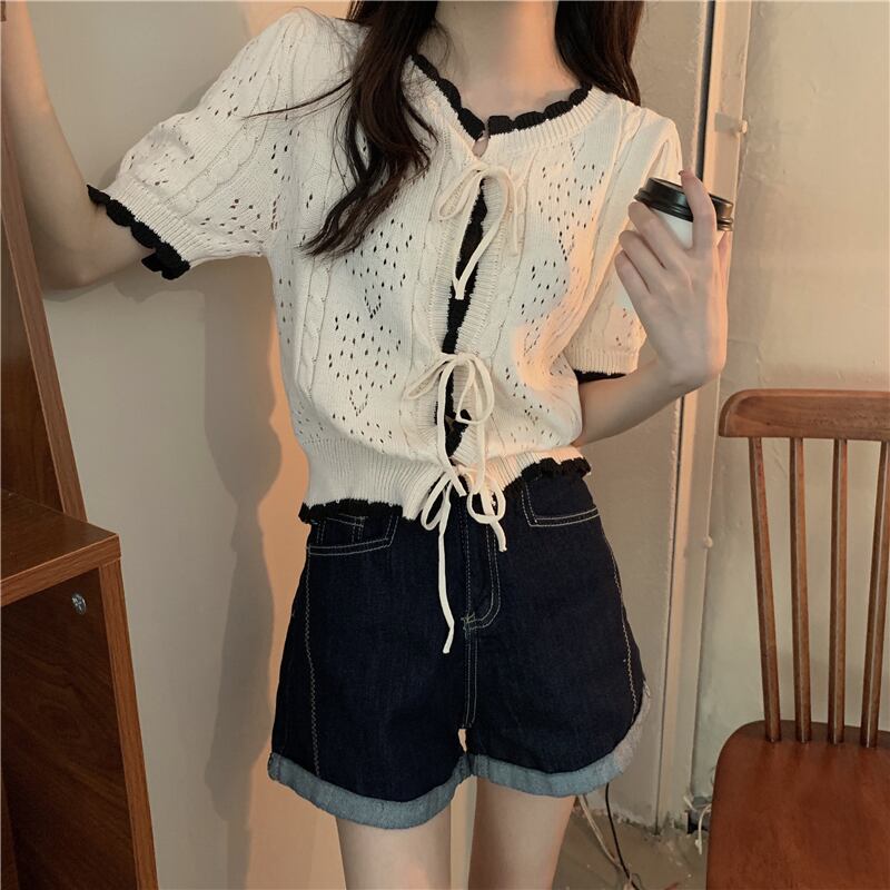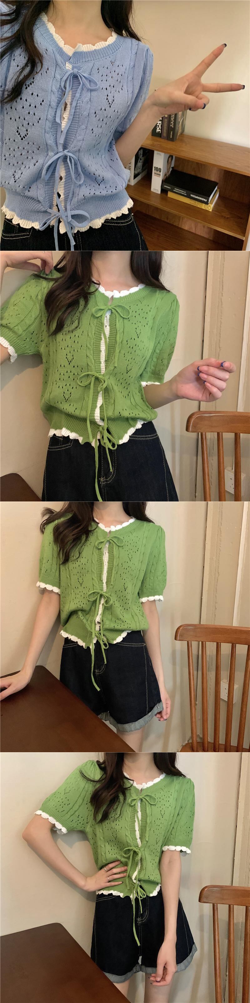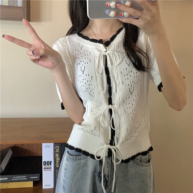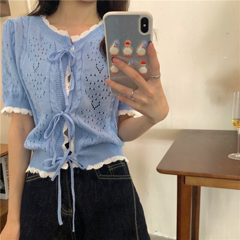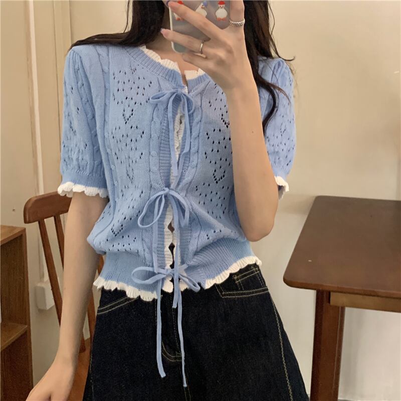 ショートトップス 半袖スリーブニットシャツ レディース レース ハーフスリーブ 大人ガーリー スウィート キュート カジュアル レースアップ YY-ファッション72867179788