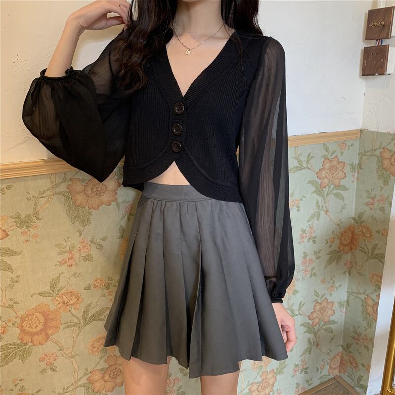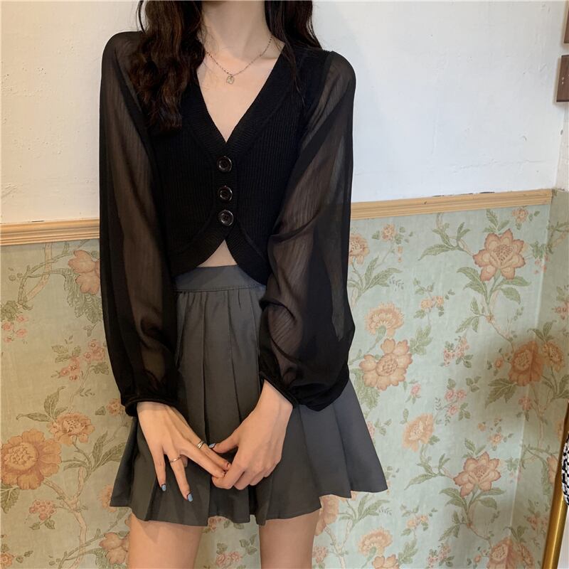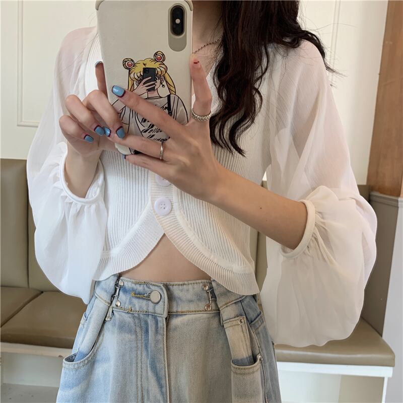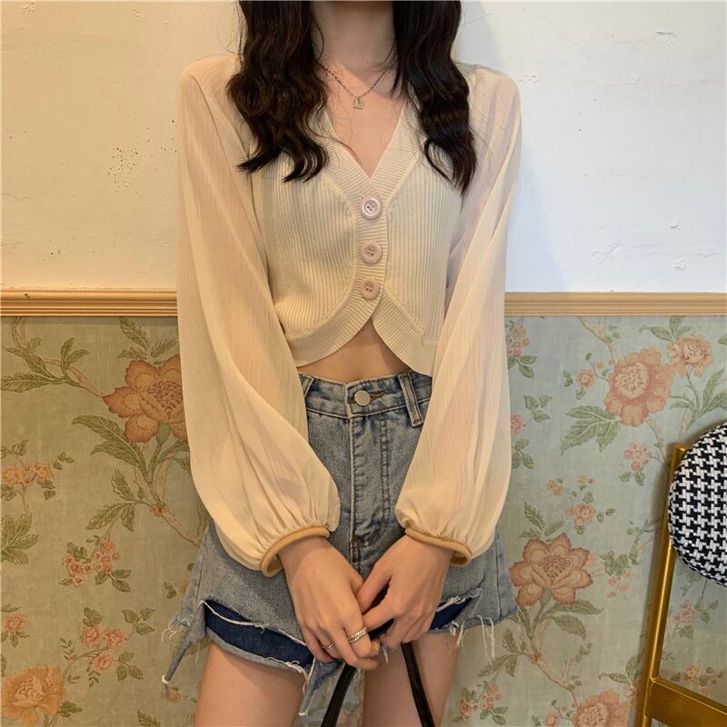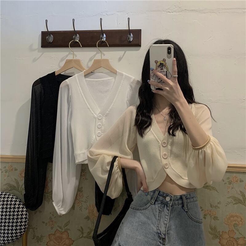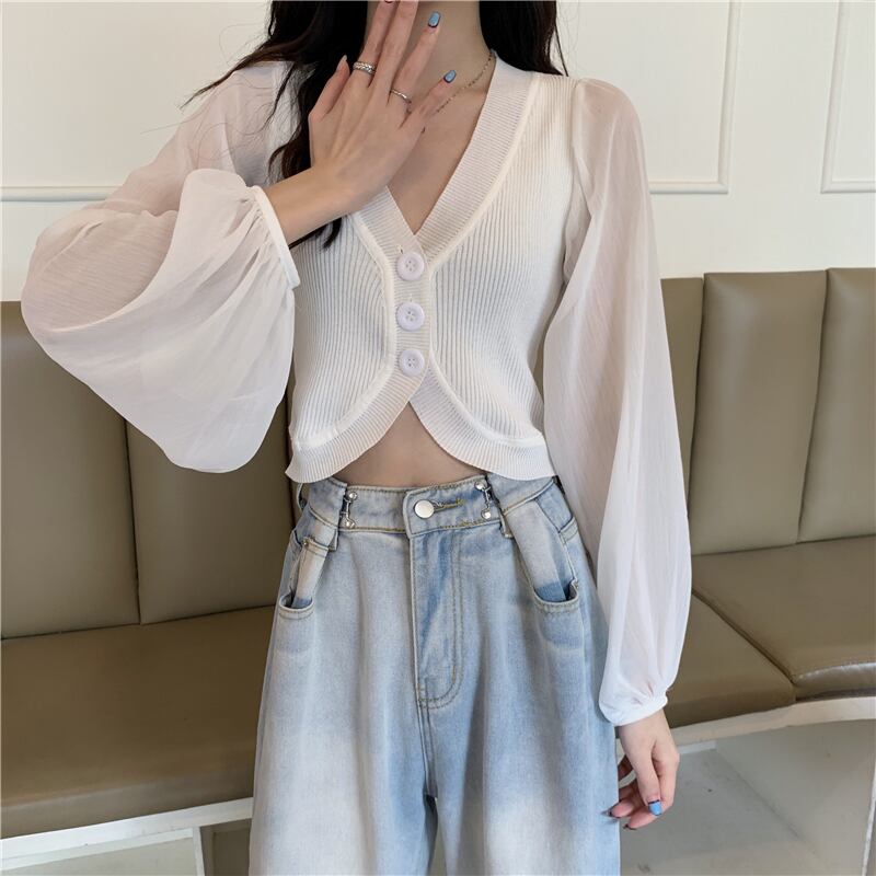 シフォンVネックカーディガンセーター スプリングサマーショートカジュアルシャツ ロング 春物 夏物 ステッチ YY-ファッション34376154071