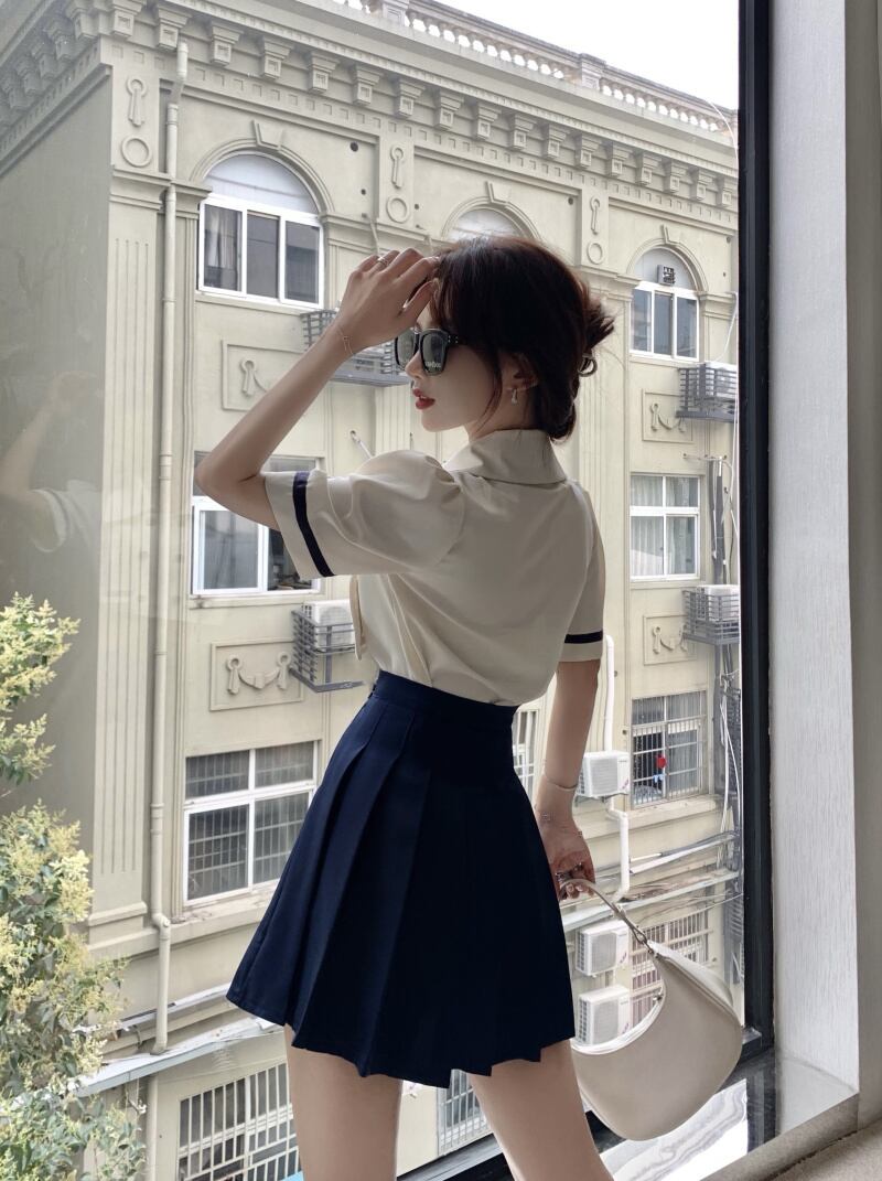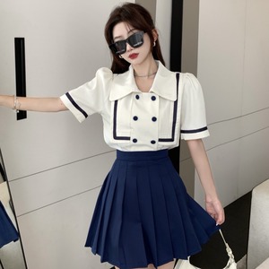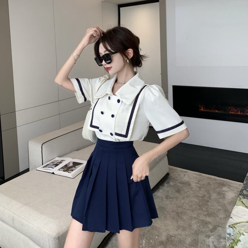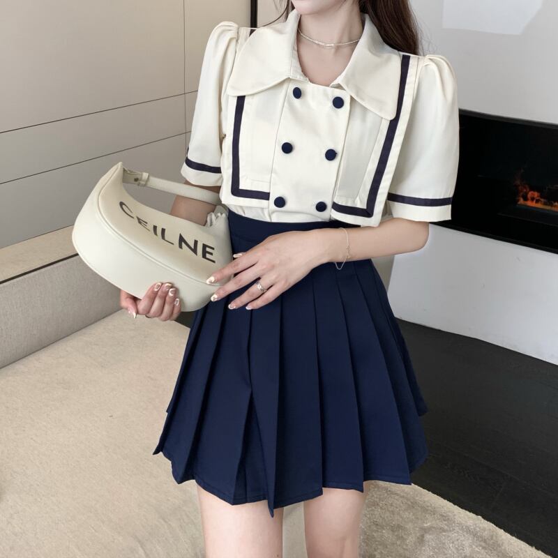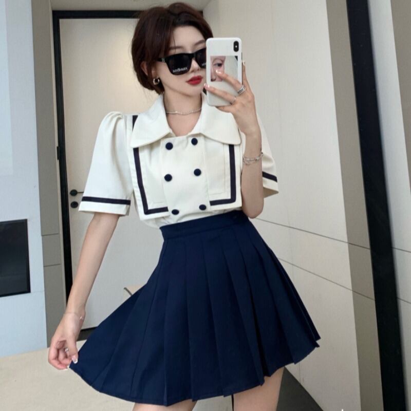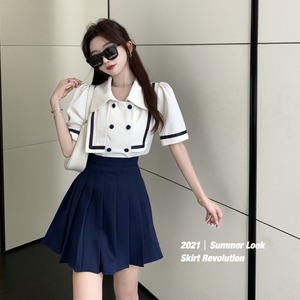 サマースタイルダブルブレストラインシャツ ハイウェストウェストスリムプリーツスカート レディース 夏物 YY-ファッション8370589339