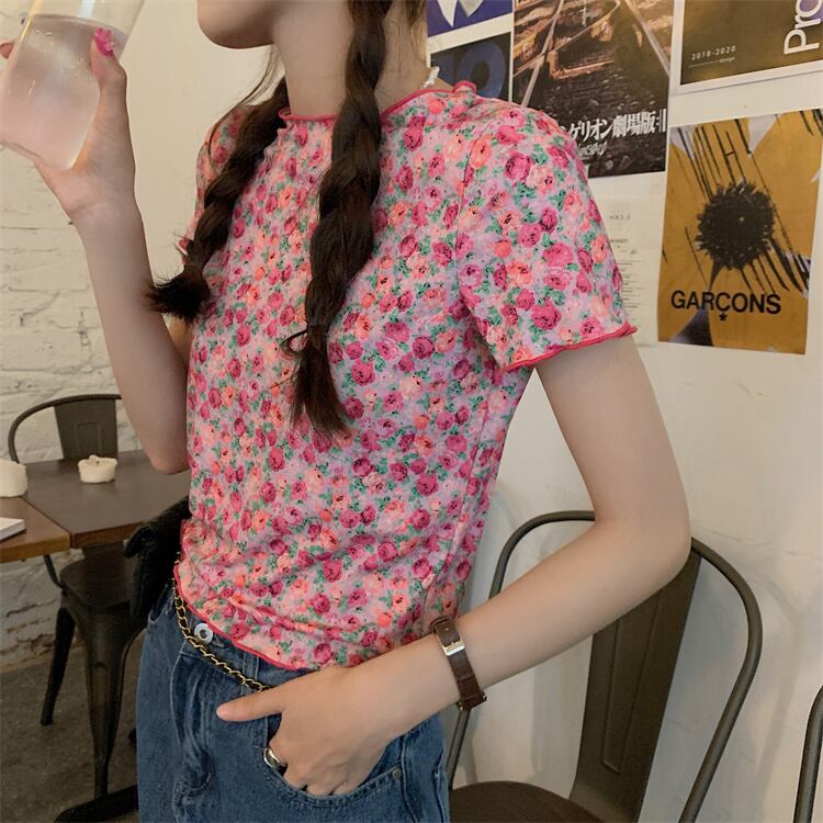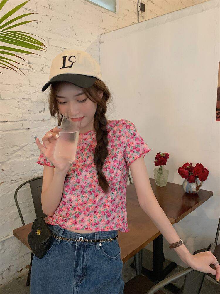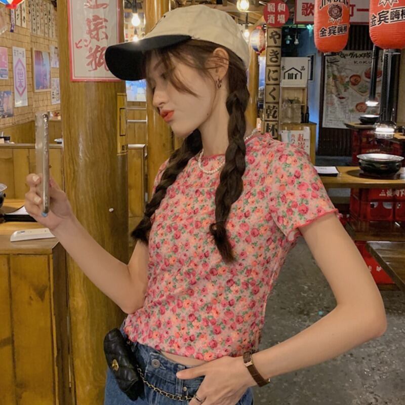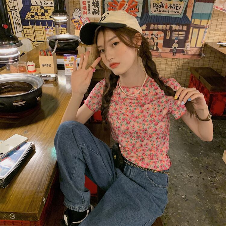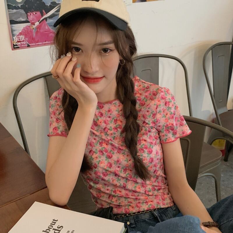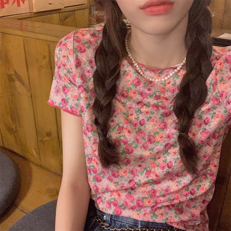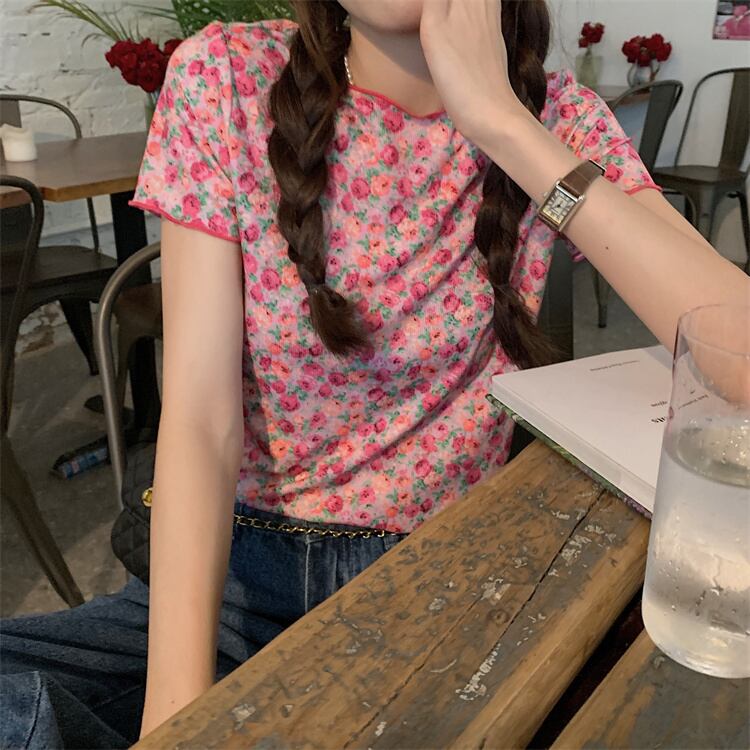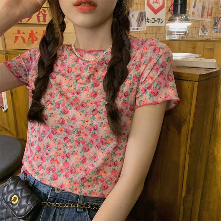 薄手スタンダードフローラルTシャツ サマーカジュアルトップス レトロ 大人ガーリー スウィート キュート 夏物 花柄 YY-ファッション59687614102