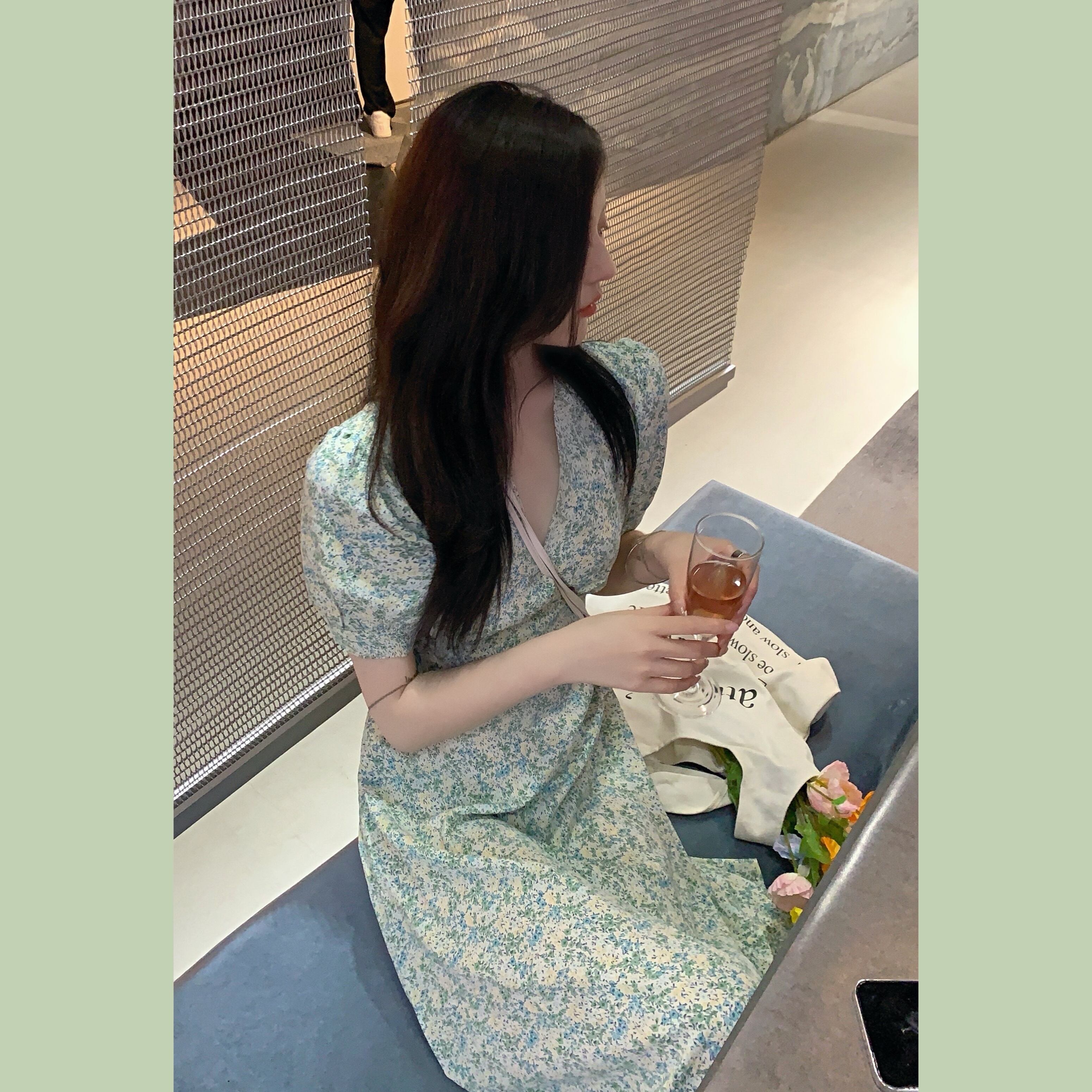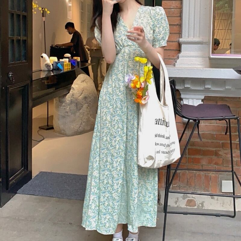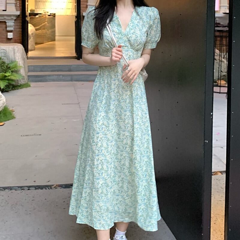 Vネックスリーブフローラルドレス サマーウェストロングスカート 夏物 花柄 YY-ファッション85999285318