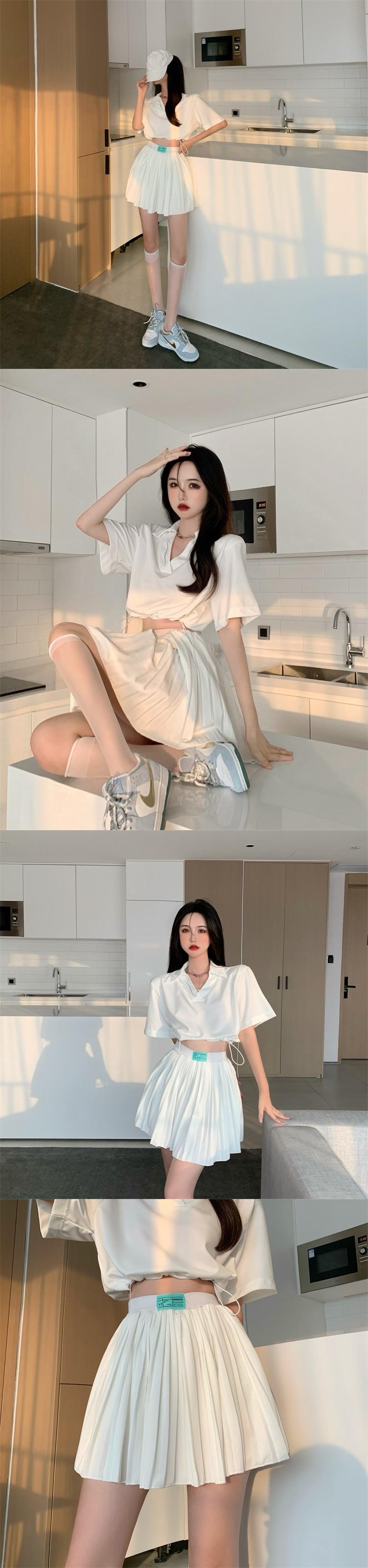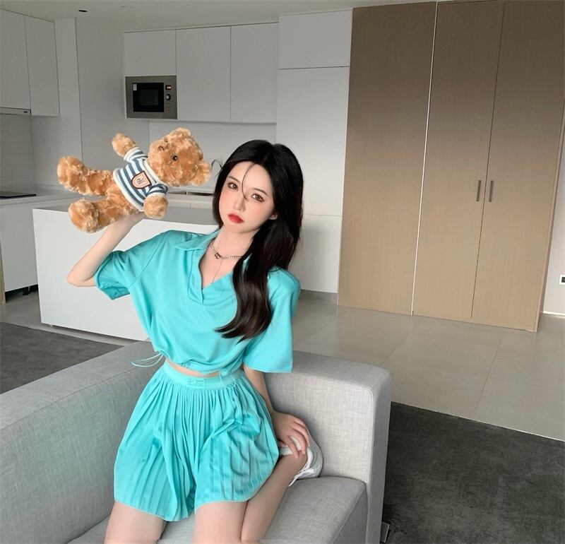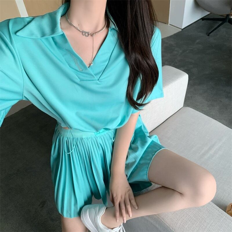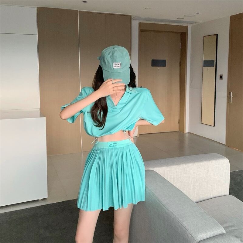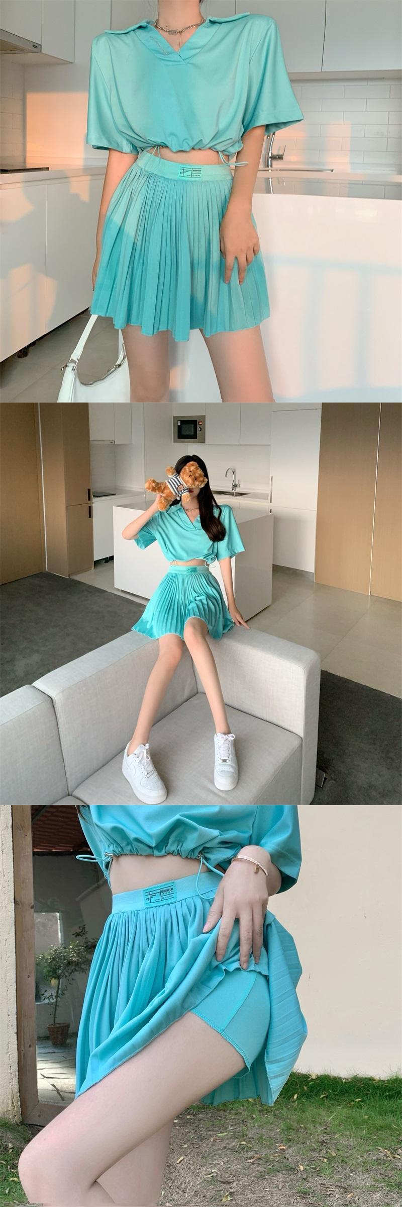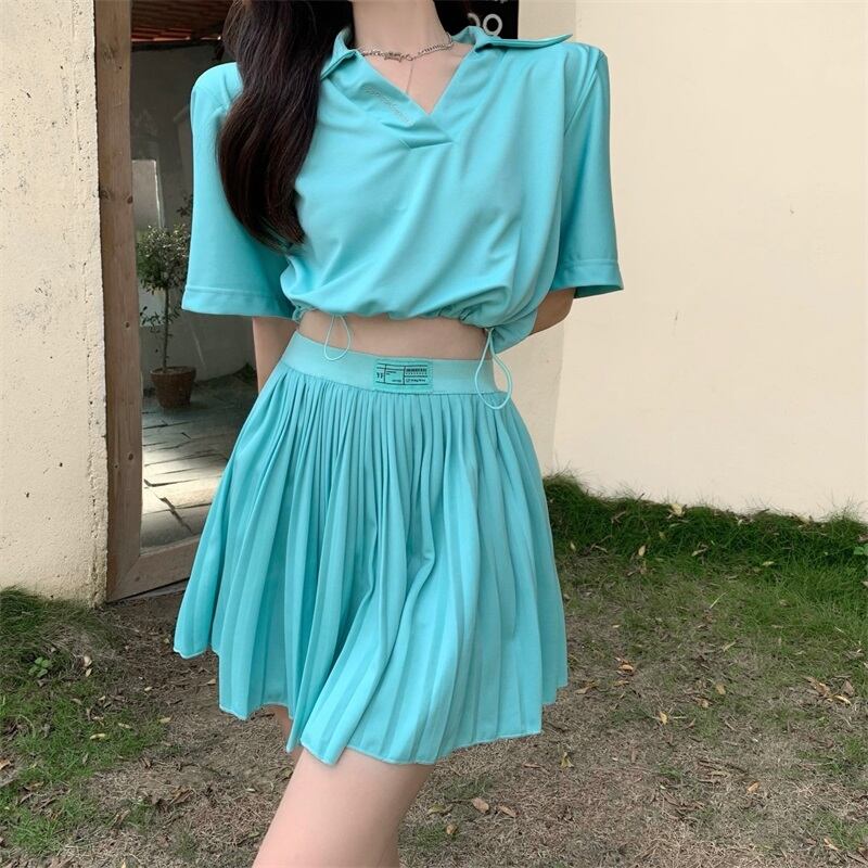 サマーVネックギャザーショートトップス ウェストプリーツスカート セット レッド 刺繍 夏物 YY-ファッション7136486436