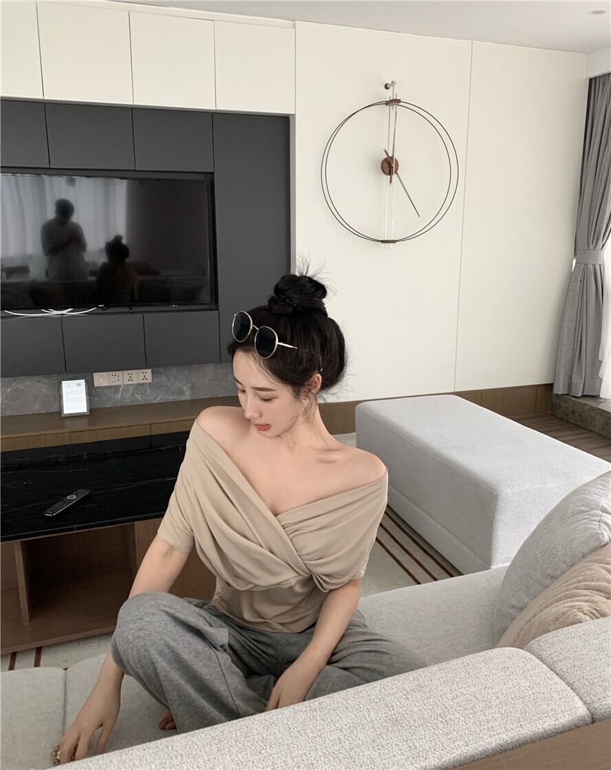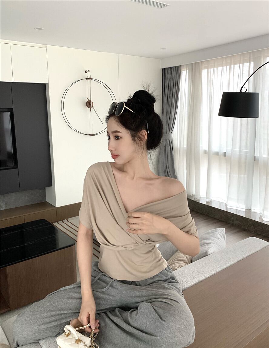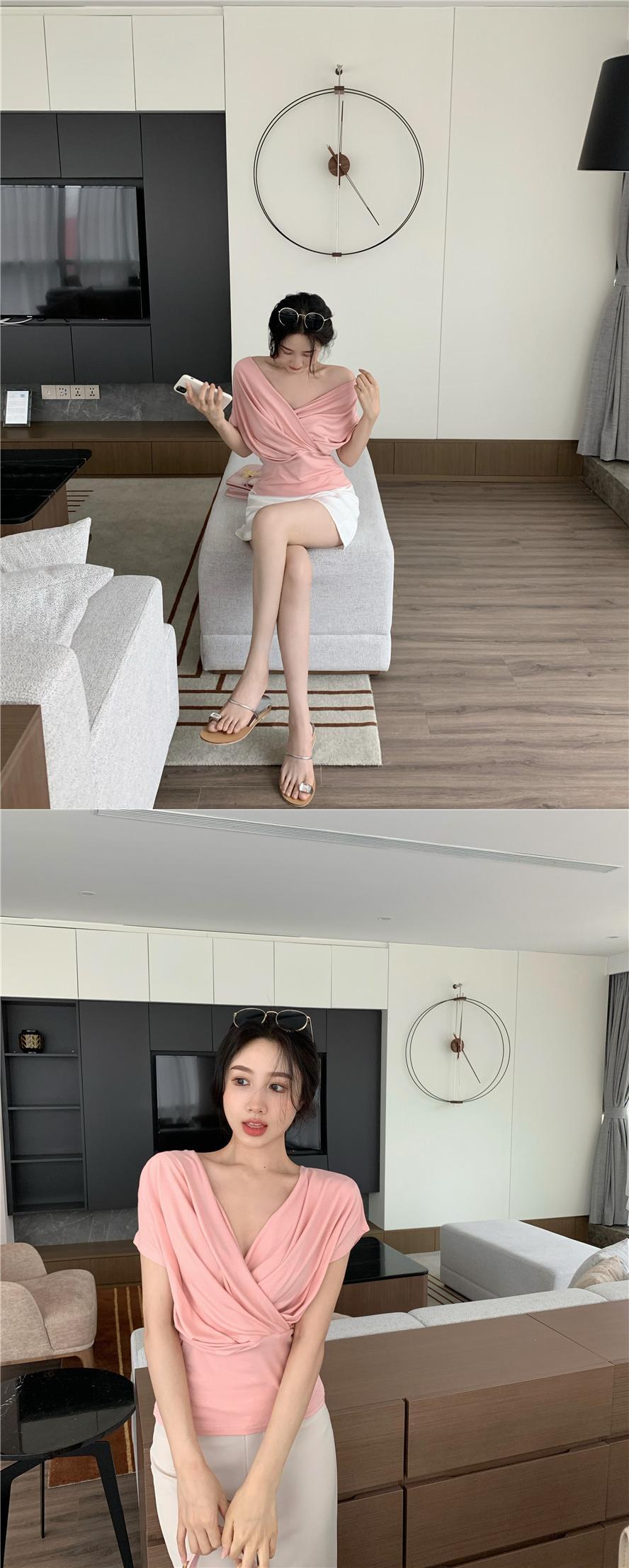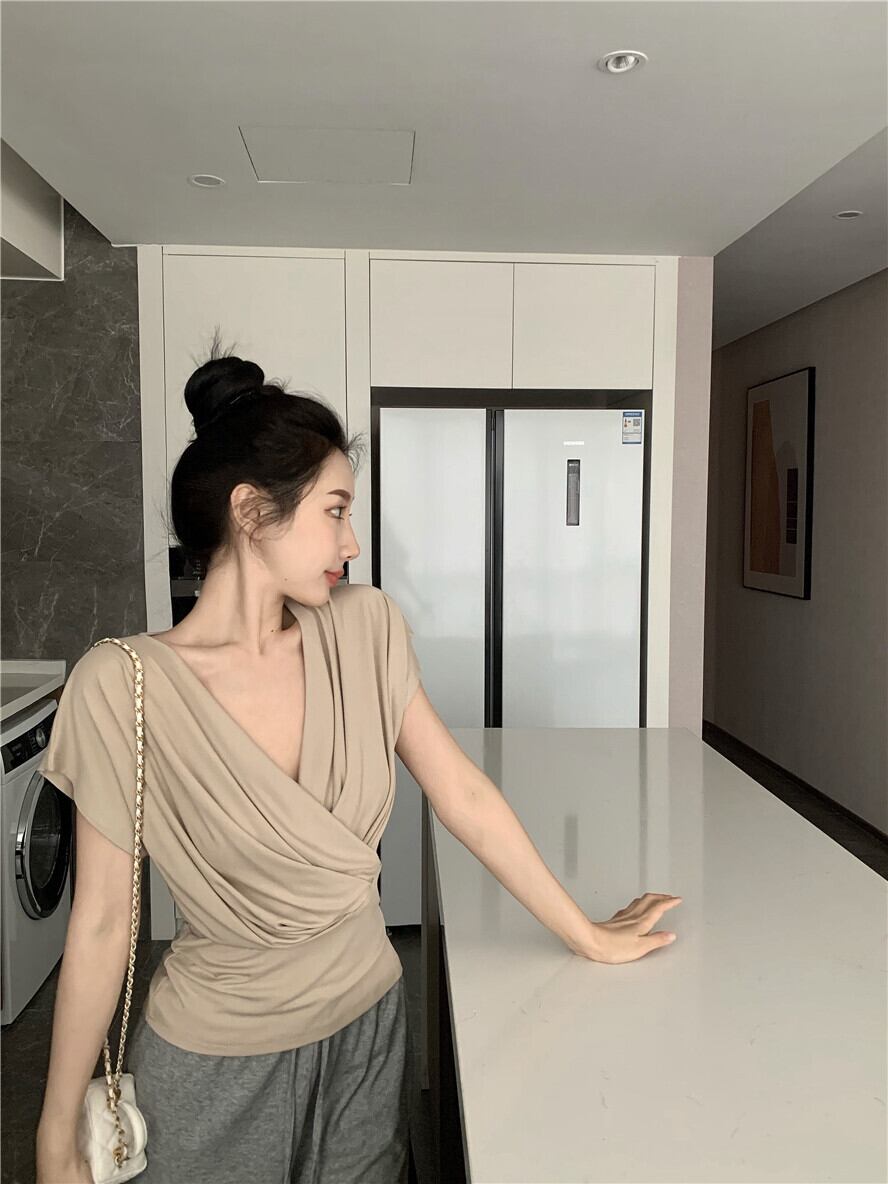 プリーツTシャツ レディースサマー薄手Vネックスタイルウェストスリムルーズトップス 大人ガーリー スウィート キュート カジュアル 夏物 YY-ファッション91150029477