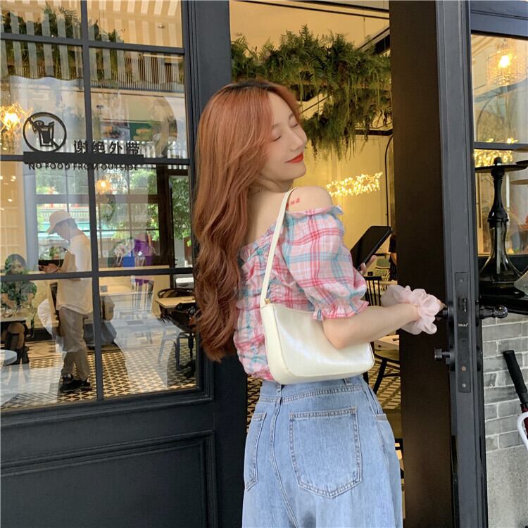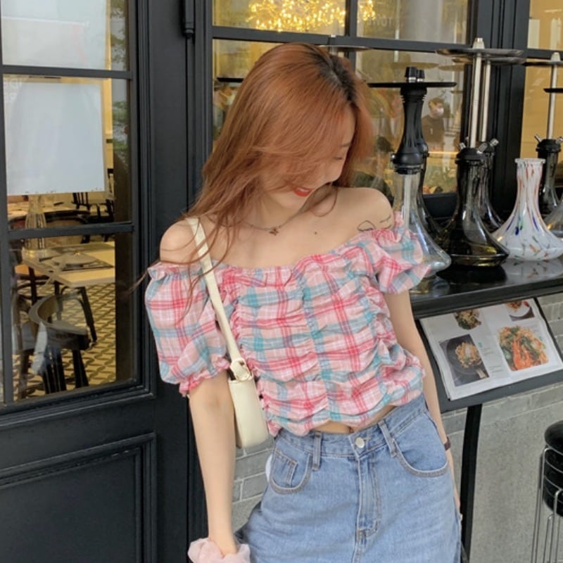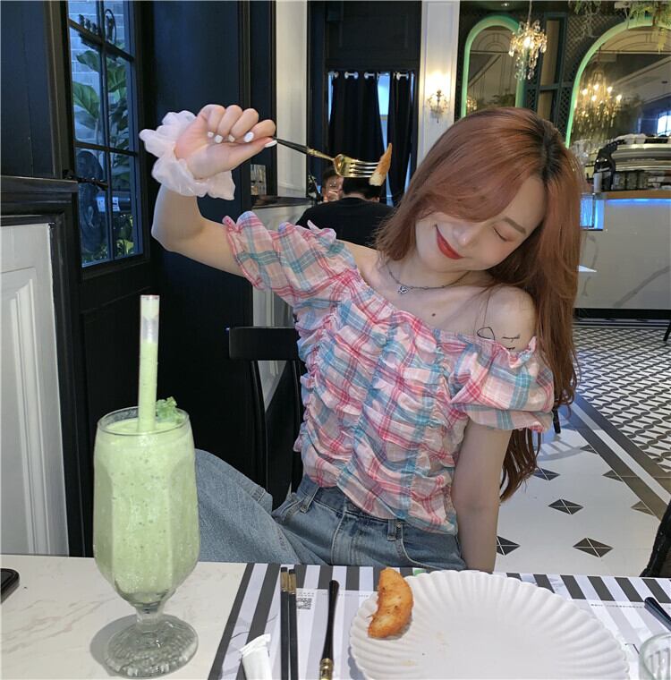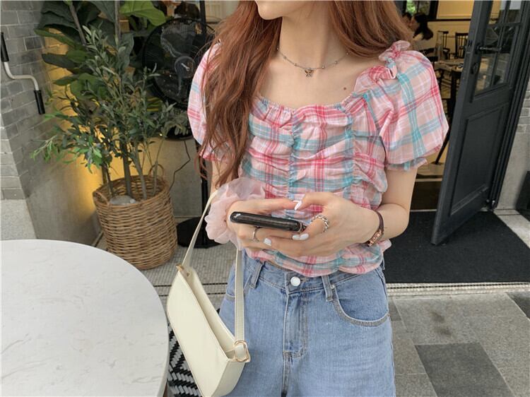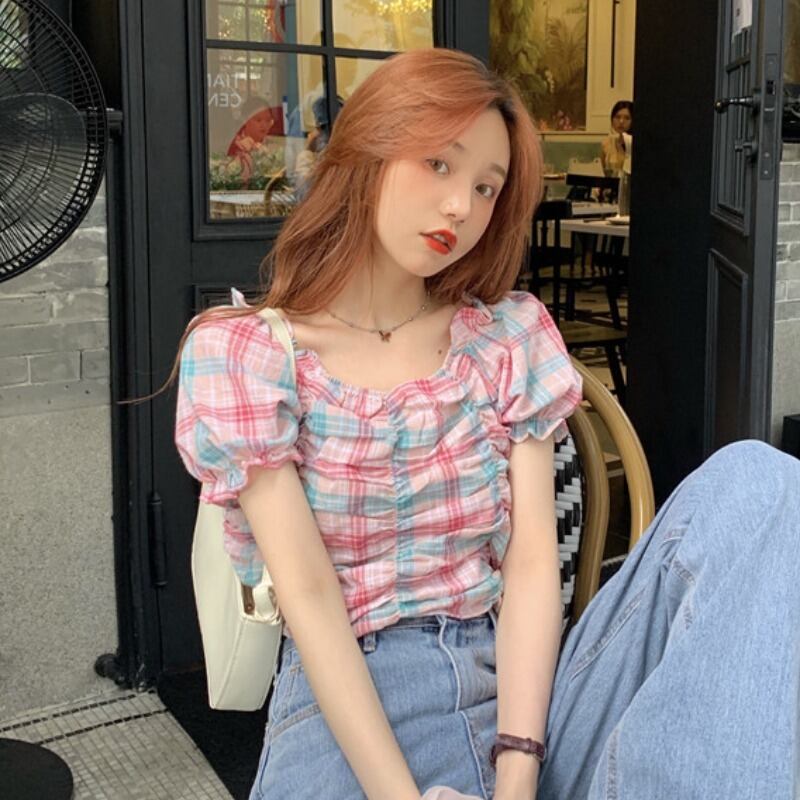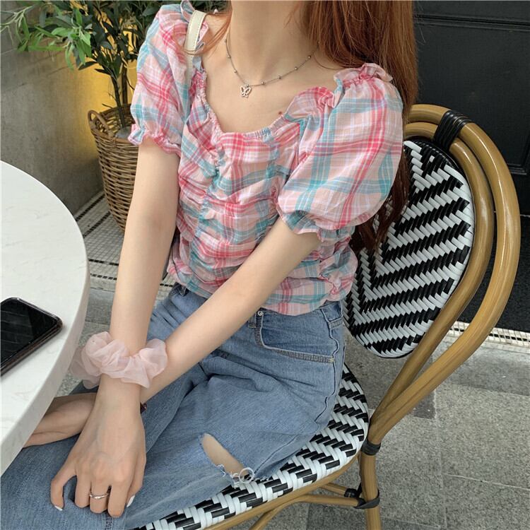 スプリングサマースタンダードスリーブショート格子柄シャツ 半袖レッドトップス レディース ピンク レトロ ハーフスリーブ 大人ガーリー スウィート キュート カジュアル 春物 夏物 YY-ファッション10459657357