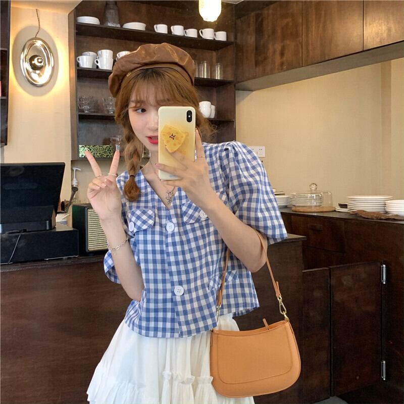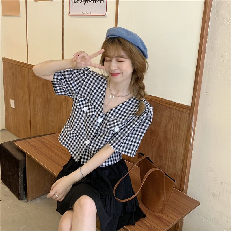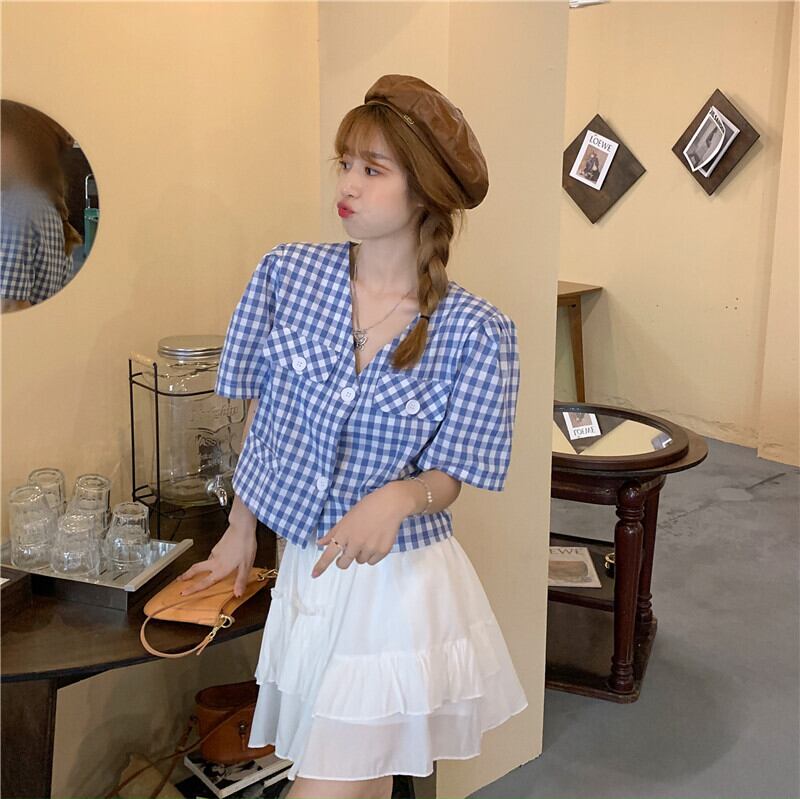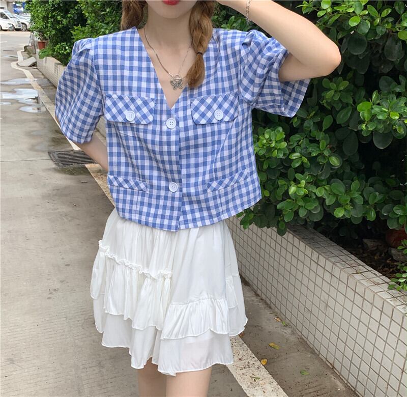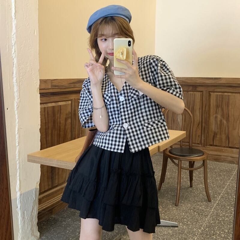 スリーブ格子柄シャツ サマーハイウェストウェストプリーツスカート ストリート 大人ガーリー スウィート キュート カジュアル 夏物 YY-ファッション51535914387