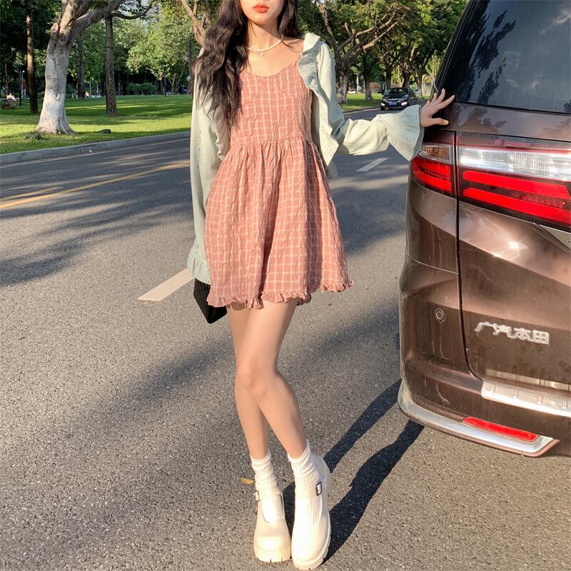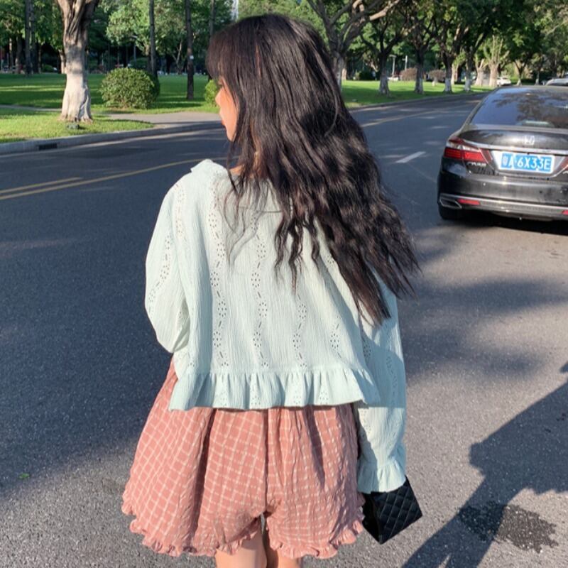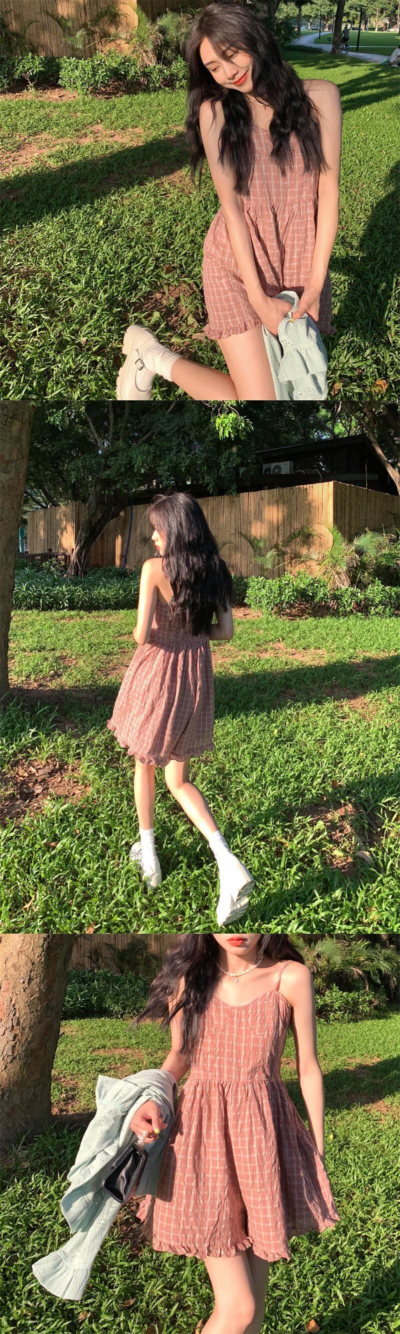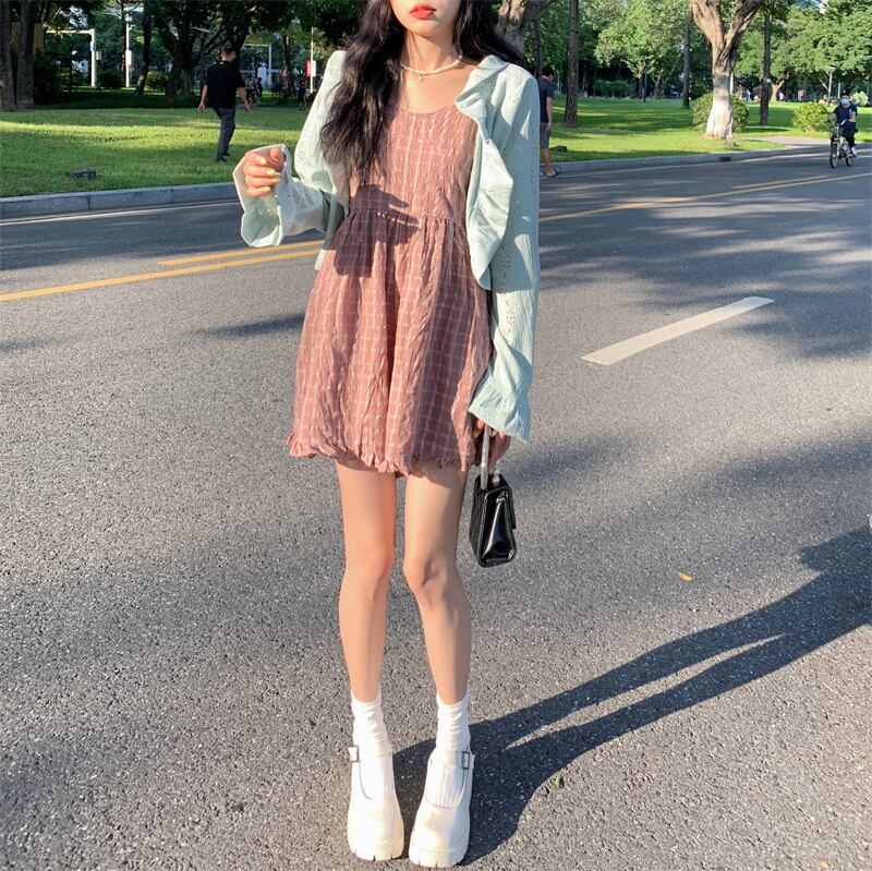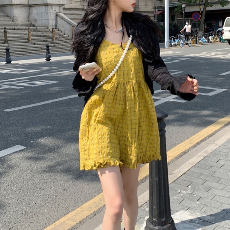 レディーススタンダード格子柄カジュアルジャンプスーツ オールインワン 薄手カーディガンサマー レトロ 夏物 YY-ファッション7740667596