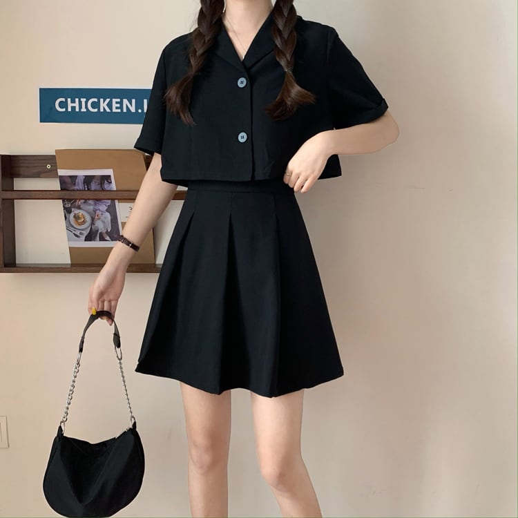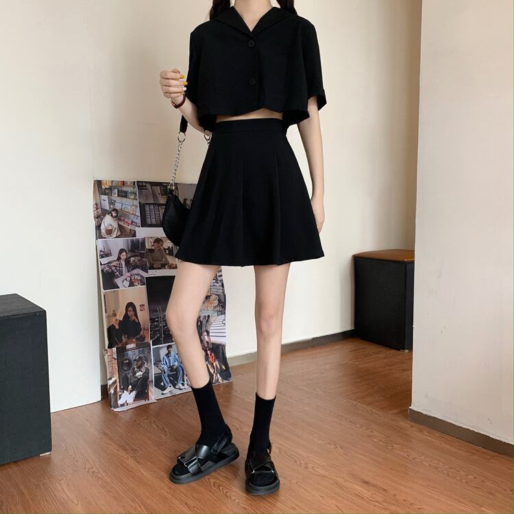 サマースタイルハイウェストウェストAラインプリーツスカート ブラックショートブラウス 夏物 YY-ファッション10671051073