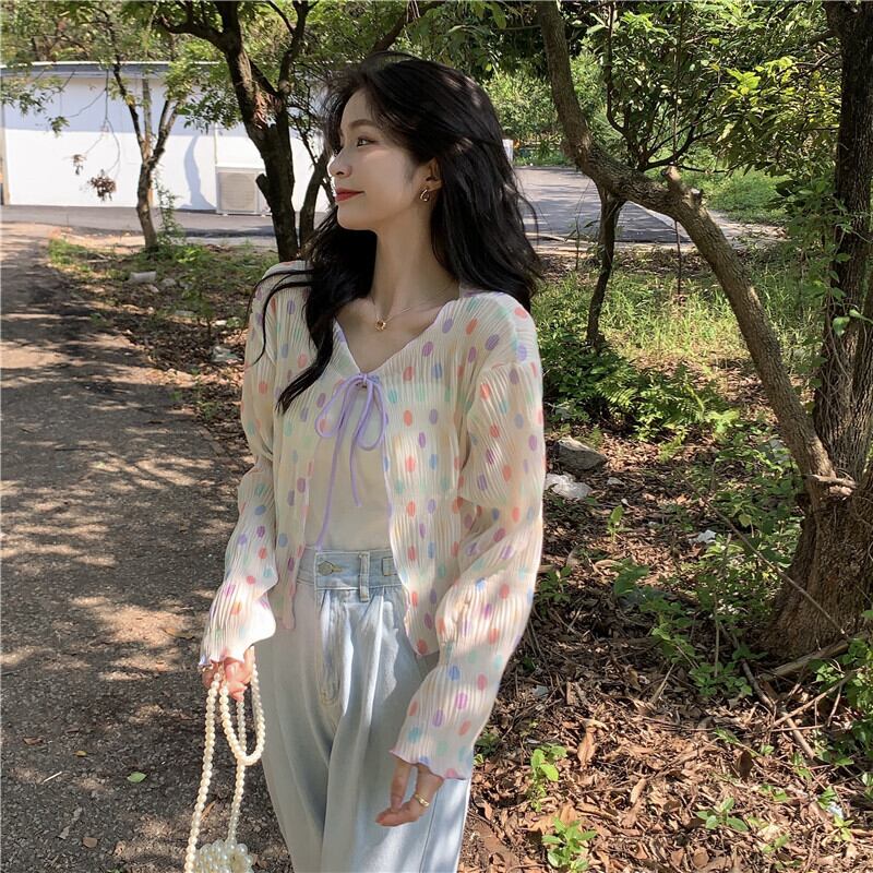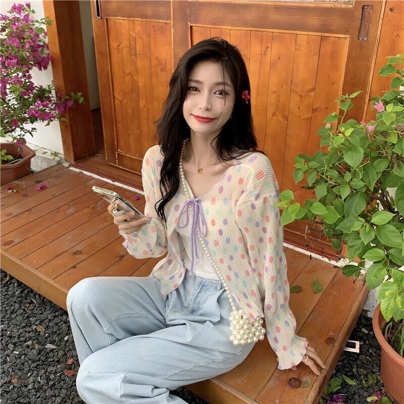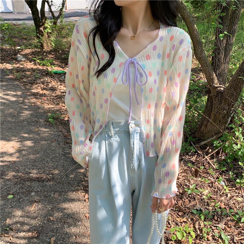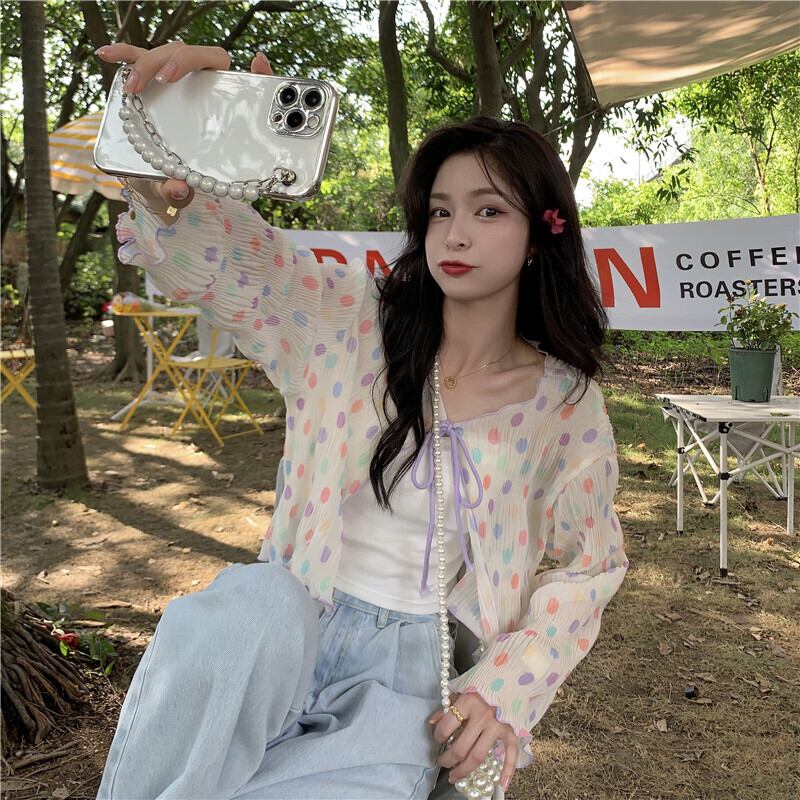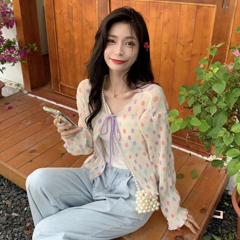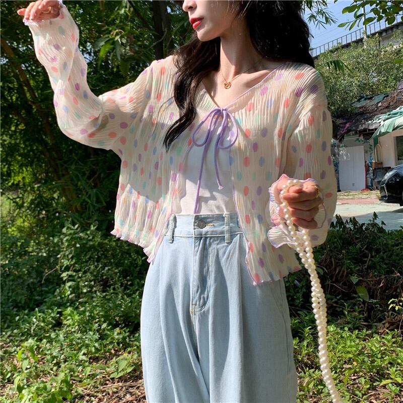長袖スリーブシフォンシャツ サマーカラー水玉薄手カーディガントップス レディース ロング 夏物 YY-ファッション96900424578