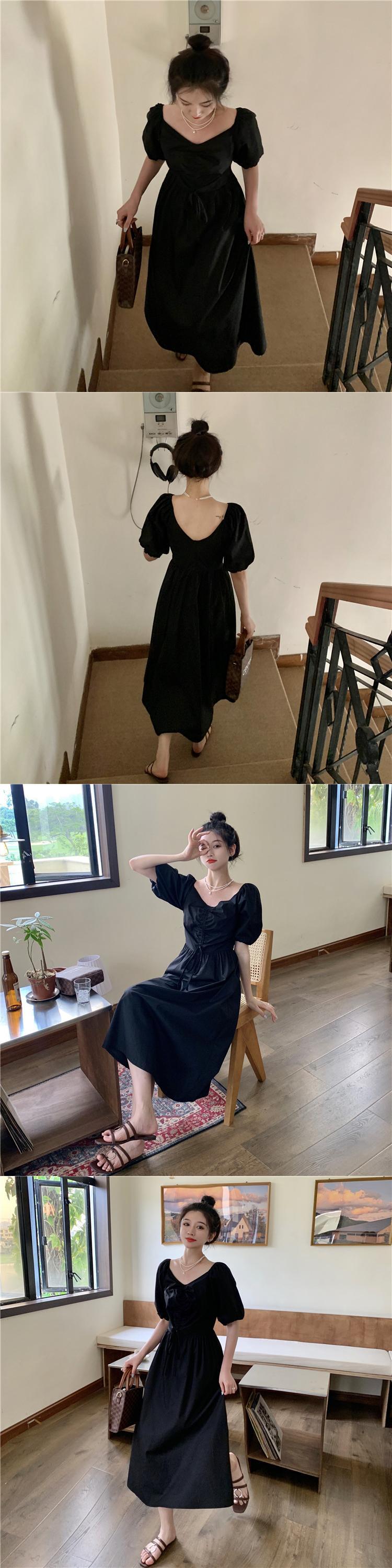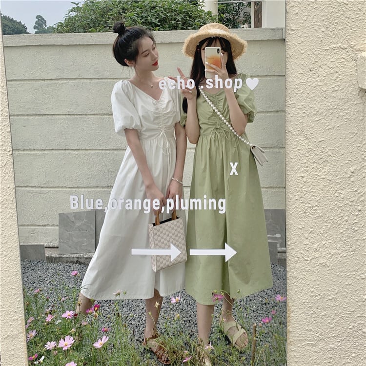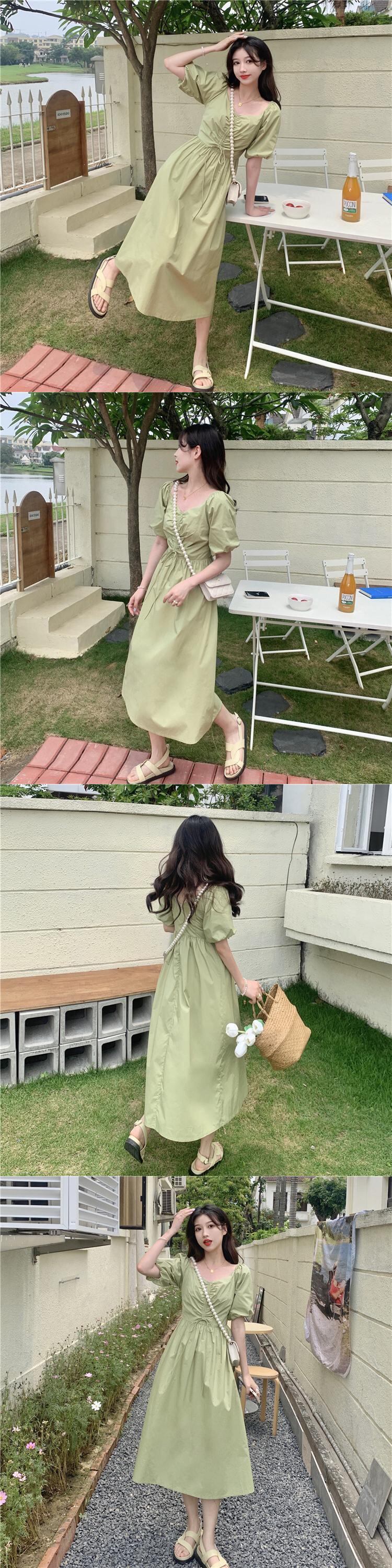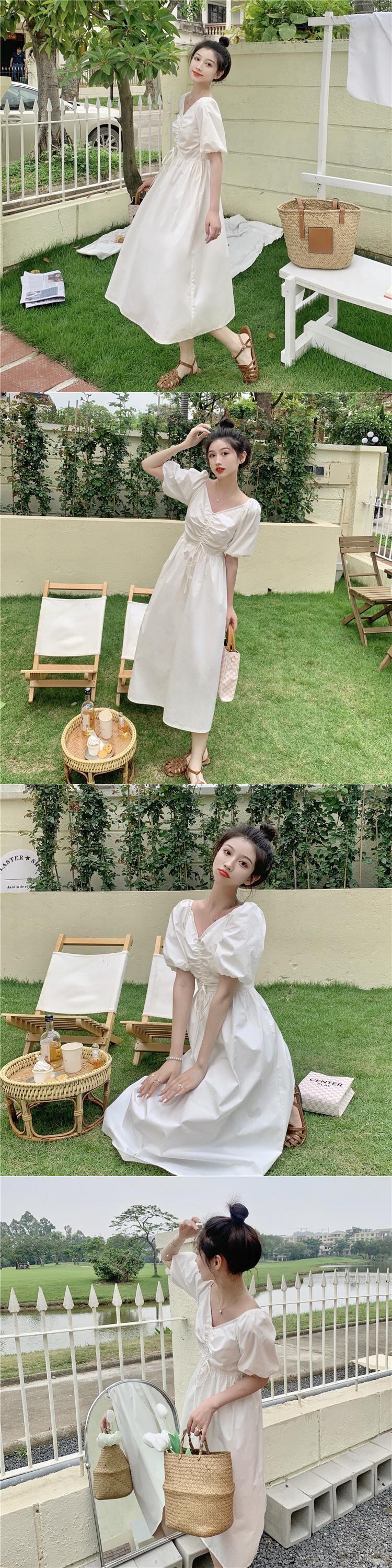 Vネックギャザープリーツウェストドレス ソリッド カラーロングスカート ソリッドカラー YY-ファッション44988384282