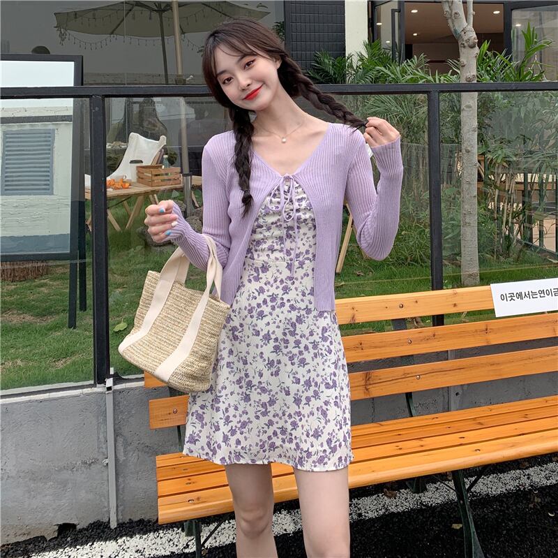 色:パープルカーディガン,黄色のカーディガン,パープルホルタードレス,黄色のサスペンダースカート