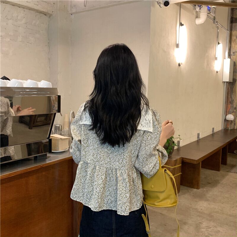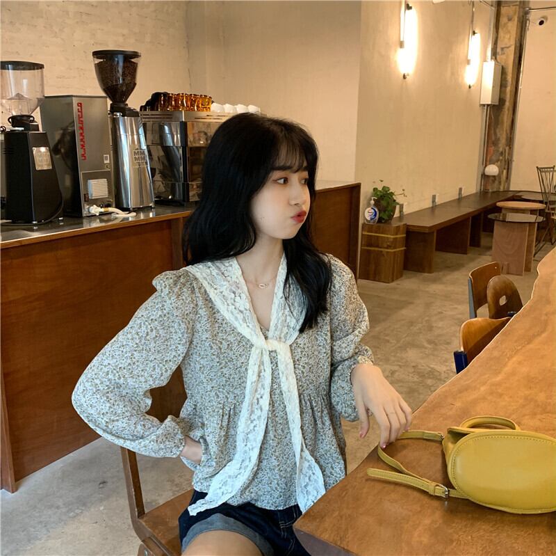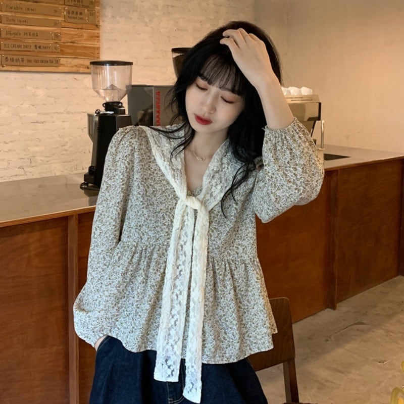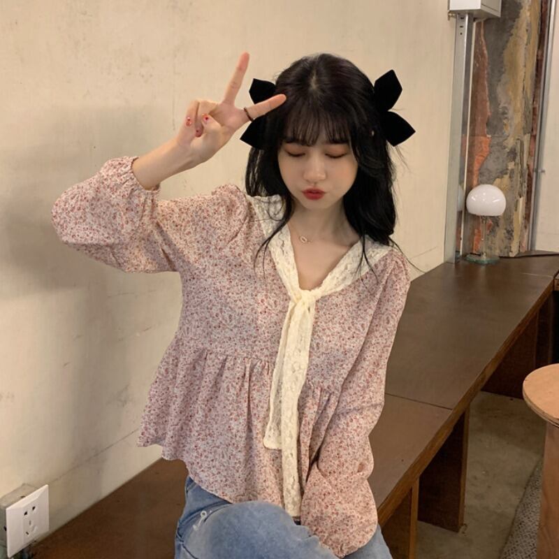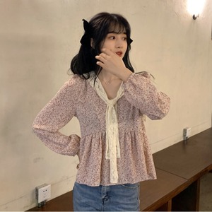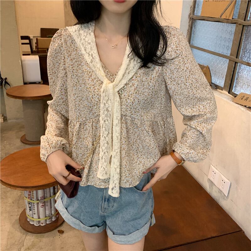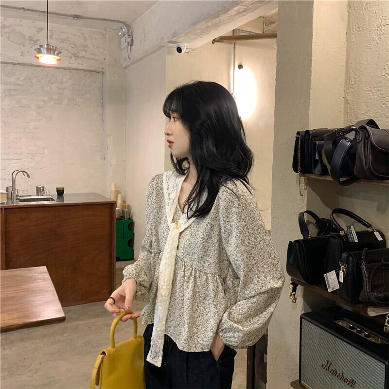 スプリングルーズVネックフローラルスタンダードシャツ レースカジュアルレディース レトロ 春物 花柄 YY-ファッション36150069580