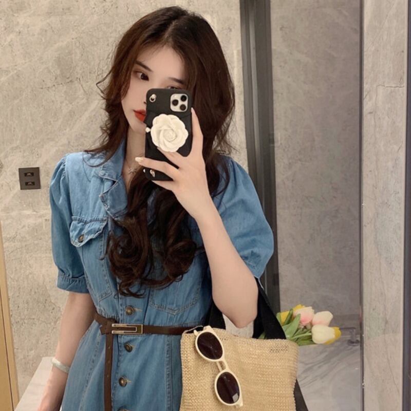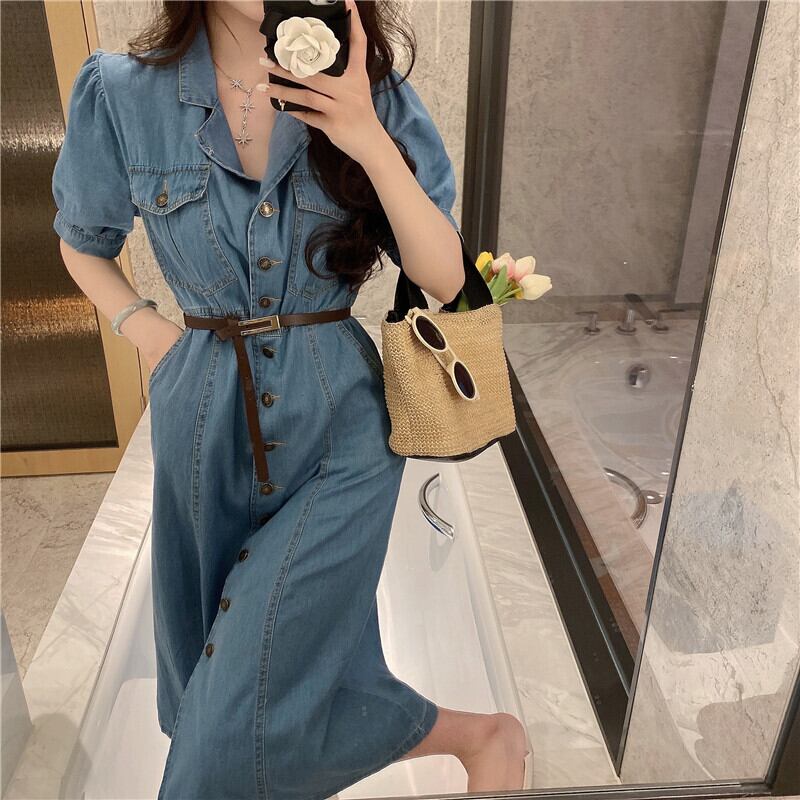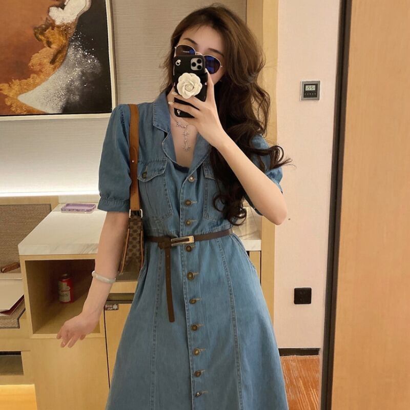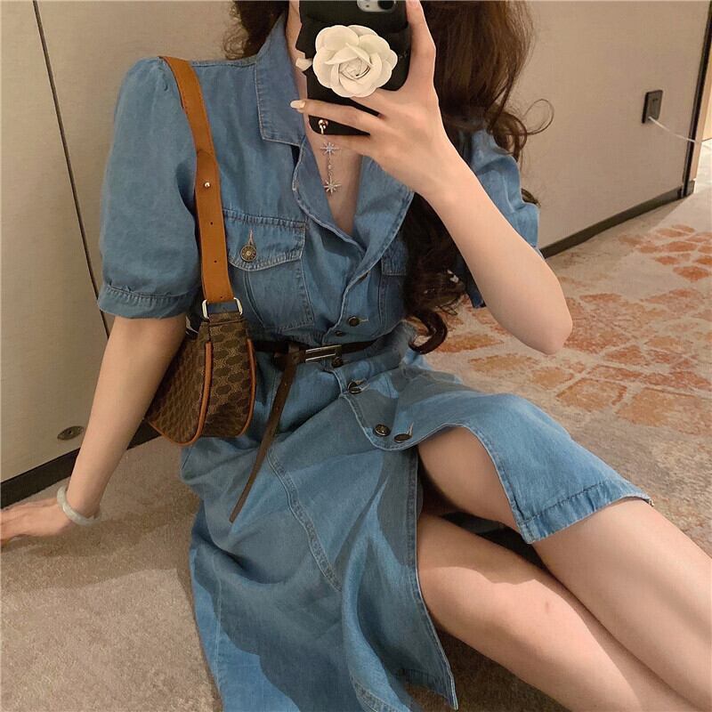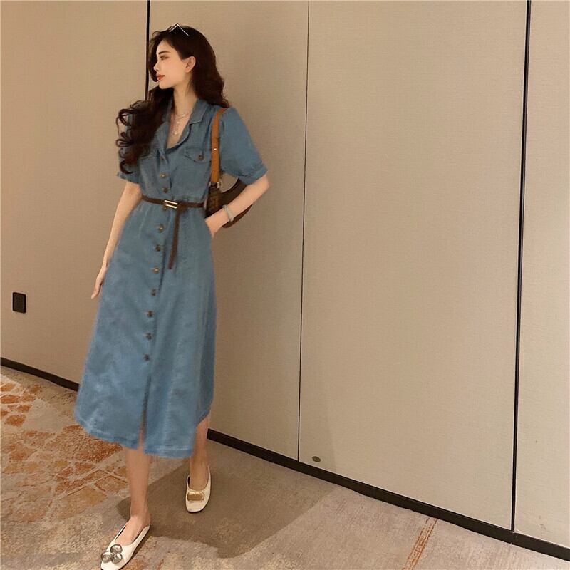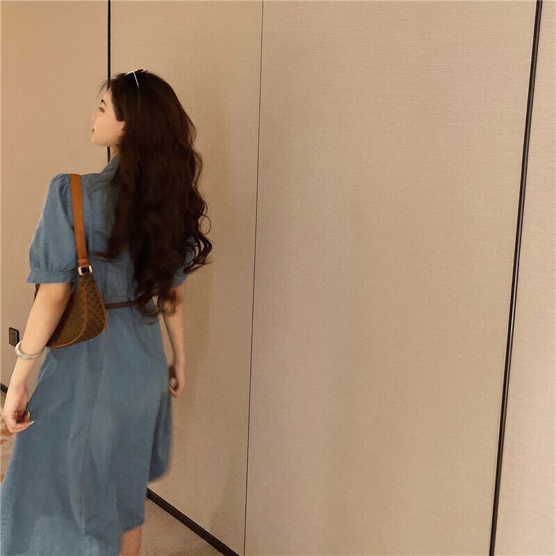 シャツ ドレス スリーブスタンダードミディスカート サマーブルー レトロ 夏物 YY-ファッション84898822063